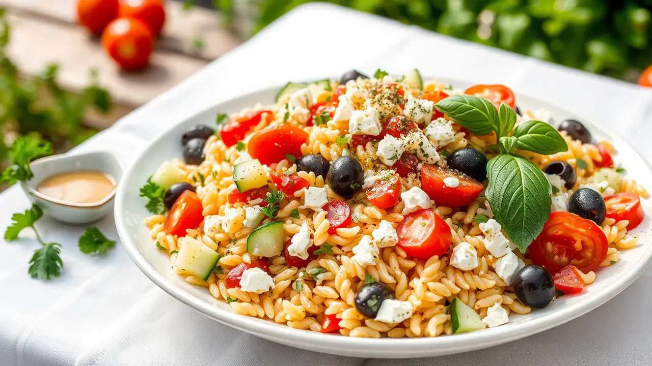 # Vibrant Mediterranean Orzo Salad 🥗🌞 This Mediterranean Orzo Salad is a colorful and refreshing dish that's perfect for picnics, potlucks, or a delightful light lunch. It's packed with fresh vegetables, briny olives, and tangy feta, all tossed in a zesty lemon-herb dressing. The orzo provides a satisfying bite, making it a wonderful, filling option that captures the essence of the Mediterranean. Pair it with grilled chicken or shrimp for a complete meal, or serve it alongside crusty bread for a casual gathering! 🍞🍗 ## Ingredients ### For the salad - 1 cup dry orzo pasta - 1 cup cherry tomatoes, halved - 1 cucumber, diced - 1/2 red onion, finely chopped - 1 cup Kalamata olives, pitted and sliced - 1 cup feta cheese, crumbled - 1/4 cup fresh parsley, chopped - 1/4 cup fresh basil leaves, torn ### For the dressing - 1/4 cup extra virgin olive oil - Juice of 1 lemon - 1 teaspoon dried oregano - 1 teaspoon garlic powder - Salt and pepper to taste ## Instructions 1. **Cook the Orzo**: In a large pot of boiling salted water, cook the orzo according to package instructions until al dente. Drain and rinse under cold water to cool. 2. **Mix the Vegetables**: In a large bowl, combine the cherry tomatoes, cucumber, red onion, Kalamata olives, and half of the feta cheese. 3. **Prepare the Dressing**: In a small bowl, whisk together the olive oil, lemon juice, oregano, garlic powder, salt, and pepper until well combined. 4. **Combine**: Add the cooled orzo to the vegetable mixture. Pour the dressing over the salad and toss gently to coat everything evenly. 5. **Finish with Herbs and Feta**: Fold in the chopped parsley, torn basil, and the remaining feta cheese. 6. **Chill & Serve**: Cover the salad and let it chill in the refrigerator for at least 30 minutes to allow the flavors to meld. Serve cold and enjoy! > 🌿 For an extra dose of flavor, marinate the olives in a splash of additional olive oil and herbs before adding them to the salad. This adds an aromatic touch that elevates the dish! ## Variations - **Protein-Packed**: Add grilled chicken, chickpeas, or shrimp for an added protein boost. 🍗🍤 - **Grain-Free**: Substitute the orzo with quinoa or cauliflower rice for a gluten-free version. 🥦🌾 - **Vegan**: Omit the feta cheese or replace it with a vegan alternative, such as tofu feta or nutritional yeast. - **Spicy Kick**: Toss in some diced jalapeños or a dash of red pepper flakes for a spicy twist! 🌶️🔥 - **Seasonal**: Swap out the vegetables based on what’s in season—zucchini, bell peppers, or artichokes can add interesting flavors! Enjoy your Mediterranean journey with this delightful orzo salad! 🎉🥗name