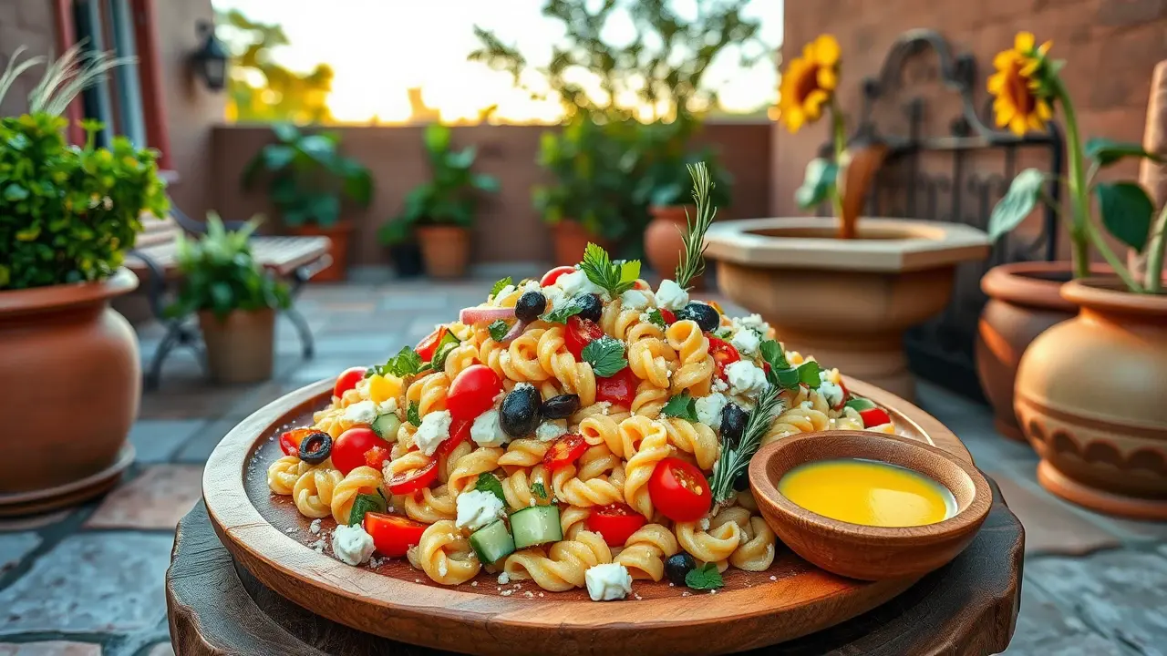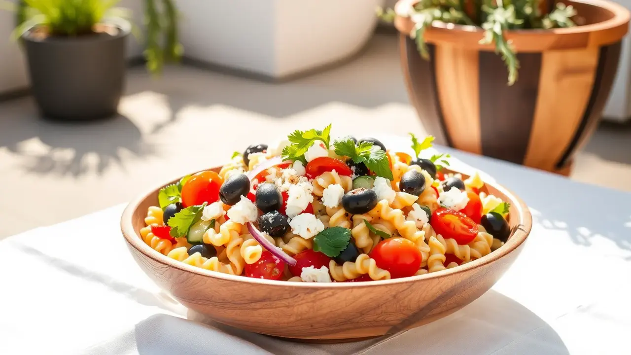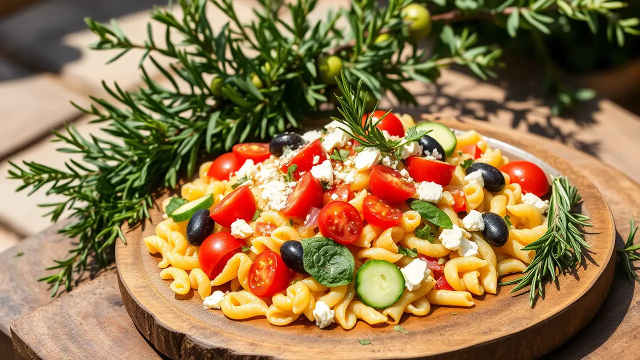 # Tangy Mediterranean Pasta Salad with Cherry Tomatoes 🍅🍝 This vibrant and refreshing pasta salad is perfect for picnics, barbecues, or a light lunch. The combination of tangy feta cheese, juicy cherry tomatoes, and zesty lemon dressing makes this dish a delightful Mediterranean treat! 🍋✨ ## Ingredients ### For the salad - 8 oz (about 2 cups) of fusilli or penne pasta - 1 pint of cherry tomatoes, halved - 1 cup of cucumber, diced - 1/2 red onion, finely chopped - 1/2 cup of Kalamata olives, pitted and sliced - 1 cup of feta cheese, crumbled - 1/4 cup of fresh parsley, chopped - 1/4 cup of fresh basil, torn ### For the dressing - 1/4 cup of extra-virgin olive oil - 2 tablespoons of red wine vinegar - Juice of 1 lemon - 1 teaspoon of Dijon mustard - 1/2 teaspoon of garlic powder - Salt and pepper to taste ## Instructions 1. Cook the pasta according to package instructions until al dente. Drain and rinse under cold water to stop the cooking process. Set aside to cool. 2. In a large mixing bowl, combine the cooled pasta, cherry tomatoes, cucumber, red onion, Kalamata olives, feta cheese, parsley, and basil. 3. In a separate bowl, whisk together all the dressing ingredients: olive oil, red wine vinegar, lemon juice, Dijon mustard, garlic powder, and season with salt and pepper to taste. > 🥗 Give the dressing a good whisk until it’s well combined. Adjust the seasoning if desired—more lemon juice for tanginess, or more olive oil for richness. 4. Pour the dressing over the pasta salad and toss gently to combine, ensuring everything is evenly coated. 5. Allow it to chill in the refrigerator for at least 30 minutes before serving, as this helps the flavors to meld together beautifully. > ⏰ If you’re short on time, it can be served immediately, but chilling makes a big difference in flavor! ## Variations - **Gluten-free**: Substitute the pasta with gluten-free pasta options available in stores. It will still taste fantastic! - **Add protein**: Mix in some grilled chicken, shrimp, or chickpeas for a heartier meal. - **Spice it up**: Add red pepper flakes for a bit of heat or throw in some roasted red peppers for extra flavor. - **Herb variations**: Swap parsley and basil for other fresh herbs like oregano or mint for a different twist. Enjoy this delicious Tangy Mediterranean Pasta Salad as a light main dish or a colorful side that will impress everyone at your table! 🌿🍽️name