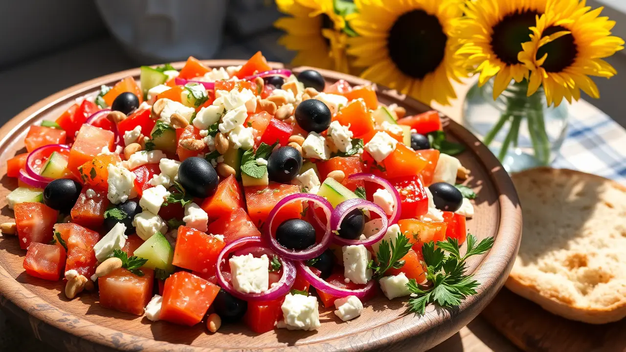 # Greek Salad (with all the trimmings!) π₯π¬π· This vibrant and flavorful Greek Salad is a colorful celebration of classic Mediterranean ingredients. Packed with fresh vegetables, tangy feta cheese, and a zesty dressing, itβs perfect for a summer picnic or as a delightful side for any meal. Add a few delicious trimmings to enhance the experience and impress your family and friends! ## Ingredients ### For the salad - 2 large ripe tomatoes, diced - 1 cucumber, peeled and diced - 1 bell pepper (red or yellow), diced - 1 red onion, thinly sliced - 1 cup Kalamata olives, pitted and halved - 1 cup feta cheese, crumbled - 1/4 cup fresh parsley, chopped - 1/4 cup fresh mint, chopped ### For the dressing - 1/4 cup extra virgin olive oil - 2 tablespoons red wine vinegar - 1 clove garlic, minced - 1 teaspoon dried oregano - Salt and pepper to taste ### Optional trimmings - 1 avocado, sliced - 1/2 cup chickpeas, drained and rinsed - 1/4 cup toasted pine nuts or walnuts - Pita bread, for serving ## Instructions 1. In a large mixing bowl, combine the diced tomatoes, cucumber, bell pepper, red onion, and Kalamata olives. 2. Sprinkle the crumbled feta cheese, chopped parsley, and mint over the vegetable mixture. > π₯ Feel free to switch up the vegetables based on your preference! Zucchini, radishes, or even a handful of mixed greens can add a nice twist. 3. In a separate bowl, whisk together the olive oil, red wine vinegar, minced garlic, oregano, salt, and pepper until well combined. 4. Pour the dressing over the salad and toss gently to coat all ingredients evenly. > π If making the salad ahead of time, keep the dressing separate until just before serving to maintain the crispness of the vegetables. 5. If using optional trimmings, gently fold in the sliced avocado and chickpeas right before serving. Top with toasted pine nuts or walnuts for an added crunch. 6. Serve the salad with warm pita bread for a complete meal. ## Variations - **Gluten-free**: This salad is naturally gluten-free, just ensure your supporting dishes are as well! - **Protein-packed**: Add grilled chicken or shrimp for a heartier option. - **Vegan**: Substitute the feta for avocado or a drizzle of tahini for a creamy element. - **Mediterranean twist**: Include a handful of sun-dried tomatoes and artichoke hearts for extra flavor! > π Enjoy this salad chilled or at room temperature, making it a versatile dish for any occasion. Perfect for gatherings, barbecues, or even a quick lunch at home!name