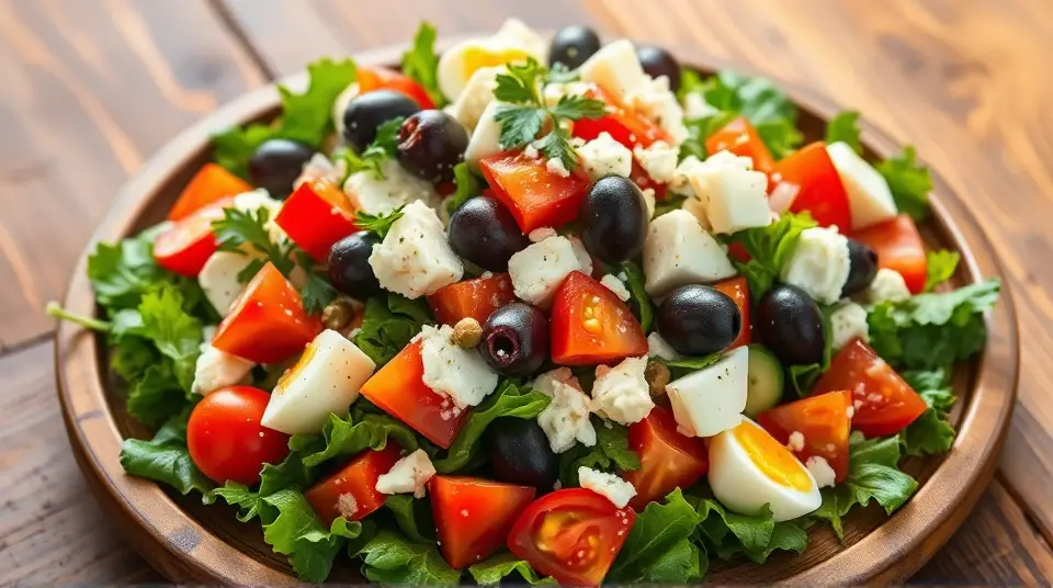 Add the chopped hard-boiled eggs, cherry tomatoes, olives, cucumber, red onion, parsley, and capers to the bowl. Gently fold the ingredients together until everything is well mixed.