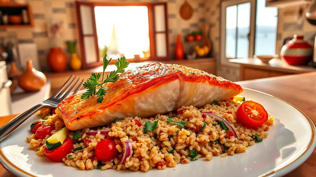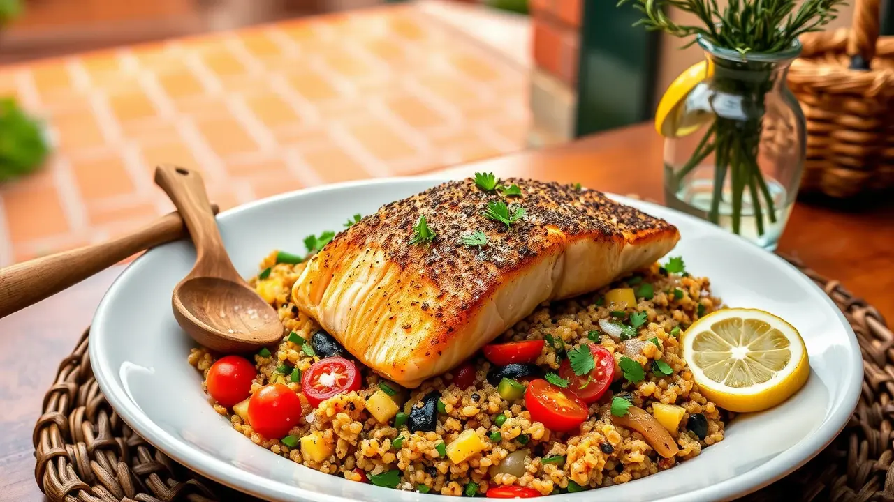 This vibrant dish brings the flavors of the Mediterranean straight to your table! The succulent salmon is enhanced by fragrant spices, while the vegetable quinoa provides a nutritious and colorful base. This recipe is not only delicious but also packed with healthy ingredients, making it a perfect weeknight dinner or special occasion feast!