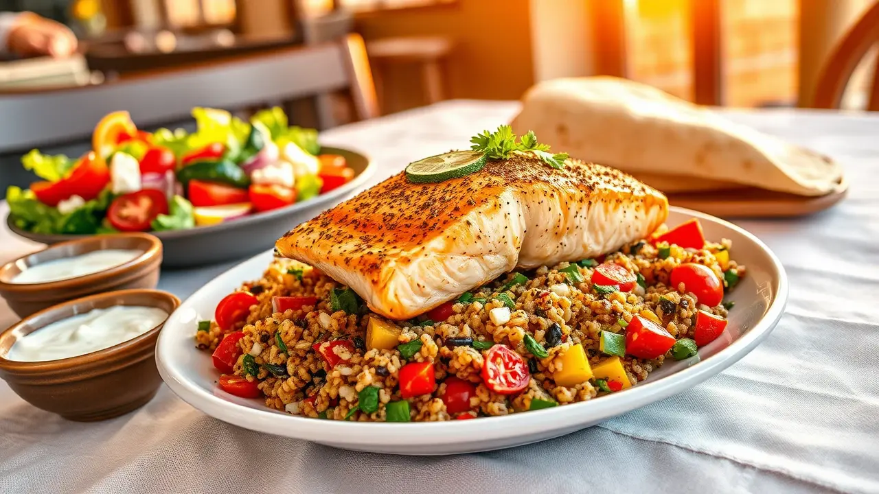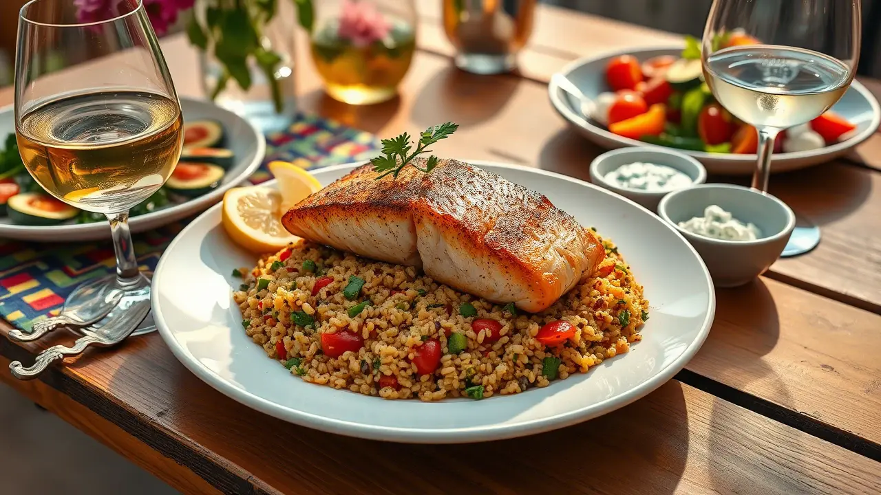 # Mediterranean Spiced Salmon with Vegetable Quinoa 🍣🍅 This vibrant dish brings the flavors of the Mediterranean straight to your table! The succulent salmon is enhanced by fragrant spices, while the vegetable quinoa provides a nutritious and colorful base. This recipe is not only delicious but also packed with healthy ingredients, making it a perfect weeknight dinner or special occasion feast! Consider pairing it with a side of tzatziki sauce and a fresh Greek salad for a full Mediterranean experience! 🥗🍋 ## Ingredients ### For the salmon - 4 salmon fillets - 2 tablespoons olive oil - 1 teaspoon paprika - 1 teaspoon ground cumin - 1 teaspoon dried oregano - 1/2 teaspoon garlic powder - 1/2 teaspoon sea salt - 1/4 teaspoon black pepper - Juice of 1 lemon ### For the vegetable quinoa - 1 cup quinoa, rinsed - 2 cups vegetable broth (or water) - 1 cup cherry tomatoes, halved - 1 bell pepper, diced (any color) - 1 zucchini, diced - 1/2 cup red onion, diced - 1/2 cup fresh parsley, chopped - 2 tablespoons olive oil - Salt and pepper to taste ## Instructions 1. **Prepare the Spiced Salmon:** - In a small bowl, mix together the olive oil, paprika, cumin, oregano, garlic powder, salt, and black pepper. - Rub this spice mixture onto the salmon fillets, ensuring they are well coated. Drizzle with lemon juice. - Let the salmon marinate for 15-20 minutes for the flavors to meld. 2. **Cook the Quinoa:** - While the salmon marinates, combine quinoa and vegetable broth (or water) in a saucepan. Bring to a boil over medium-high heat. - Once boiling, reduce the heat to low, cover, and simmer for 15-20 minutes until the quinoa is cooked and the liquid is absorbed. Fluff with a fork and set aside. 3. **Sauté the Vegetables:** - In a large skillet, heat olive oil over medium heat. Add the red onion and sauté for about 2-3 minutes until translucent. - Add the zucchini and bell pepper, cooking for another 3-4 minutes until they start to soften. - Stir in the cherry tomatoes and cook for about 2 minutes until they burst slightly and release their juices. Season with salt and pepper. 4. **Cook the Salmon:** - Preheat your grill pan or skillet over medium-high heat. Cook the salmon fillets for about 4-5 minutes on each side, depending on thickness, until cooked through and flakes easily with a fork. 5. **Combine and Serve:** - Add the cooked quinoa and chopped parsley to the sautéed vegetables, tossing gently to combine. Adjust seasoning as needed. - Serve the spiced salmon on top of the vegetable quinoa and garnish with a wedge of lemon. > 🍽️ This dish is best enjoyed fresh but can be stored in the refrigerator for up to 2 days. Reheat gently to preserve the salmon’s texture. > For an extra kick, consider adding a pinch of red pepper flakes to the vegetables! ## Variations - **Add a Twist**: Incorporate olives, feta cheese, or sun-dried tomatoes for an added layer of Mediterranean flavor! 🧀🫒 - **Whole Grains**: Substitute quinoa with farro or bulgur for a different texture and flavor profile. - **Herb Infusion**: Swap parsley for mint or basil in the vegetable quinoa for a fresh twist! - **Citrus Delight**: Experiment with different citrus juices like orange or lime for a unique flavor boost. Enjoy your Mediterranean culinary adventure! 🌊🌿name