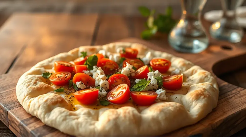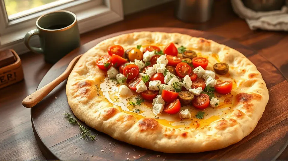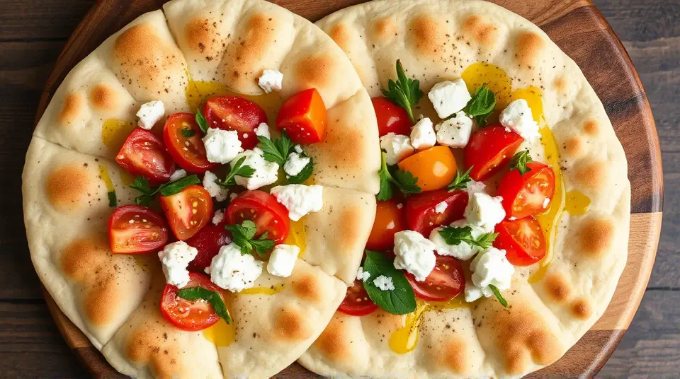 # Light Mediterranean Flatbread with Peperoncini 🌿🍞 This delightful flatbread recipe is inspired by the refreshing flavors of the Mediterranean. It combines the zesty kick of peperoncini with a light and fluffy base, making it a perfect companion for dips, spreads, or as a base for your favorite toppings. It's an easy yet impressive dish that will elevate any gathering or get-together! ## Ingredients ### For the flatbread - 1 ½ cups all-purpose flour (plus extra for dusting) - 1 teaspoon baking powder - ½ teaspoon salt - ½ cup Greek yogurt (preferably non-fat) - 1 tablespoon olive oil - 3 tablespoons warm water (as needed) ### For the topping - ½ cup sliced peperoncini (jarred) - ½ cup crumbled feta cheese - ¼ cup cherry tomatoes, halved - 1 tablespoon fresh oregano, chopped (or 1 teaspoon dried oregano) - 1 tablespoon fresh parsley, chopped - A drizzle of olive oil for finishing - Pinch of black pepper and sea salt to taste ## Instructions 1. **Make the flatbread dough**: - In a large mixing bowl, combine the flour, baking powder, and salt. - Add the Greek yogurt and olive oil. Mix until a rough dough forms. - Gradually add warm water, kneading gently until the dough is soft and smooth (about 5 minutes). Avoid adding too much water to keep the flatbread light. > 🍞 If the dough is too sticky, sprinkle a little extra flour while kneading. If it’s too dry, add a few drops of warm water. 2. **Let the dough rest**: - Cover the dough with a damp cloth or plastic wrap and let it rest for at least 30 minutes. This allows the gluten to relax, resulting in a more tender flatbread. 3. **Roll out the dough**: - Preheat your skillet or grill over medium heat. - Divide the dough into four equal pieces. Roll each piece into a circle about ¼-inch thick, dusting with flour to prevent sticking. 4. **Cook the flatbread**: - Place the rolled-out dough onto the hot skillet or grill. Cook for 2-3 minutes on each side until golden brown and puffed up. Repeat with the remaining dough. 5. **Prepare the topping**: - In a bowl, mix the sliced peperoncini, crumbled feta, halved cherry tomatoes, oregano, and parsley. Drizzle with olive oil and season with black pepper and sea salt to taste. 6. **Assemble and serve**: - Once the flatbreads are cooked, place them on a serving platter. Top with the peperoncini mixture and another drizzle of olive oil. Serve warm and enjoy! > 🌟 These flatbreads can be enjoyed on their own or alongside your favorite dips like hummus or tzatziki for a complete Mediterranean experience. ## Variations - **Gluten-free**: Replace all-purpose flour with a gluten-free flour blend. You might need to adjust the amount of water based on the blend used. - **Spicy twist**: Add red pepper flakes or finely chopped fresh chili to the dough for an extra kick. - **Herbed flatbread**: Mix in dried herbs like thyme or rosemary into the dough for added flavor. - **Stuffed flatbread**: Before cooking, spoon some of the topping mixture onto one half of the flatbread, fold it over, and cook as directed for a delicious stuffed version. Enjoy your culinary adventure into the Mediterranean with this vibrant flatbread! 😍🌍name