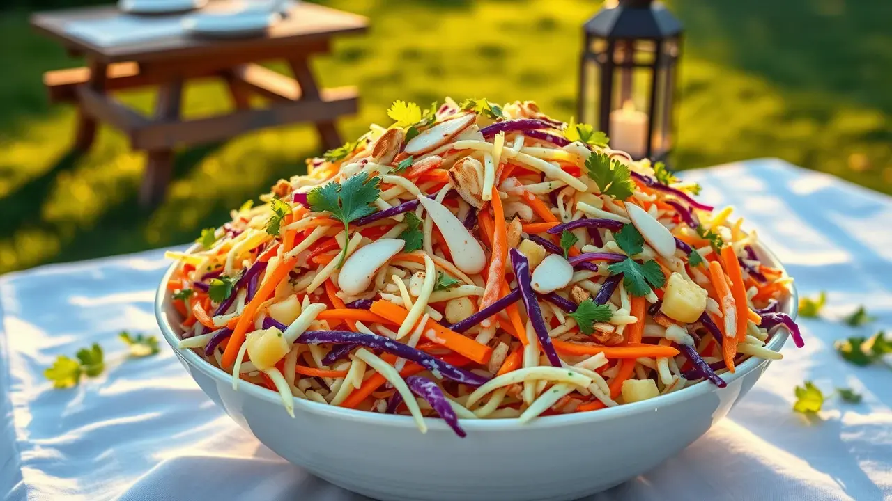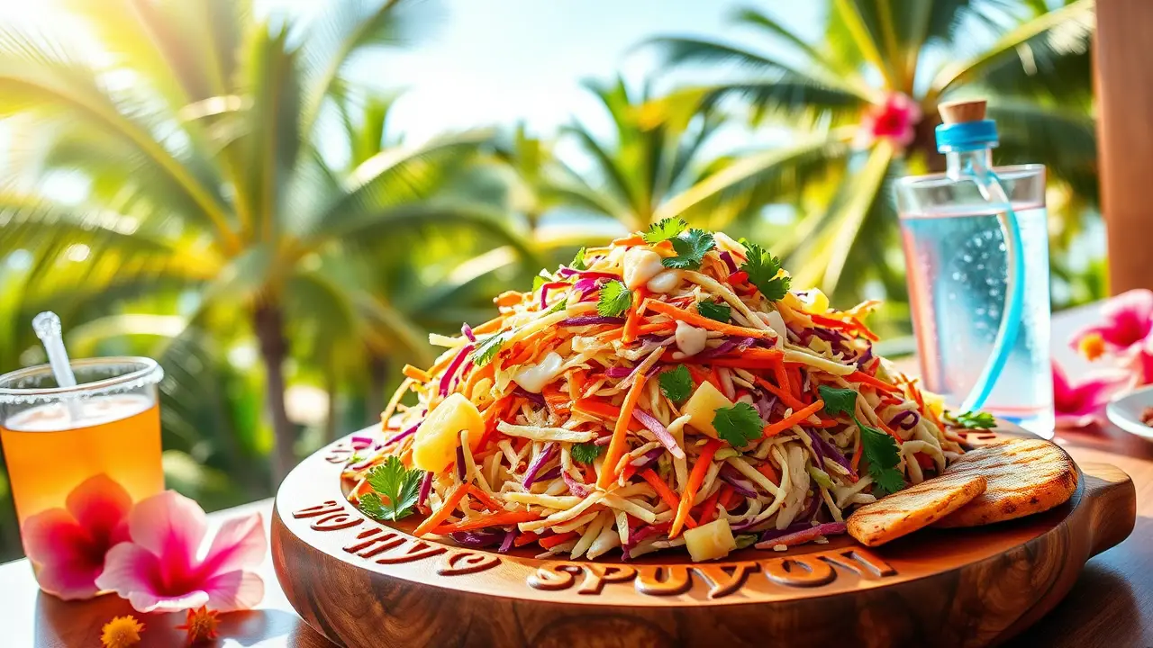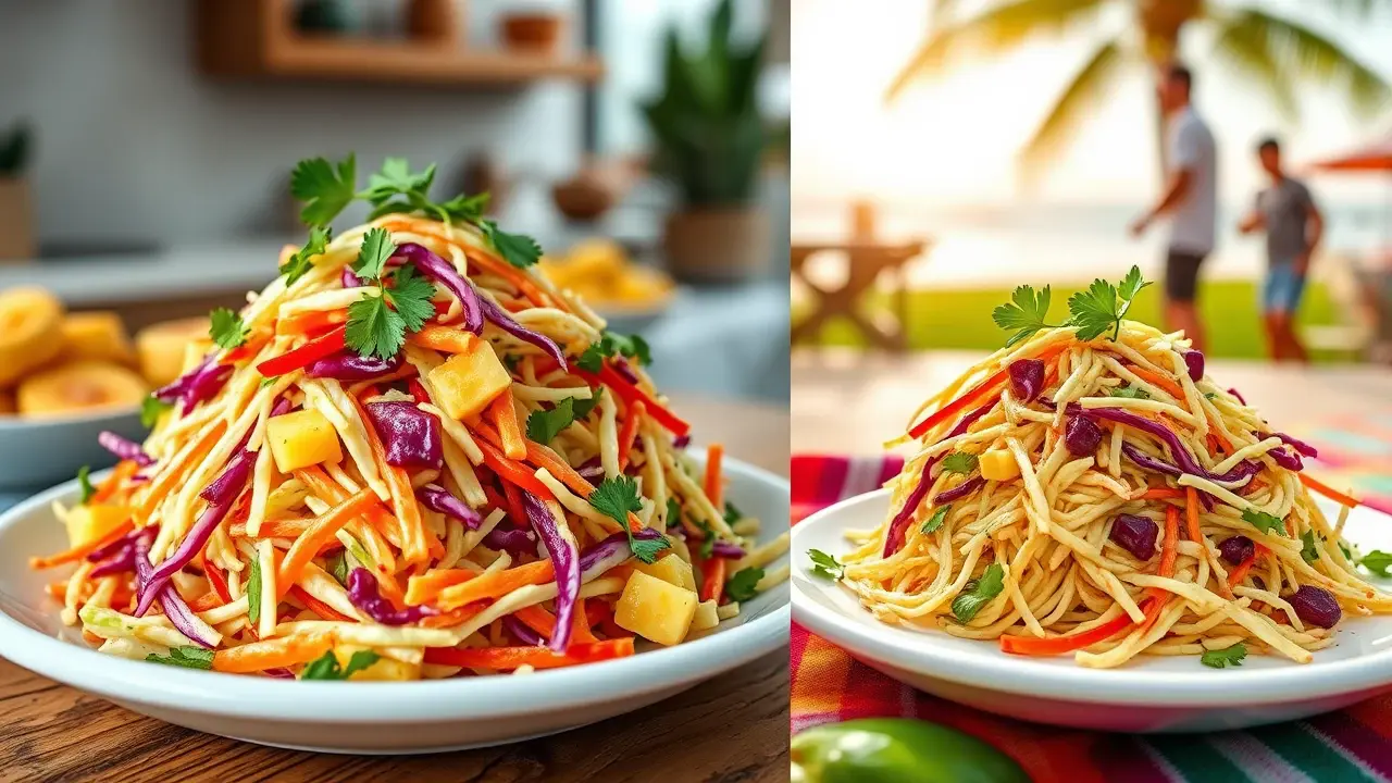 # Tropical Pineapple Coleslaw 🌴🍍 This delightful and refreshing Pineapple Coleslaw is the perfect accompaniment for summer picnics, barbecues, or simply enjoying a light meal. With the sweetness of pineapple combined with the crunch of cabbage, this coleslaw offers a tropical twist on a classic dish. The creamy, tangy dressing ties everything together beautifully! ## Ingredients ### For the coleslaw - 4 cups green cabbage, finely shredded - 1 cup purple cabbage, finely shredded - 1 cup carrots, grated - 1 cup fresh pineapple, diced (or canned pineapple, well-drained) - 1/2 cup red bell pepper, diced - 1/4 cup fresh cilantro, chopped (optional, for added flavor) ### For the dressing - 1/2 cup mayonnaise - 1/4 cup Greek yogurt (or sour cream) - 2 tablespoons apple cider vinegar - 2 tablespoons honey (or maple syrup for a vegan option) - 1 teaspoon Dijon mustard - Salt and pepper to taste ## Instructions 1. In a large mixing bowl, combine the shredded green cabbage, purple cabbage, grated carrots, diced pineapple, and diced red bell pepper. 2. In a separate bowl, whisk together the mayonnaise, Greek yogurt, apple cider vinegar, honey, Dijon mustard, salt, and pepper until smooth. 3. Pour the dressing over the cabbage and pineapple mixture. Gently toss until everything is evenly coated. > 🥗 For best results, let the coleslaw chill in the refrigerator for at least 30 minutes before serving. This allows the flavors to meld and the coleslaw to get extra crispy. 4. Before serving, give it a final toss and sprinkle with fresh cilantro for a pop of color and flavor. ## Variations - **Spicy**: Add a diced jalapeño or a pinch of cayenne pepper to the dressing for a spicy kick! 🌶️ - **Fruit-Forward**: Swap out some of the pineapple for other tropical fruits like mango or diced kiwi for additional flavor. - **Nutty Crunch**: Add a handful of toasted almonds or sunflower seeds for a delightful crunch and added nutrition. - **Vegan**: Use dairy-free yogurt and a plant-based mayonnaise for a delicious vegan-friendly option. ## Pairing Suggestions This Pineapple Coleslaw pairs perfectly with grilled chicken, fish tacos, or pulled pork sandwiches. It's also a tasty topping for burgers or served alongside rice dishes for a refreshing contrast. Enjoy the tropical vibes! 🍽️🌺name