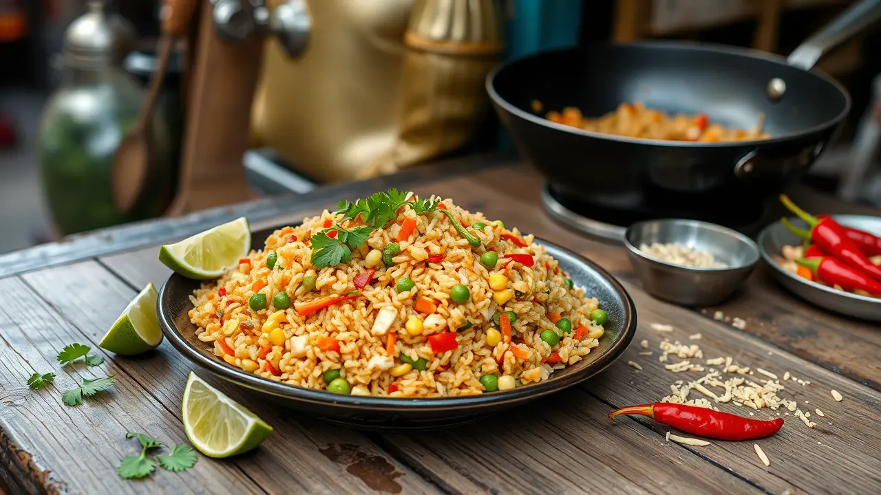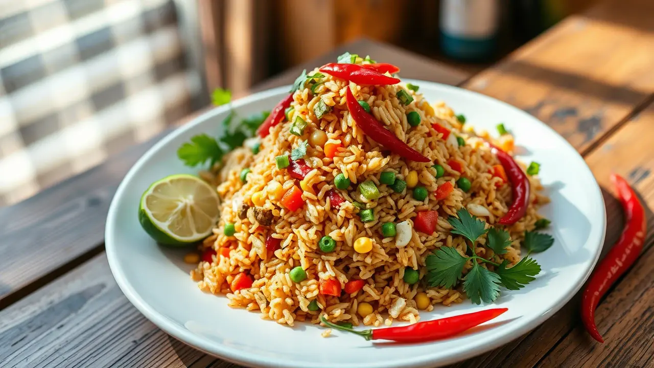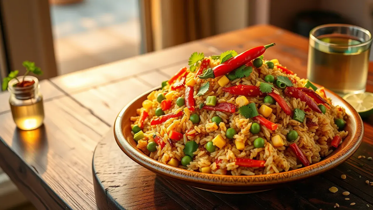 # Spicy Veggie Delight Fried Rice 🍚🌶️ This vibrant and flavorful vegetable fried rice is a quick and satisfying meal that’s perfect for a weeknight dinner or meal prep. Packed with fresh veggies and a hint of spice, it’s not only delicious but also versatile enough to customize with your favorite ingredients. Enjoy it on its own or as a side dish to your favorite Asian-inspired meals! ## Ingredients ### For the fried rice - 2 cups cooked jasmine rice (preferably day-old) - 1 tablespoon vegetable oil (or sesame oil for extra flavor) - 1 cup mixed vegetables (carrots, peas, bell peppers, corn) - 1 small onion, finely chopped - 2 cloves garlic, minced - 1-inch piece ginger, grated - 2 tablespoons soy sauce - 1 tablespoon oyster sauce (or a vegan alternative) - 1 teaspoon chili paste (adjust to taste) - 2 green onions, chopped - Salt and pepper to taste - Optional: 2 eggs, beaten (or tofu scramble for a vegan option) ### For garnish - Fresh cilantro, chopped - Lime wedges - Sliced red chili for heat ## Instructions - Heat the vegetable oil in a large skillet or wok over medium-high heat. Add the chopped onion and sauté until translucent, about 3-4 minutes. > 🔥 Make sure your pan is hot enough to avoid the vegetables steaming rather than frying. This adds a lovely char to the rice! - Add the minced garlic and grated ginger, and cook for another minute until fragrant. - Toss in the mixed vegetables and stir-fry for about 3-5 minutes until they’re tender yet vibrant. If you're using any proteins like chicken or shrimp, add them at this stage. - Push the veggies to the side of the pan and pour in the beaten eggs. Scramble them gently until cooked, then mix them with the vegetables. - Introduce the cooked rice into the pan, breaking up any clumps. Drizzle the soy sauce, oyster sauce, and chili paste over the rice, and stir everything together until well mixed. > 🍚 The key to perfect fried rice is using cold, day-old rice, as it helps prevent mushiness and allows each grain to fry properly. - Season with salt, pepper, and additional chili paste if you like it spicier. Stir in the chopped green onions right before serving. - Transfer the fried rice to a serving dish, garnish with fresh cilantro, and serve with lime wedges and sliced red chili on the side for an extra kick! ## Variations - **Add protein**: Include diced chicken, beef, or shrimp for more substance. For a vegetarian option, add tofu or tempeh. - **Spice it up**: Mix in a splash of sriracha or more chili paste if you love heat! 🌶️ - **Change it up**: Substitute basmati or brown rice for a different texture and flavor. - **Herbaceous twist**: Toss in a handful of fresh basil or mint for a refreshing touch! - **Low carb**: Use cauliflower rice instead of jasmine rice for a lighter, veggie-packed version. Enjoy your Spicy Veggie Delight Fried Rice, a colorful and wholesome feast that delights the taste buds! 🥢✨name
