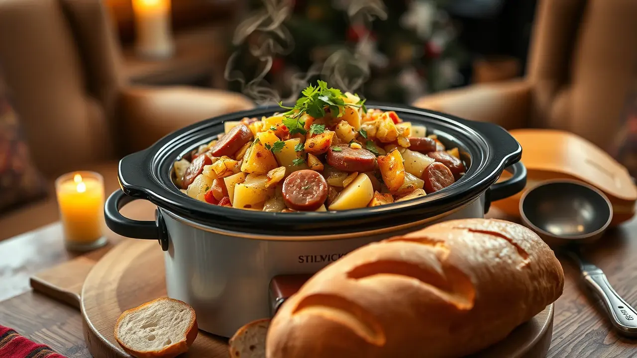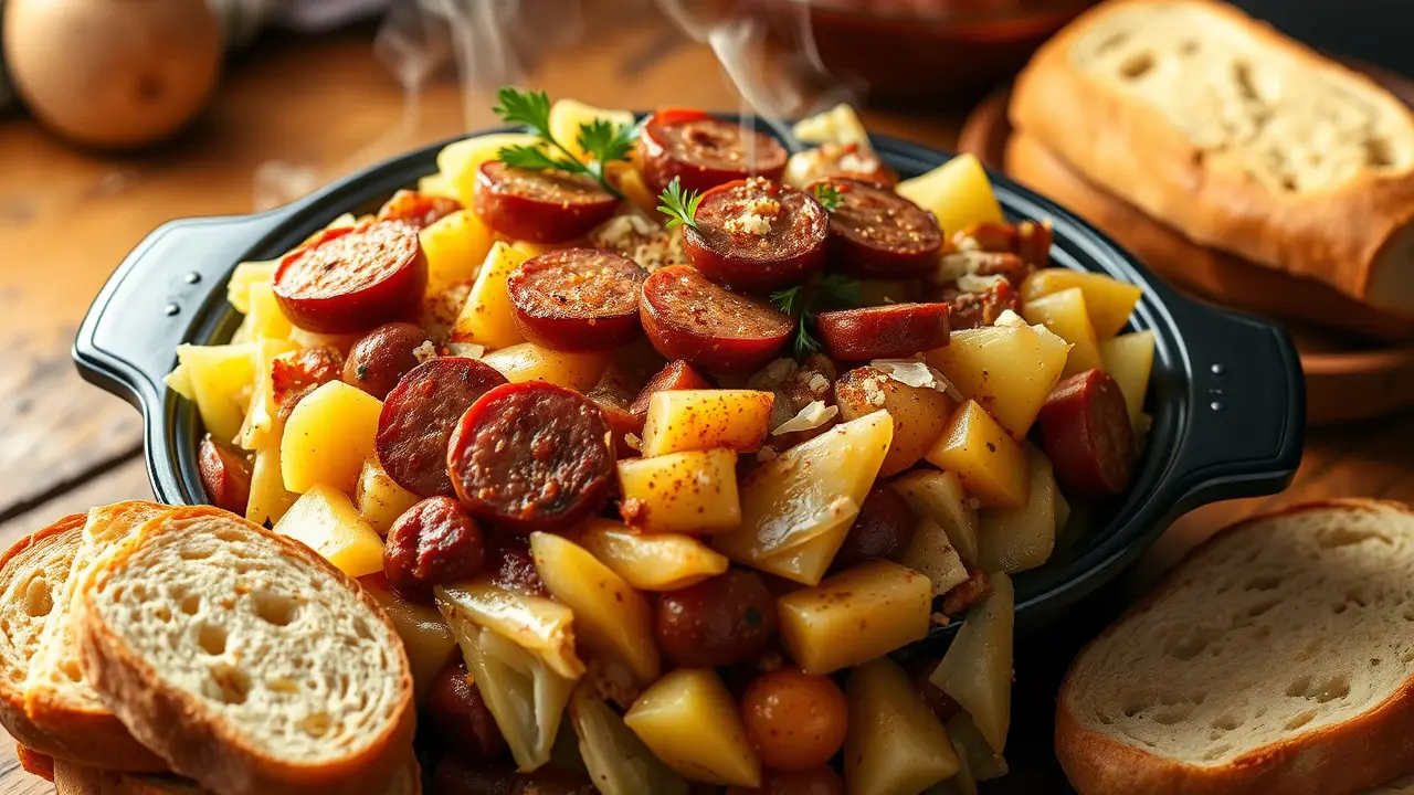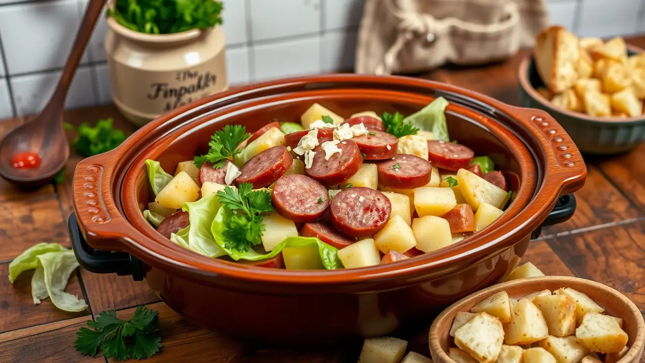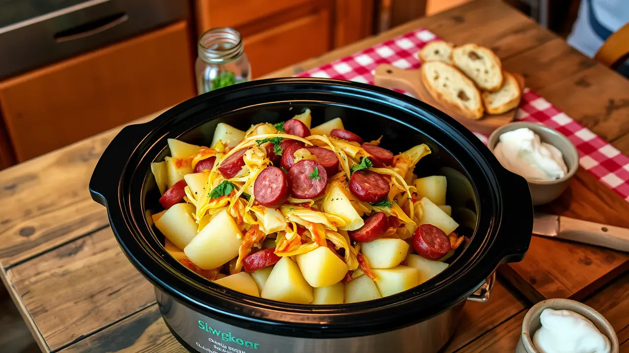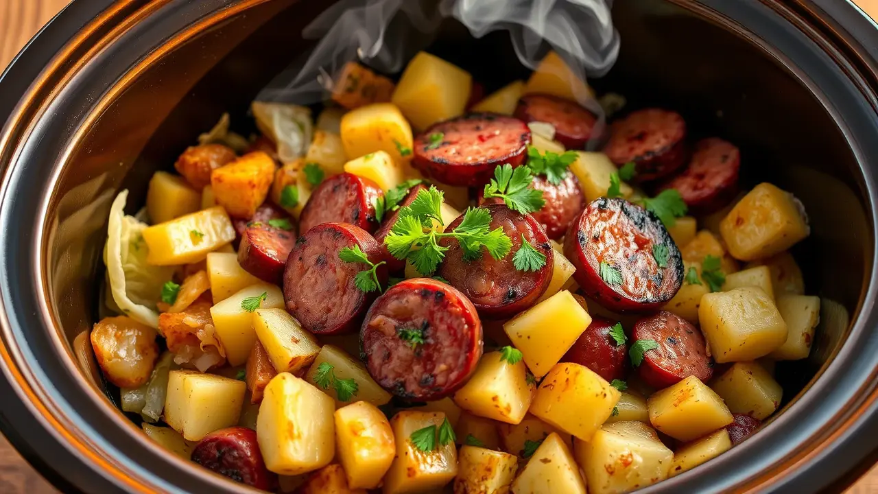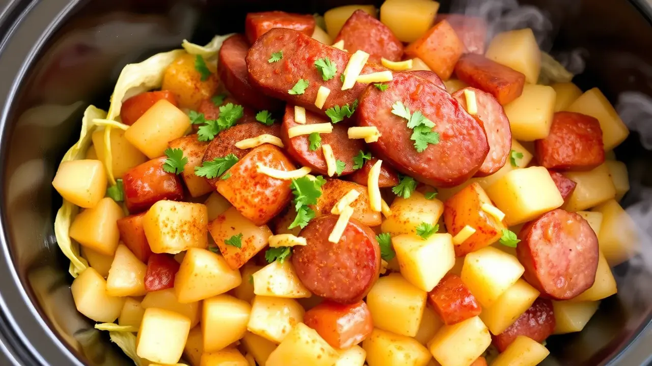 # Easy Slow Cooker Cabbage, Potatoes, and Smoked Sausage 🌿🥔🌭 This hearty dish is the perfect comfort food for cold days or when you need a simple, filling meal. Slow-cooked to perfection, the flavors of cabbage, potatoes, and smoked sausage meld beautifully, making it a favorite for busy weeknights or cozy gatherings. Enjoy this tasty arrangement with a side of bread to soak up all the delicious juices! 🍞 ## Ingredients ### For the main dish - 1 medium head of green cabbage, chopped - 4 medium potatoes, peeled and diced - 1 pound of smoked sausage (such as kielbasa), sliced into rounds - 1 large onion, chopped - 3 cloves of garlic, minced - 1 cup of chicken broth - 1 tablespoon of olive oil - 1 teaspoon of paprika - 1 teaspoon of dried thyme - Salt and pepper to taste ### Optional toppings - Fresh parsley, chopped - Shredded cheese - Hot sauce, for a kick ## Instructions - Heat the olive oil in a skillet over medium heat. Add the sausage slices and cook until browned, about 5 minutes. Remove from heat and set aside. > 🍳 Browning the sausage first adds depth to the flavor, but you can skip this step if you're short on time. Just add it directly to the slow cooker. - In your slow cooker, layer the chopped cabbage, diced potatoes, onion, and garlic. Spread the cooked sausage on top. - Sprinkle the paprika, thyme, salt, and pepper over the layers. Pour the chicken broth evenly across the top. - Cover and cook on low for 6-8 hours, or on high for 3-4 hours until the vegetables are tender. > ⏲️ If you find you like a bit of texture in your potatoes, check them for doneness after 2.5 hours on high or 5 hours on low. ## Variations - **Vegetarian**: Substitute the sausage for vegetarian sausage or add more hearty vegetables like bell peppers and carrots. Use vegetable broth instead of chicken broth. - **Spicy**: Add sliced jalapeños or crushed red pepper flakes for a bit of heat in the dish! - **Herbaceous**: Toss in a bay leaf, or some fresh dill or rosemary for an extra layer of flavor. - **Creamy**: Whisk in a splash of heavy cream or sour cream at the end of the cooking time for a richer sauce. - **High altitude**: Increase the cooking time by an hour for both settings, as slow cookers may struggle to reach temperature at higher altitudes. Enjoy this cozy meal with family and friends, knowing it’s packed with flavor and nutrition! 🌟name