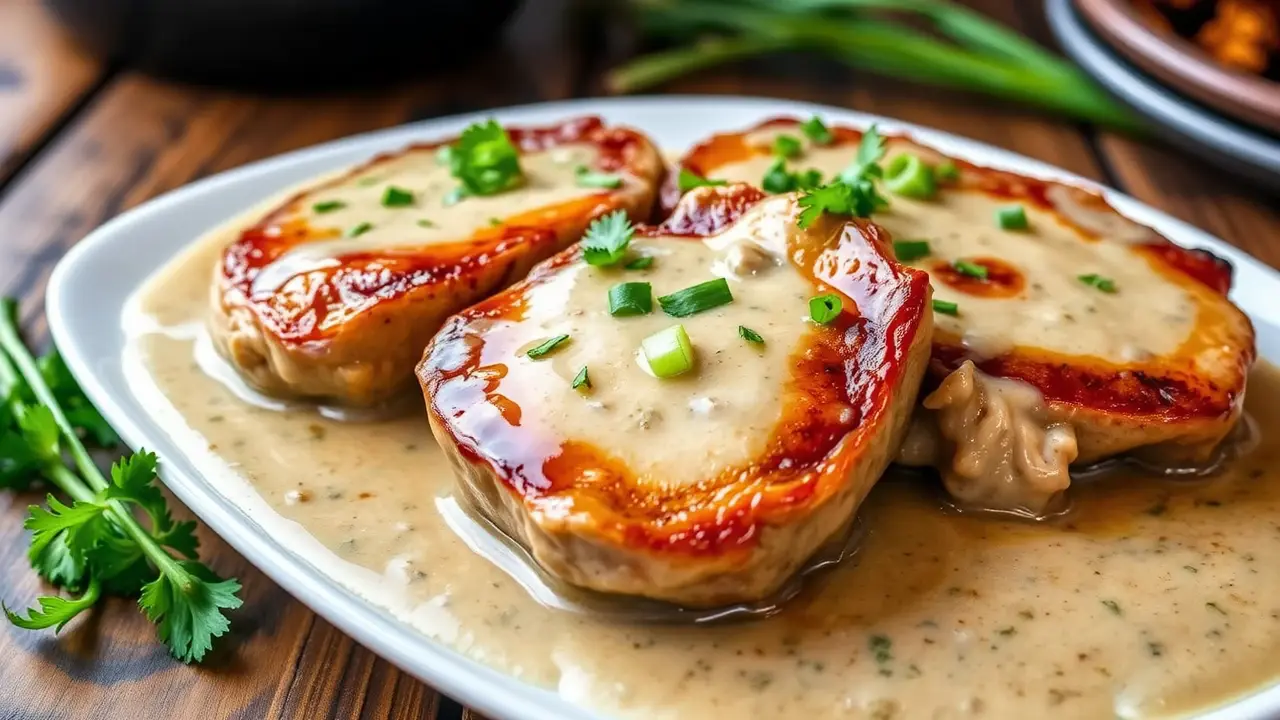 - Serve: Once done, scoop the sauce over the pork chops and garnish with fresh parsley and sliced green onions for a pop of color and flavor.