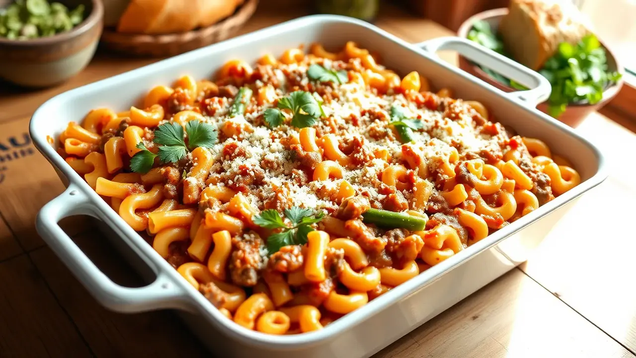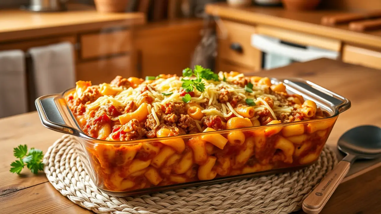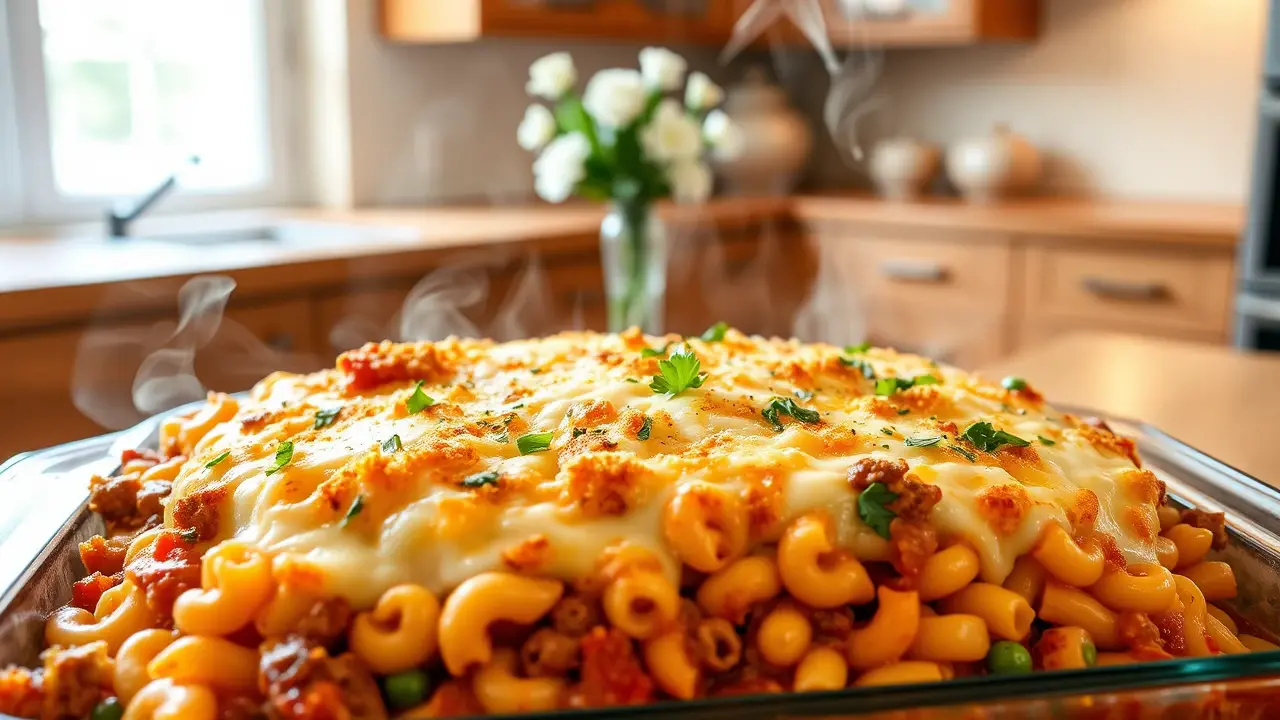 # Comforting Homemade Macaroni Beef Casserole 🍝🥩 This hearty and delicious macaroni beef casserole combines tender pasta with a richly flavored beef sauce, topped with gooey cheese. It's the ultimate comfort food that's perfect for family dinners or any occasion where you need a filling meal. This dish can easily be made ahead of time and baked straight from the fridge for a quick weeknight dinner. Pair it with a side salad or some garlic bread to complete your comforting feast! 🥗🍞 ## Ingredients ### For the casserole - 2 cups elbow macaroni - 1 pound ground beef - 1 small onion, diced - 2 cloves garlic, minced - 1 can (15 oz) tomato sauce - 1 can (14.5 oz) diced tomatoes (with Italian herbs if you prefer) - 1 tablespoon Worcestershire sauce - 1 teaspoon Italian seasoning - Salt and pepper to taste - 1 cup frozen peas (optional) - 1 cup shredded cheddar cheese (plus extra for topping) ### For the topping - 1 cup shredded mozzarella cheese - 1/2 cup breadcrumbs (optional for a crispy topping) - Fresh parsley, chopped (for garnish) ## Instructions 1. Preheat your oven to 350°F (175°C). 2. Cook the elbow macaroni according to package instructions until al dente. Drain and set aside. 3. In a large skillet over medium heat, cook the ground beef with the diced onion until browned. Make sure to break the meat apart as it cooks. Drain excess grease if needed. 4. Add the minced garlic to the skillet and sauté for another minute until fragrant. 5. Stir in the tomato sauce, diced tomatoes, Worcestershire sauce, Italian seasoning, salt, and pepper. If you’re using peas, add them now too. Let the mixture simmer for about 10 minutes, allowing the flavors to meld. > 🍽️ Feel free to mix in some chopped bell peppers or mushrooms for added flavor and nutrition! 6. Combine the cooked macaroni with the beef sauce and add in the cup of cheddar cheese. Stir until well combined. 7. Pour the mixture into a greased 9x13 inch baking dish. Sprinkle the top generously with mozzarella cheese and, if using, the breadcrumbs for a crispy topping. 8. Cover the dish with aluminum foil and bake for 20 minutes. Remove the foil and bake for an additional 10 minutes, or until the cheese is bubbly and golden brown. 9. Let it cool for a few minutes, then garnish with chopped parsley before serving. > 🥄 If you prefer a spicier dish, consider adding a dash of red pepper flakes or some chopped jalapeños to the beef sauce! ## Variations - **Gluten-free**: Substitute elbow macaroni with gluten-free pasta. Adjust cooking times according to the package instructions. - **Vegetarian**: Replace the ground beef with lentils, tempeh, or your favorite vegetables (like zucchini and bell peppers) for a meatless version. - **Buffalo Chicken**: Swap ground beef for shredded chicken mixed with buffalo sauce and ranch dressing for a zingy twist! Serve up a warm dish of this Homemade Macaroni Beef Casserole and enjoy the cozy, comforting flavors that will have everyone coming back for seconds! 🍽️❤️name