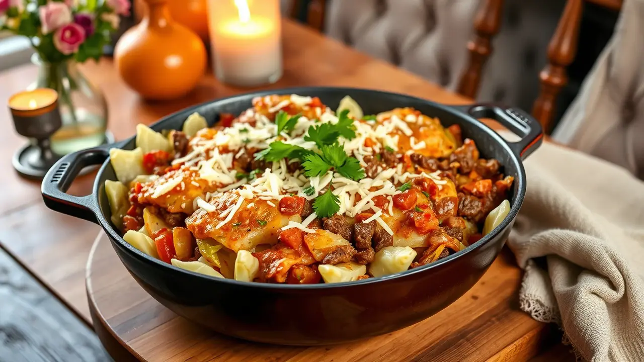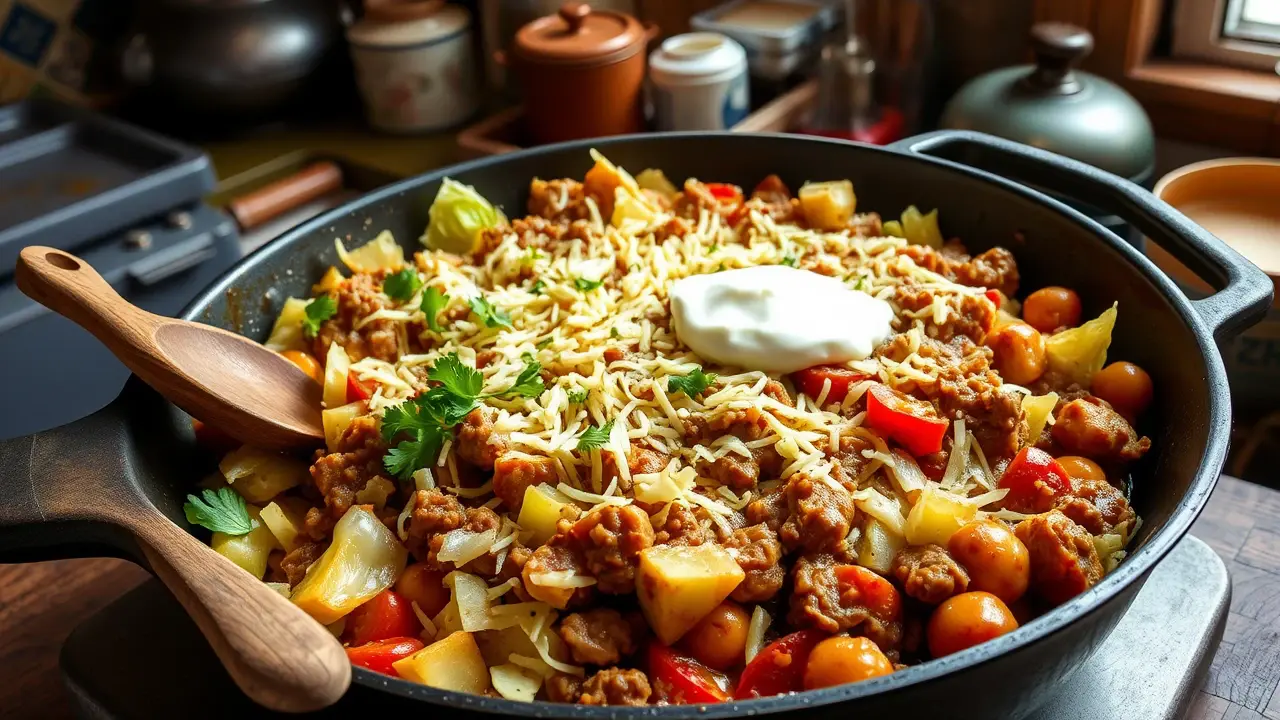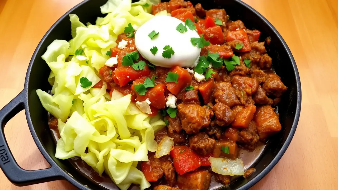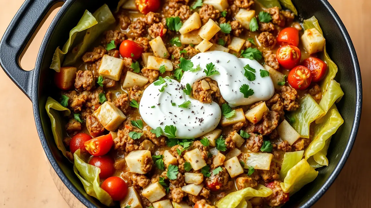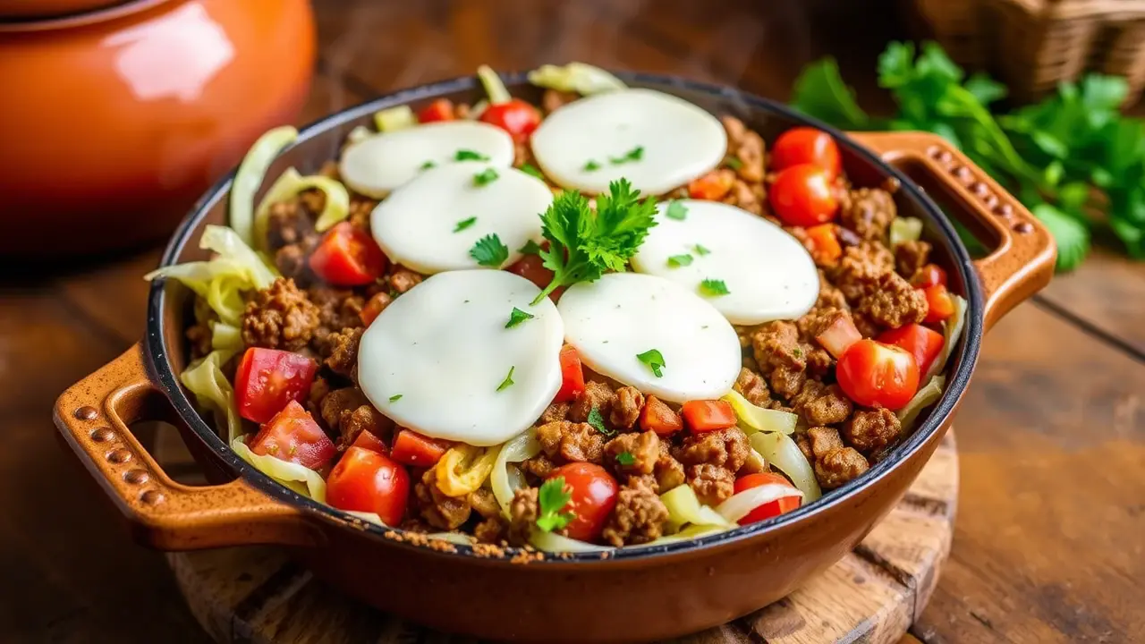 # Low Carb Cabbage Roll Skillet 🍲🥬 This hearty Low Carb Cabbage Roll Skillet is a flavorful and satisfying one-pan dish that captures all the classic flavors of traditional cabbage rolls without the carbs! It's quick to prepare, making it perfect for weeknight dinners, and it's packed with protein and veggies. This dish is not only low in carbs but also high in flavor, making it a perfect fit for anyone looking to maintain a healthier lifestyle without sacrificing taste! Pair it with a dollop of sour cream or a sprinkle of fresh parsley for an extra touch! 🌿💚 ## Ingredients ### For the skillet - 1 medium head of green cabbage, chopped - 1 pound of ground beef (or turkey for a lighter option) - 1 medium onion, diced - 2 cloves garlic, minced - 1 can (14.5 oz) diced tomatoes (with juice) - 1 cup chicken or beef broth - 1 teaspoon dried oregano - 1 teaspoon smoked paprika - 1/2 teaspoon salt - 1/2 teaspoon black pepper - 1 cup shredded mozzarella cheese (optional) ### For garnishing - Fresh parsley, chopped - Sour cream (optional) ## Instructions 1. **Prepare the skillet**: In a large skillet over medium heat, add a splash of olive oil and sauté the diced onions until they are translucent, about 3-4 minutes. 2. **Cook the meat**: Add the ground beef (or turkey) to the skillet and cook until browned, breaking it up into small pieces as it cooks. Drain any excess fat. > 🍳 For added flavor, season the meat while it cooks with salt, pepper, and smoked paprika. 3. **Add garlic and cabbage**: Stir in the minced garlic and chopped cabbage. Cook for about 5 minutes, until the cabbage is slightly wilted. 4. **Mix the sauces**: Pour in the diced tomatoes (with juice), the broth, and sprinkle the oregano over the mixture. Stir everything together to combine. 5. **Simmer**: Bring the skillet to a gentle simmer, cover with a lid, and let it cook for about 15-20 minutes, or until the cabbage is tender and the flavors meld. 6. **Cheesy finish**: If using cheese, sprinkle the shredded mozzarella on top of the skillet, cover again, and let the cheese melt for 3-5 minutes. 7. **Serve**: Garnish with chopped fresh parsley and serve warm, topped with a dollop of sour cream if desired. > 🌟 This dish tastes even better the next day! Store leftovers in the fridge for up to 3 days. ## Variations - **Paleo**: Replace ground beef with ground pork or chicken, and use vegetable broth instead of chicken or beef broth for a paleo-friendly version. - **Vegetarian/Vegan**: Substitute the meat with lentils or chickpeas, and use vegetable broth. Tofu could be another protein option! - **Spicy**: Add a teaspoon of red pepper flakes or chopped jalapeños for an extra kick of heat! - **Cheesy Delight**: For a deeper cheesy flavor, mix in some cream cheese along with the mozzarella. Enjoy your delicious, low-carb comfort food! 🍽️❤️name