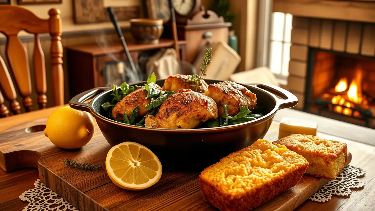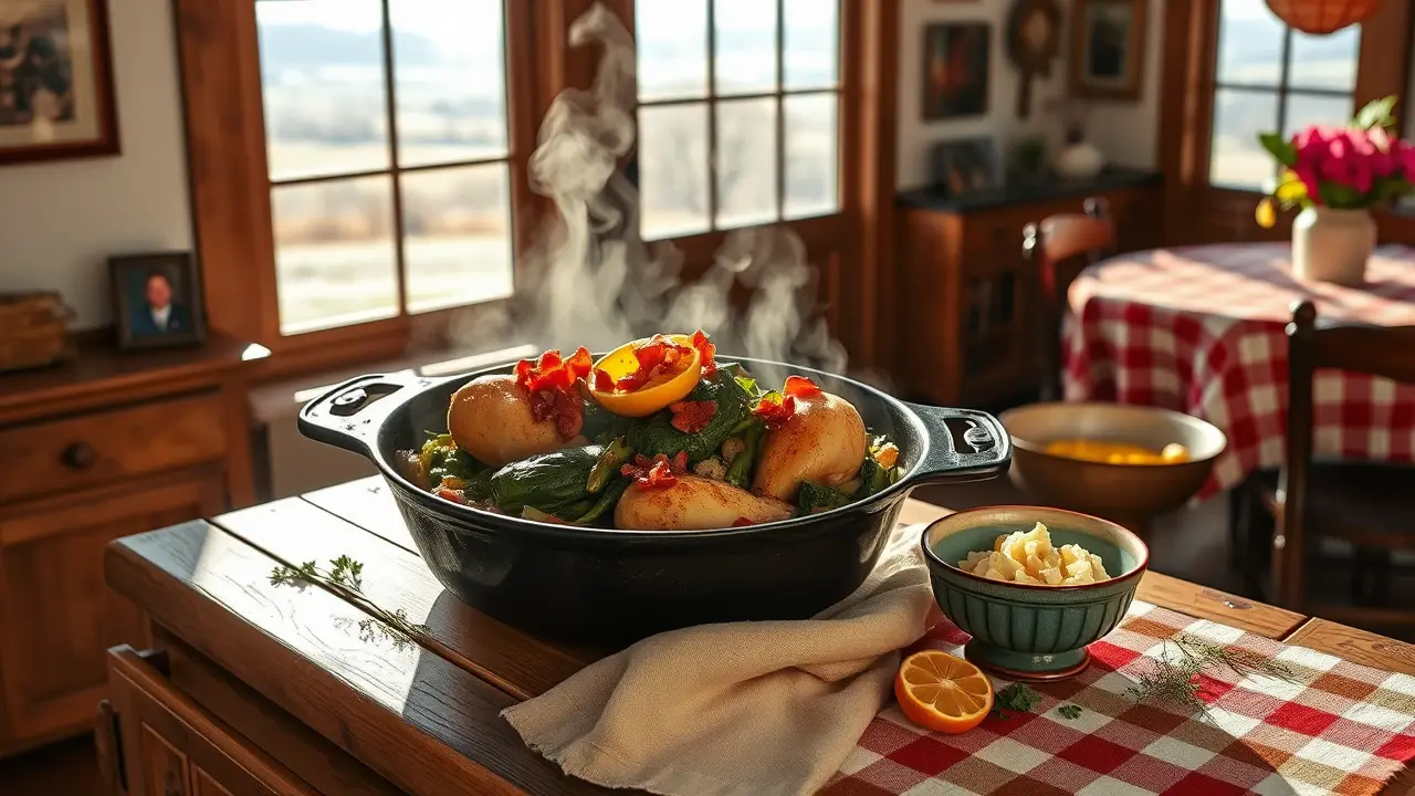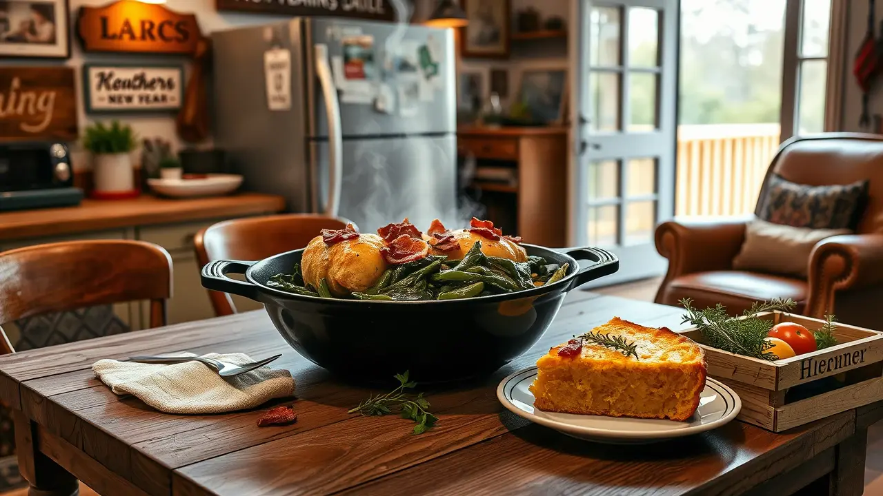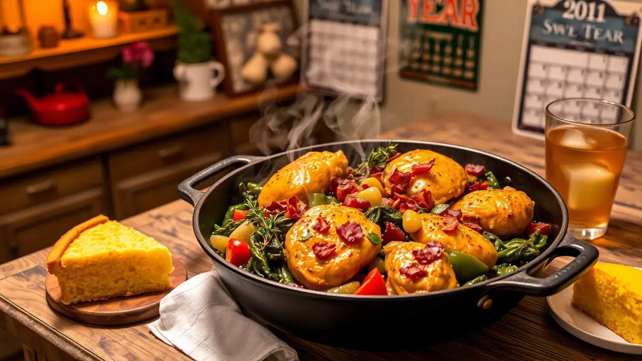 # Southern New Year's Day Skillet: Chicken and Greens 🍗🌿 This hearty and flavorful dish is perfect for ringing in the New Year the Southern way! Infused with the rich flavors of chicken, traditional greens, and aromatic spices, this skillet meal embodies comfort and celebration. Serve this dish alongside cornbread for a true Southern feast! ## Ingredients ### For the Chicken - 1 pound of boneless, skinless chicken thighs (or breasts) - 1 tablespoon olive oil - 1 teaspoon smoked paprika - 1 teaspoon garlic powder - Salt and pepper to taste ### For the Greens - 1 bunch collard greens, stems removed and chopped (substitutes: kale or mustard greens) - 1 tablespoon bacon grease (or olive oil) - 1 medium onion, diced - 2 cloves of garlic, minced - 2 cups chicken broth - 1 teaspoon apple cider vinegar - 1 teaspoon red pepper flakes (optional, for heat) ### For the Finish - Cooked bacon or sausage, crumbled (optional, for extra flavor) - Fresh lemon wedges, for serving ## Instructions 1. **Prepare the Chicken:** - In a large bowl, toss the chicken with olive oil, smoked paprika, garlic powder, salt, and pepper until well coated. - Heat a large skillet over medium heat and cook the chicken until golden brown and cooked through, about 5-7 minutes per side. Remove from the skillet and set aside. > 💡 For extra flavor, marinate the chicken in your spice mixture for 30 minutes before cooking. 2. **Sauté the Greens:** - In the same skillet, add bacon grease (or olive oil) and sauté the diced onion until translucent, approximately 5 minutes. - Add the minced garlic and cook for an additional minute until fragrant. 3. **Cook the Collard Greens:** - Stir in the chopped collard greens, chicken broth, apple cider vinegar, and red pepper flakes. - Let the mixture simmer on low heat for about 15-20 minutes until the greens are tender and the flavors have melded. > 💧 If collard greens are not available, feel free to substitute with kale or mustard greens, adjusting cooking times slightly as needed. 4. **Combine:** - Nestle the cooked chicken back into the skillet with the greens. - Let everything cook together for an additional 5 minutes, ensuring the chicken is heated through. 5. **Serve:** - Serve hot, topped with crumbled bacon or sausage if desired, and a squeeze of fresh lemon juice to brighten the flavor. > 🍋 The lemon juice adds a refreshing tang that's a perfect contrast to the rich flavors of the dish. ## Variations - **Vegetarian:** Replace chicken with hearty mushrooms or roasted chickpeas, and use vegetable broth. This creates a satisfying and delicious meatless dish! 🌱 - **Spicy:** Add chopped jalapeños to the sautéed onions for an extra kick of heat. - **Herbed:** Toss in a handful of fresh herbs like thyme or parsley right before serving for added freshness. - **Slow Cooker:** Prepare the chicken and greens in a slow cooker, adding the broth and cooking on low for 6-8 hours for a hands-off approach. This Southern New Year's Day Skillet is sure to bring joy and good fortune to your table as you celebrate a fresh start in the new year! 🌟🍽️name