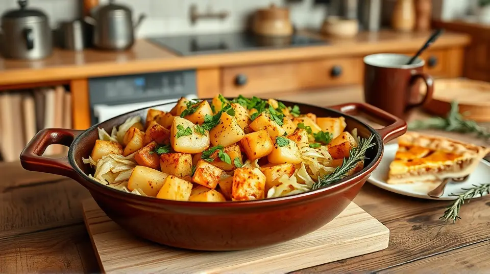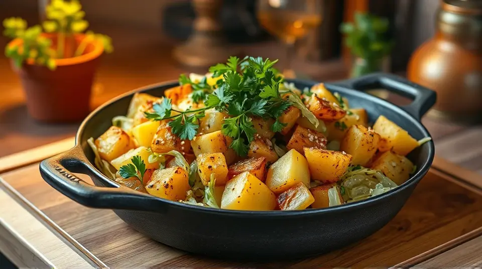 # Savory Fried Cabbage and Potato Skillet 🥔🥬 This warm and hearty recipe is a simple yet flavorful dish that's perfect for a cozy dinner or as a side to your favorite protein. The combination of tender potatoes and caramelized cabbage creates a comforting meal that's both satisfying and nutritious. Feel free to experiment with spices or add in your favorite protein to customize it to your taste! ## Ingredients ### For the skillet - 1 medium head of green cabbage, shredded - 2 large russet potatoes, peeled and diced - 1 medium onion, chopped - 2 tablespoons olive oil or butter - 1 teaspoon garlic powder - 1 teaspoon paprika - Salt and pepper to taste - 1/2 teaspoon red pepper flakes (optional for heat) ### For garnish - Fresh parsley, chopped - A squeeze of lemon juice (optional) ## Instructions - In a large skillet, heat the olive oil or butter over medium heat. - Add the diced potatoes to the skillet and cook for about 5-7 minutes until they start to soften, stirring occasionally. > 🔥 Make sure to cut the potatoes into evenly-sized cubes to ensure even cooking. You can also parboil them for a few minutes before adding them to the skillet for even quicker cooking! - Add the chopped onion to the skillet and continue to sauté until the onions become translucent, about 3-4 minutes. - Stir in the shredded cabbage, garlic powder, paprika, salt, pepper, and red pepper flakes. > 🌱 Feel free to incorporate other veggies such as bell peppers or carrots for extra color and flavor! - Cook for an additional 10-15 minutes, stirring occasionally, until the cabbage is wilted and the potatoes are tender and slightly crispy. > 🥄 If you prefer a softer cabbage texture, you can cover the skillet for a few minutes to steam the cabbage slightly. - Once cooked to your liking, remove from heat and garnish with fresh parsley and a squeeze of lemon juice, if desired. ## Variations - **Vegan Delight**: Swap butter for olive oil and keep it plant-based. Add chickpeas for a protein boost! 🌱 - **Cheesy Version**: Sprinkle some cheddar or feta cheese over the dish just before serving for an indulgent twist. 🧀 - **Herbed Cabbage**: Add a teaspoon of dried thyme or oregano during cooking for an aromatic flavor boost. - **Meaty Option**: Toss in diced smoked sausage or bacon with the onions for an extra savory finish. Enjoy this delightful Fried Cabbage and Potato Skillet as a warm comforting meal that’s bound to become a staple in your kitchen! 🍽️name