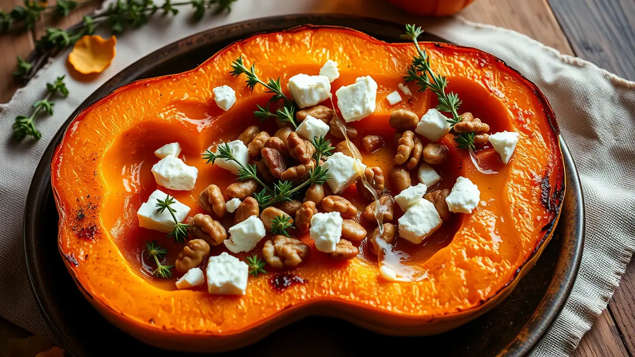 - Transfer the roasted squash to a serving platter and garnish with additional thyme sprigs, crumbled feta cheese, and chopped nuts if desired for a crunch.