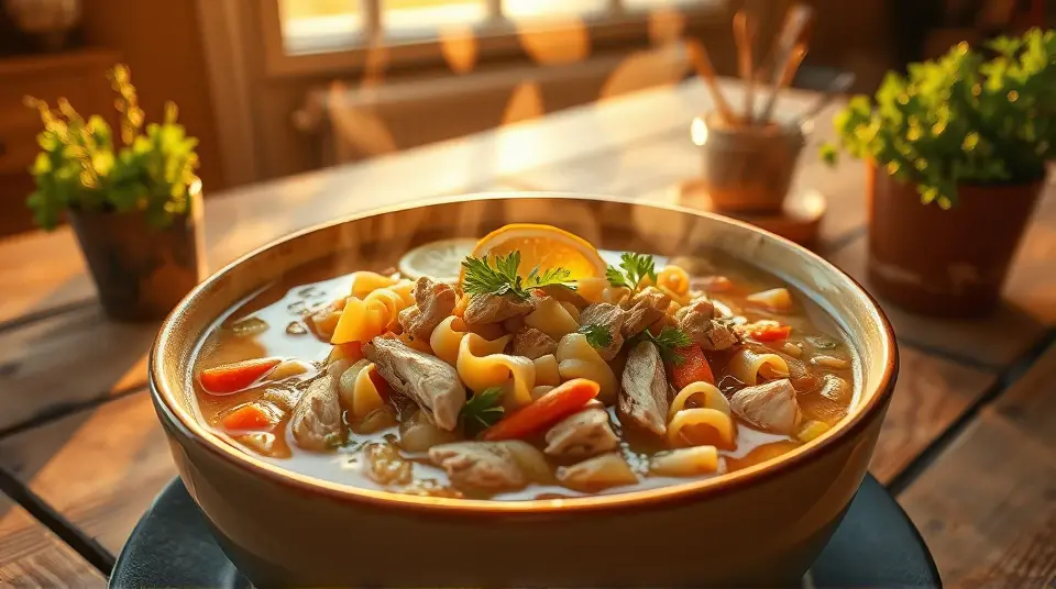 # Low Sodium Chicken Noodle Soup 🍲🐔 This cozy and heartwarming chicken noodle soup is not only delicious but also easy on the sodium levels! Perfect for a chilly day, this recipe allows you to enjoy all the flavors without compromising your health. Feel free to add your favorite veggies or herbs for extra flair! ## Ingredients ### For the soup base - 1 tablespoon olive oil - 1 medium onion, diced - 2 carrots, sliced - 2 celery stalks, sliced - 3 cloves garlic, minced - 8 cups low-sodium chicken broth - 1 pound boneless, skinless chicken breast - 1 teaspoon dried thyme - 1 teaspoon dried oregano - 1 bay leaf - Freshly ground black pepper, to taste ### For the noodles - 2 cups whole wheat egg noodles (or gluten-free noodles for a twist) ### For garnish - 1/4 cup fresh parsley, chopped - Lemon wedges (optional) ## Instructions 1. Heat the olive oil in a large pot over medium heat. 2. Add the diced onion, carrots, and celery. Sauté until the vegetables are tender, about 5-7 minutes. Stir in the minced garlic and cook for an additional minute. > 🥬 For a pop of color and nutrients, consider adding chopped bell peppers or green beans during this step! 3. Pour in the low-sodium chicken broth and add the chicken breast, thyme, oregano, bay leaf, and freshly ground black pepper. Bring to a boil, then reduce heat to a simmer. 4. Let it simmer for 20-25 minutes until the chicken is cooked through. Once done, remove the chicken and shred it with two forks. > 🥄 Make sure to discard the bay leaf before serving—it's not meant to be eaten! 5. Return the shredded chicken to the pot, add the whole wheat noodles, and cook according to the noodle package instructions (usually about 5-7 minutes) until al dente. 6. Taste and adjust seasoning if necessary. Garnish with fresh parsley before serving. Add a squeeze of lemon juice for an extra zing! > 🍋 The lemon enhances the flavor profile beautifully and can help brighten up the overall dish. Enjoy fresh or store leftovers for a later meal! ## Variations - **Vegetable-packed**: Toss in some kale, spinach, or peas during the last few minutes of cooking for added nutrition! 🥬 - **Spicy kick**: Add a pinch of red pepper flakes or a dash of hot sauce to bring some heat to the soup. 🌶️ - **Herbal infusion**: Use fresh herbs like dill or basil instead of dried for a fresher taste. - **Ramen-style**: Swap out the egg noodles for ramen noodles, and stir in a soft-boiled egg on top for a fun twist! 🍜 ### Enjoy your healthy, low sodium chicken noodle soup! It’s comfort in a bowl! 🥣✨name