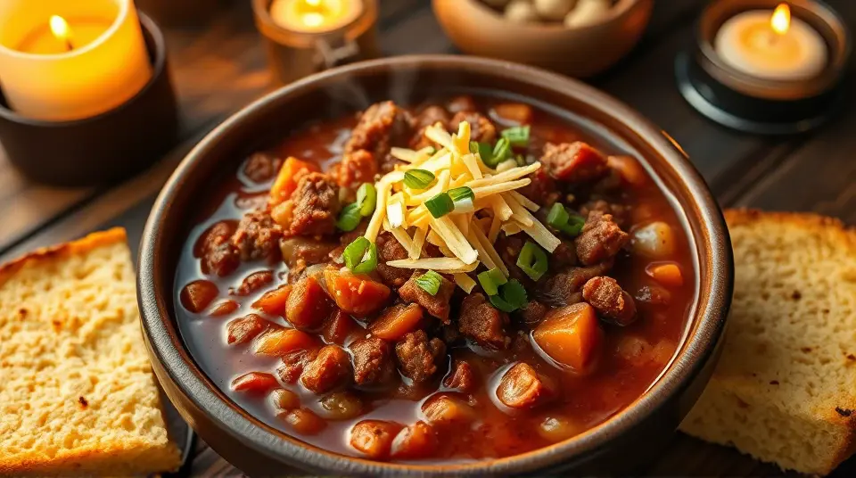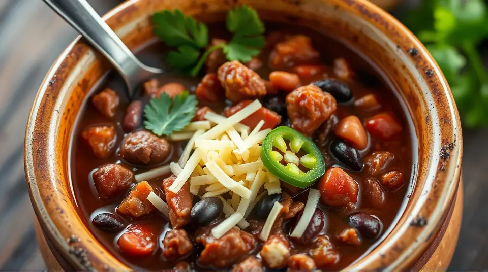 # Smoky Slow Cooker Roadhouse Chili 🌶️🍲 This hearty and flavorful Roadhouse Chili is perfect for game day, family gatherings, or a cozy evening at home. With a mix of spices, smoky flavors, and tender meat, this chili will warm you up from the inside out. Serve it up with some cornbread or tortilla chips for the ultimate comfort food experience! 🌽🥙 ## Ingredients ### For the chili - 1 pound ground beef (or substitute with turkey for a leaner option) - 1 large onion, diced - 3 cloves garlic, minced - 1 bell pepper, diced (any color you like!) - 2 (15 oz) cans of kidney beans, drained and rinsed - 1 (15 oz) can of black beans, drained and rinsed - 1 (28 oz) can crushed tomatoes - 2 tablespoons tomato paste - 2 tablespoons chili powder - 1 teaspoon smoked paprika - 1 teaspoon ground cumin - 1/2 teaspoon cayenne pepper (adjust to taste) - 1 teaspoon dried oregano - Salt and pepper to taste - 1 cup beef broth (or vegetable broth) ### For the toppings - Shredded cheddar cheese - Sour cream - Sliced jalapeños - Chopped green onions - Fresh cilantro ## Instructions - In a skillet over medium heat, brown the ground beef with the onion and garlic until the beef is fully cooked and the onion is translucent. Drain excess fat if necessary. > 🥄 Browning the meat adds depth of flavor to your chili, so don't skip this step! You can also use a mix of meats like ground pork and beef for added richness. - Transfer the cooked meat mixture to the slow cooker. Add the bell pepper, kidney beans, black beans, crushed tomatoes, tomato paste, chili powder, smoked paprika, cumin, cayenne pepper, oregano, salt, pepper, and beef broth. - Stir everything together until well combined. > 🧂 Feel free to adjust the spices according to your personal taste. If you prefer a milder chili, reduce or omit the cayenne pepper. - Cover and cook on low for 6-8 hours or on high for 3-4 hours. The longer it cooks, the more the flavors will meld together! - Before serving, taste and adjust seasonings as needed. ## Variations - **Vegetarian**: Replace the ground beef with a mix of lentils and extra beans (like pinto or chickpeas), and use vegetable broth instead of beef broth. You'll still get a hearty and satisfying chili! 🌱 - **Spicy**: Add diced serrano or habanero peppers to the mix for an extra kick! 🔥 - **Smoky**: Toss in some diced chipotle peppers in adobo sauce for a deeper smoky flavor that complements the chilies perfectly. - **Southern twist**: Stir in some cooked and crumbled cornbread just before serving for a unique and delightful twist! > 🥘 This chili keeps well in the fridge for up to a week, and it also freezes beautifully. Make a batch and enjoy it for weeks to come!name