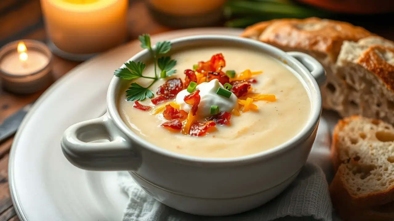 Serve: Ladle the soup into bowls and top with crumbled bacon, shredded cheddar cheese, and a dollop of sour cream if desired. Finish with chopped green onions and fresh parsley.