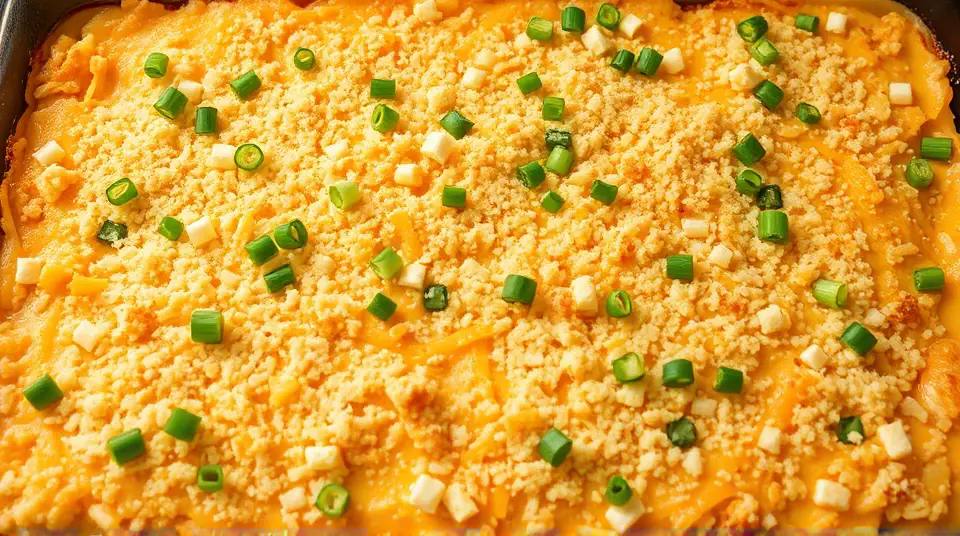 Sprinkle the breadcrumb mixture evenly over the chicken casserole, then top with the remaining cheddar and mozzarella cheeses.