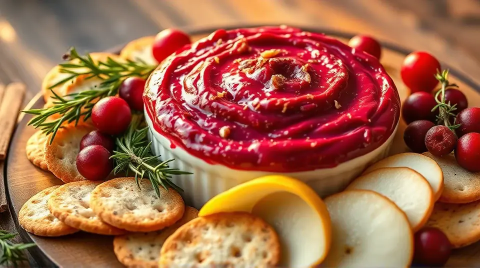 # Festive Cranberry Spread for Crackers and Appetizers 🥂🍇 This delightful cranberry spread is perfect for holiday gatherings, cocktail parties, or cozy get-togethers. Its blend of tart cranberries with sweet maple syrup and cream cheese creates a mouthwatering combination that pairs beautifully with a variety of crackers and breads. This spread is not only simple to make but also versatile; feel free to adjust the sweetness or spice levels to suit your taste. Serve it at your next gathering, and watch your guests come back for seconds! 🎉 ## Ingredients ### For the spread - 1 cup fresh or frozen cranberries - 1/4 cup maple syrup (adjust to taste) - 1/2 teaspoon cinnamon - 1/4 teaspoon nutmeg - 1 tablespoon lemon juice - 8 oz cream cheese, softened - 1/4 cup chopped pecans or walnuts (optional) - Fresh herbs for garnish (like rosemary or thyme) ### To serve - Assorted crackers (rye, whole grain, or herbed varieties) - Slices of toasted baguette - Fresh apple or pear slices (optional) ## Instructions 1. **Cook the cranberries**: In a medium saucepan, combine the cranberries, maple syrup, cinnamon, nutmeg, and lemon juice. Cook over medium heat until the cranberries begin to burst and a sauce forms (about 5-7 minutes). Remove from heat and let it cool completely. 2. **Blend the spread**: In a mixing bowl, beat the softened cream cheese until smooth. Gradually fold in the cooled cranberry mixture until well combined. > 💡 For a smoother texture, you can use a food processor to blend the mixture completely after cooling. 3. **Add nuts**: If using, fold in the chopped pecans or walnuts for extra crunch and flavor. 4. **Chill and serve**: Transfer the spread to a serving dish, cover, and refrigerate for at least one hour to allow the flavors to meld. 5. **Garnish and enjoy**: Before serving, garnish with fresh herbs for a festive touch. Serve alongside a variety of crackers, toasted baguette slices, or fresh fruit. ## Variations - **Spicy kick**: Add a splash of sriracha or a pinch of chili flakes for a spicy twist! 🔥 - **Vegan option**: Substitute cream cheese with a plant-based cream cheese alternative and adjust the sweetener to taste. - **Fruit lovers**: Mix in some finely chopped apples or pears to add extra sweetness and texture to your spread. - **Herb-infused**: Add a teaspoon of finely chopped fresh rosemary or thyme into the cranberry mixture for an aromatic touch. Enjoy this festive cranberry spread as a beautiful centerpiece for your appetizer table, bringing a perfect balance of flavors that everyone will love! 🥳name