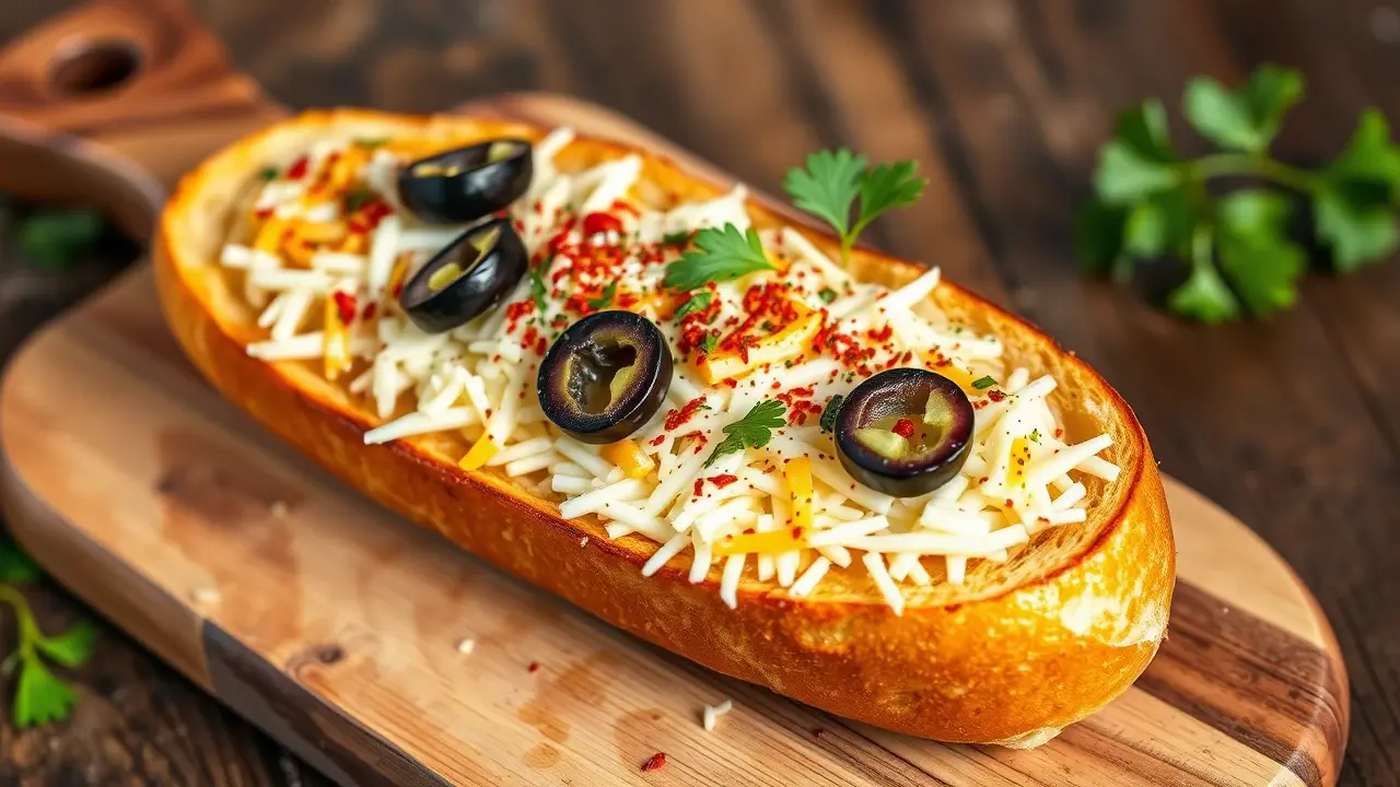 # Spicy Topped French Bread with Black Olives and Mozzarella 🌶️🍞🧀 This scrumptious dish is a delightful fusion of flavors and textures, perfect for an appetizer, snack, or a fun addition to any meal. The spicy topping complements the creamy mozzarella and salty black olives, while the crispy French bread serves as the ideal base. Get ready for a taste explosion! Pair it with a chilled glass of white wine or a zesty lemonade for a refreshing experience. 🍷🍋 ## Ingredients ### For the bread - 1 large French baguette (about 12 inches) - 2 tablespoons olive oil - 1 teaspoon garlic powder - 1/2 teaspoon salt - 1/4 teaspoon black pepper ### For the spicy topping - 1 cup shredded mozzarella cheese - 1/2 cup black olives, sliced - 1/2 teaspoon red pepper flakes (adjust to taste) - 1 teaspoon dried oregano - 1/4 cup sliced jalapeños (fresh or pickled) - 2 tablespoons fresh parsley, chopped (for garnish) ## Instructions - Preheat your oven to 375°F (190°C). > 🔥 A hotter oven will help achieve that dreamily crispy texture on your French bread while melting the cheese perfectly. - Slice the French baguette in half lengthwise and place the halves on a baking sheet. - In a small bowl, mix the olive oil, garlic powder, salt, and black pepper together. Brush the mixture generously over the insides of the baguette halves. - In a separate bowl, combine the shredded mozzarella cheese, sliced black olives, red pepper flakes, dried oregano, and jalapeños. Mix well. - Evenly distribute the spicy cheese mixture over the brushed sides of the baguette halves. > 🧀Feel free to customize the spice level! Add more red pepper flakes or even a dash of hot sauce if you like it extra fiery. - Bake in the preheated oven for about 12-15 minutes or until the cheese is bubbly and lightly golden. - Remove from the oven and let cool for a minute. Sprinkle fresh chopped parsley over the top for a pop of color before serving. ## Variations - **Vegan**: Use vegan mozzarella cheese and a plant-based spread for the olive oil mixture for a delicious dairy-free option. - **Herbaceous**: Add fresh basil or thyme to the cheese topping for an aromatic twist. - **Meaty**: For a heartier version, top the bread with cooked and crumbled Italian sausage or spicy chorizo before adding the cheese. - **High altitude**: If you're baking at high altitude, consider reducing the baking time slightly as items can cook faster due to lower atmospheric pressure. Indulge in this spicy topped French bread with black olives and mozzarella, and enjoy every cheesy, flavorful bite! 🌟name