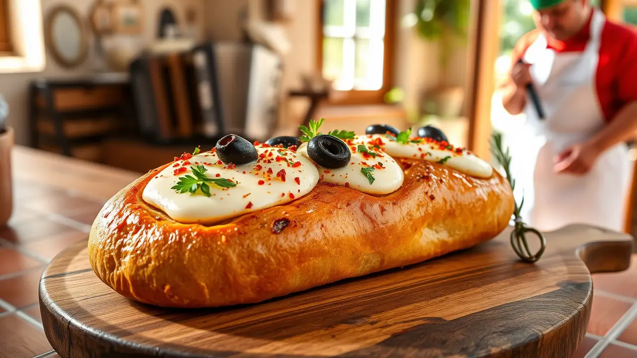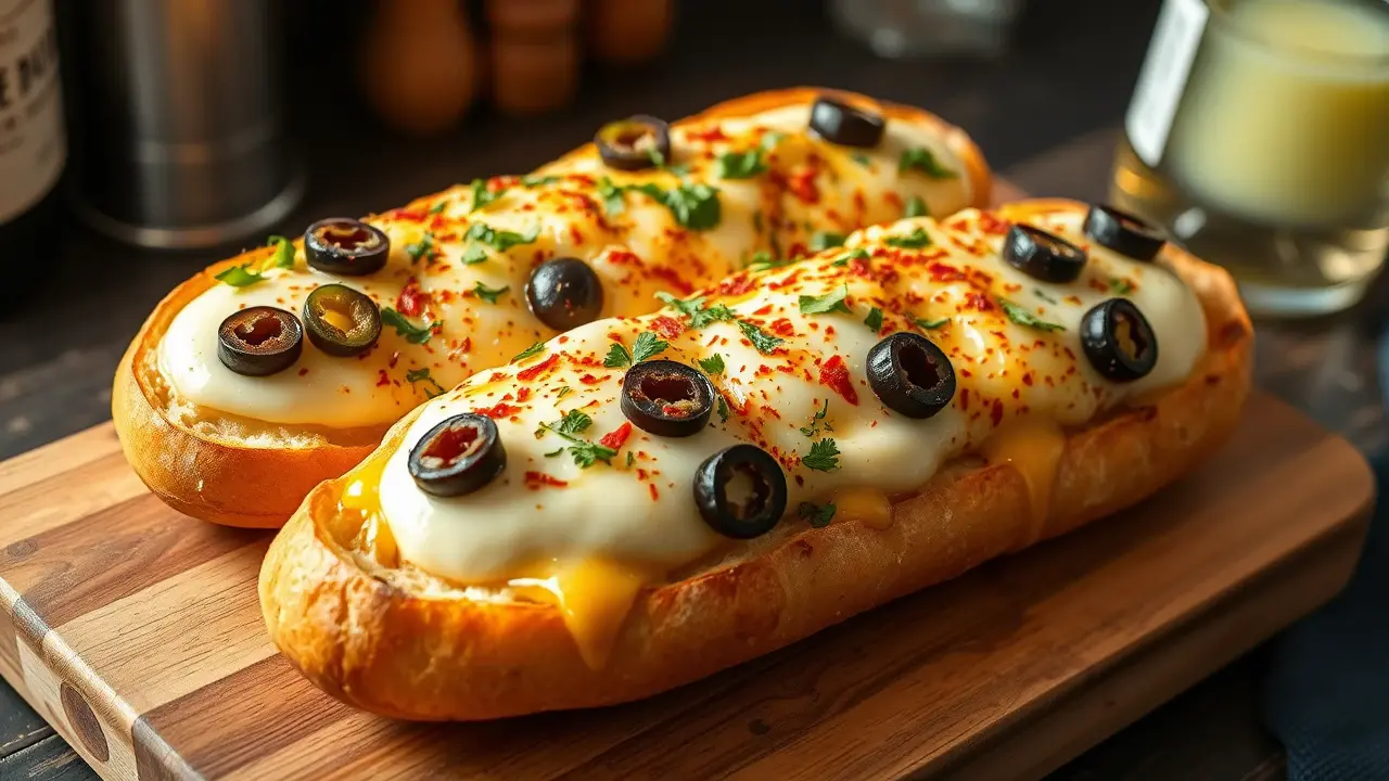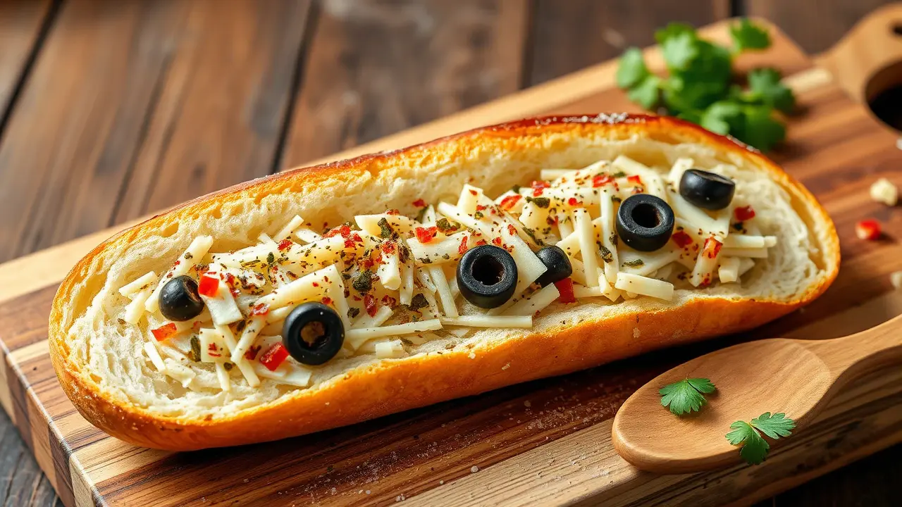Spicy Topped French Bread with Black Olives and Mozzarella 🌶️🍞🧀