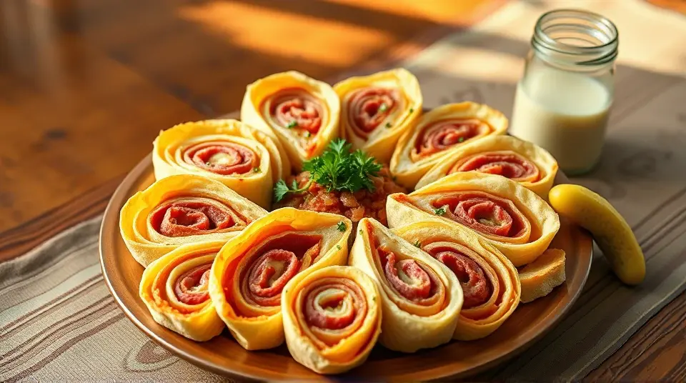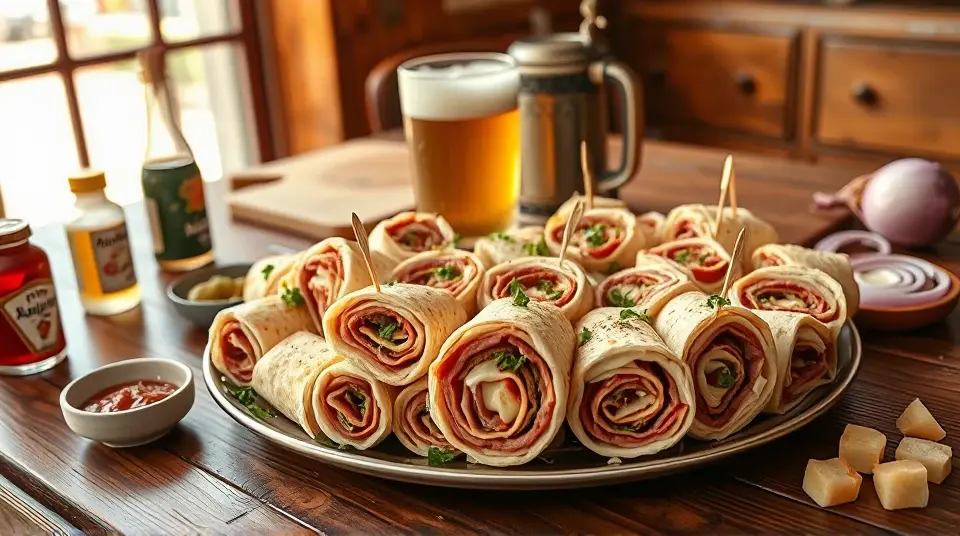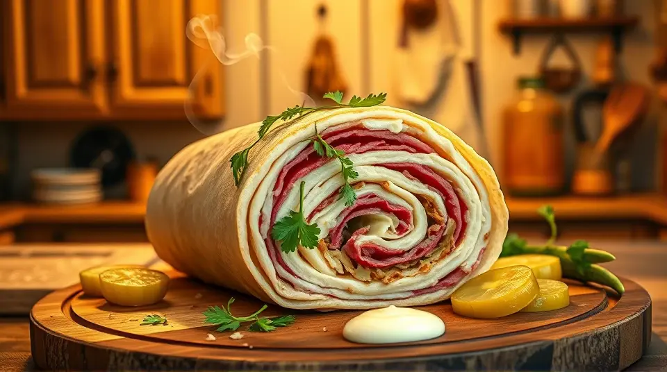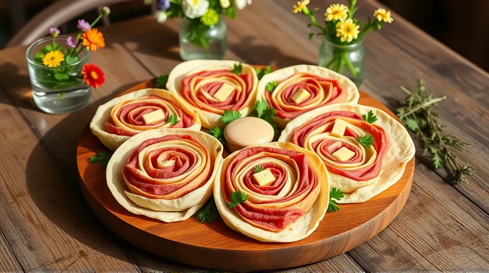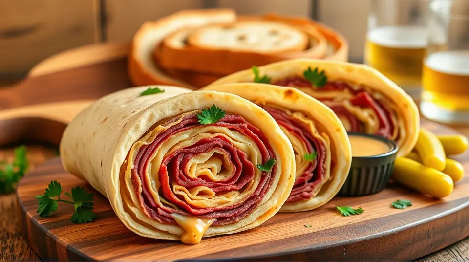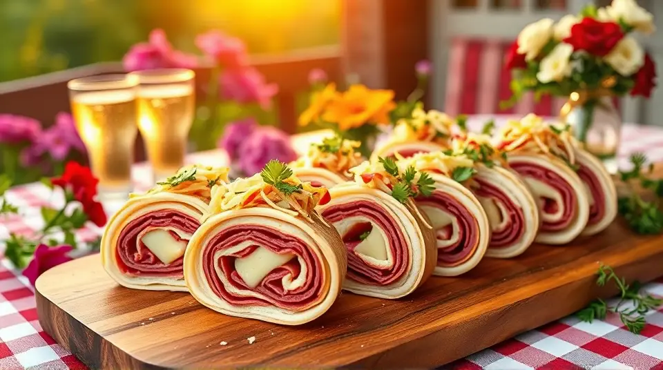 # Reuben Sandwich Pinwheel Appetizer 🥪✨ These delightful Reuben Sandwich Pinwheels celebrate the classic flavors of the traditional Reuben sandwich in a fun, bite-sized version! Perfect for game day, parties, or casual gatherings, these pinwheels are easy to assemble and bursting with flavor. The combination of corned beef, Swiss cheese, tangy sauerkraut, and rich dressing, all wrapped in a tortilla, makes for a crowd-pleasing treat! 🌟 ## Ingredients ### For the pinwheels - 4 large flour tortillas (or rye tortillas for a traditional touch) - 8 ounces deli sliced corned beef - 8 ounces Swiss cheese, sliced - 1 cup sauerkraut, drained and squeezed dry - 1/2 cup Russian or Thousand Island dressing - Fresh parsley, chopped (for garnish) ### For serving - Extra dressing for dipping (optional) - Pickles or pickle spears (optional) ## Instructions - Lay out the tortillas on a clean surface. - Spread a layer of Russian or Thousand Island dressing evenly over each tortilla, leaving a small border around the edges. - On top of the dressing, layer the corned beef first, followed by Swiss cheese, and then evenly distribute the sauerkraut across the tortillas. > 🥄 Make sure the sauerkraut is well-drained to avoid soggy pinwheels! A little moisture is okay, but excess liquid can make the tortillas hard to roll. - Starting from one end, carefully roll each tortilla tightly into a log shape. Secure with toothpicks if necessary. - Once rolled, slice each log into 1-inch thick pinwheels. Arrange them on a serving platter. > 🍽️ You can serve them as-is, or place them in the fridge for about 30 minutes to help them hold their shape better before slicing. ## Variations - **Spicy Kick**: Add sliced jalapeños or a sprinkle of red pepper flakes to the filling for a spicy twist! 🌶️ - **Vegetarian Version**: Swap the corned beef for slices of roasted red pepper or grilled mushrooms, and use a plant-based cheese for a delicious vegetarian option. 🌱 - **Herbed Up**: Mix some dill into the dressing or sprinkle fresh dill over the filling before rolling for an extra flavor boost. 🌿 - **Wrap Upgrade**: Try using spinach or tomato-flavored wraps to add a pop of color and additional nutrients to the appetizer! Enjoy these Reuben Sandwich Pinwheel Appetizers as a tantalizing treat at your next gathering! They're sure to be devoured in no time! 🎉🥳name