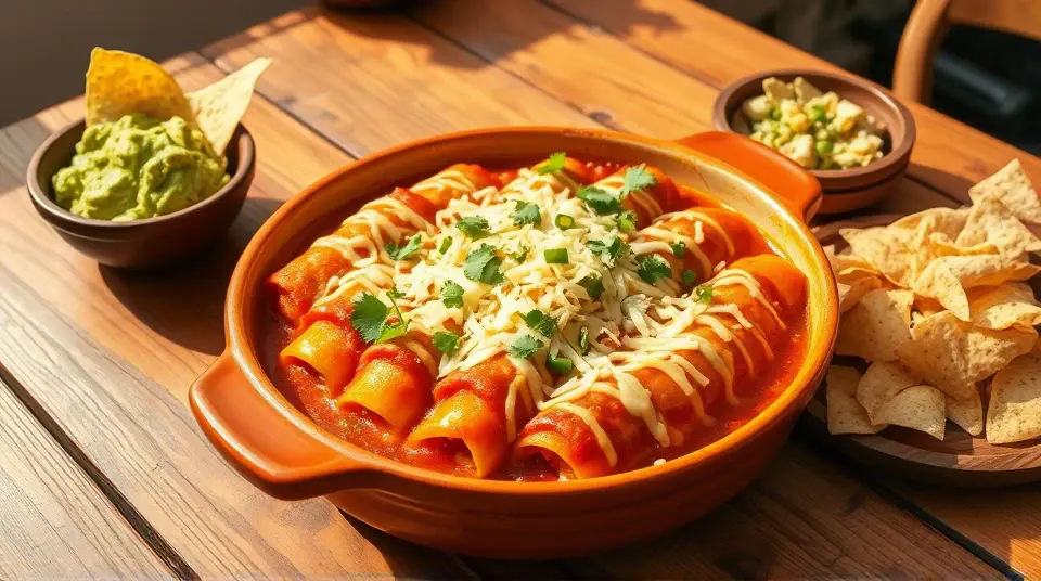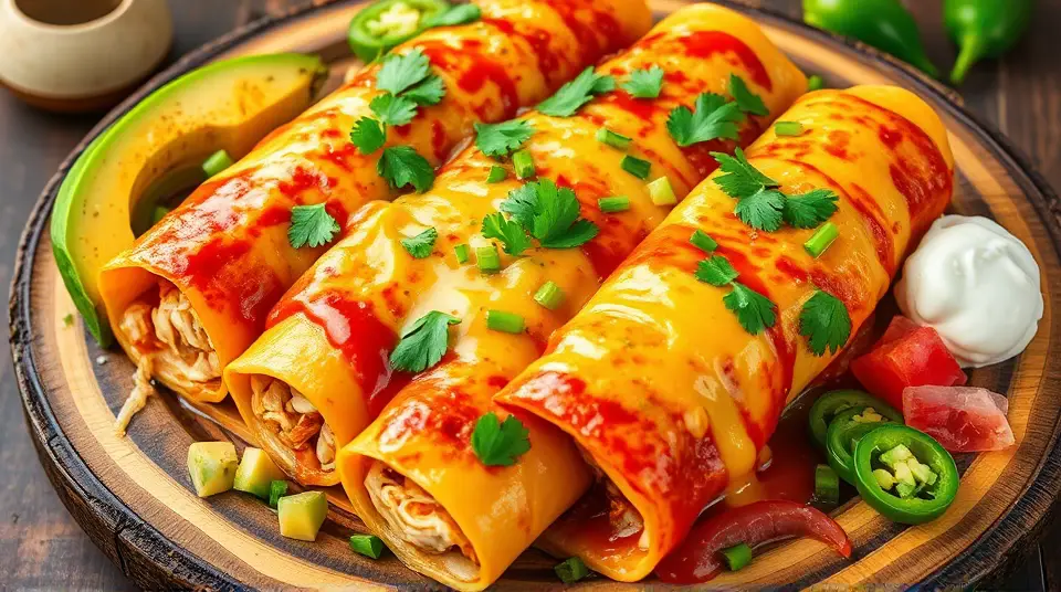 # Sweet and Spicy Homemade Chicken Enchiladas 🌶️🍗 These homemade chicken enchiladas are bursting with flavor and packed with wholesome ingredients. They are perfect for a family dinner or a gathering with friends. The blend of spices in the filling, combined with a zesty homemade enchilada sauce, creates a delicious meal that will have everyone asking for seconds. Serve with a side of guacamole and tortilla chips for a true fiesta! 🎉 ## Ingredients ### For the Chicken Filling - 2 cups cooked, shredded chicken (rotisserie chicken works great) - 1 cup cheese (cheddar or Monterey Jack), shredded - 1 small onion, finely chopped - 2 cloves garlic, minced - 1 teaspoon ground cumin - 1 teaspoon chili powder - 1/2 teaspoon smoked paprika - Salt and pepper to taste - 1/4 cup fresh cilantro, chopped (optional) - 8 small corn tortillas ### For the Enchilada Sauce - 1 tablespoon olive oil - 1 can (15 oz) tomato sauce - 1 cup chicken broth - 1 teaspoon chili powder - 1 teaspoon ground cumin - 1/2 teaspoon garlic powder - Salt to taste ### For Topping - 1 cup cheese (cheddar or Monterey Jack), shredded - Optional garnishes: sour cream, avocado, cilantro, sliced jalapeños ## Instructions 1. **Preheat your oven** to 375°F (190°C). 2. **Prepare the sauce**: In a saucepan, heat olive oil over medium heat. Add tomato sauce, chicken broth, chili powder, cumin, garlic powder, and salt. Stir well and let it simmer for about 5-10 minutes until slightly thickened. 3. **Make the filling**: In a mixing bowl, combine shredded chicken, half of the shredded cheese, onion, garlic, cumin, chili powder, smoked paprika, salt, pepper, and cilantro. Mix well. 4. **Assemble the enchiladas**: - Warm the corn tortillas in a dry skillet or microwave to make them pliable. - Spoon about 1/4 cup of the chicken filling into each tortilla, roll them up, and place seam-side down in a greased baking dish. 5. **Top with sauce**: Pour the enchilada sauce over the rolled tortillas, making sure to cover them well. Sprinkle the remaining cheese on top. 6. **Bake** uncovered for 20-25 minutes, or until the cheese is melted and bubbly. 7. **Serve hot**: Garnish with sour cream, avocado, fresh cilantro, or jalapeños as desired. > 🐔 For extra flavor, marinate the shredded chicken in lime juice and your favorite spices before cooking. This will elevate the taste of your enchiladas! ## Variations - **Vegetarian**: Substitute the chicken with black beans, sautéed peppers, and zucchini for a hearty twist. - **Spicy**: Add diced jalapeños to the filling or use a spicy salsa in place of the tomato sauce. - **Creamy**: Mix cream cheese with the filling for a richer texture and flavor. - **Cheesy**: Layer additional cheese between the tortillas for an extra cheesy experience! Enjoy your delightful, homemade chicken enchiladas with family and friends! 🌟name