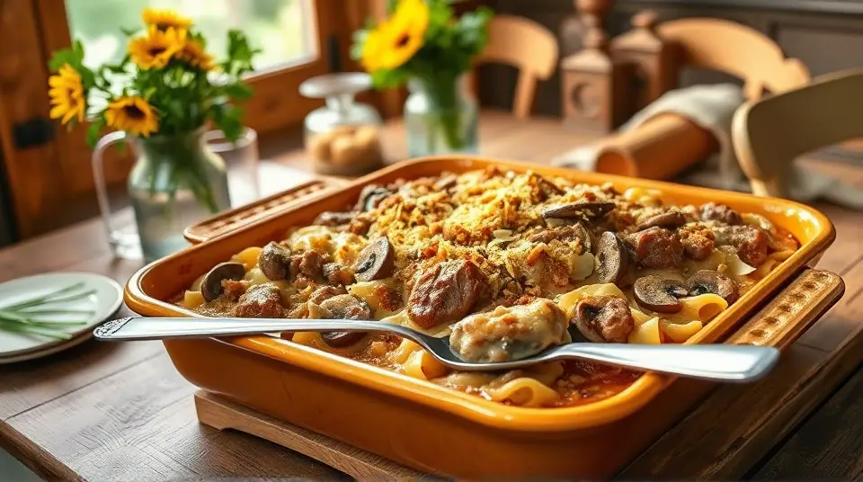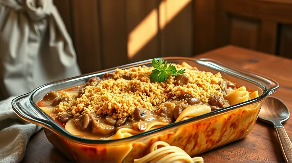 # Simple Oven Stroganoff 🍝🍄 This delightful oven stroganoff brings all the flavors of the classic beef stroganoff into a hassle-free, comforting dish. It's perfect for busy weeknights or cozy family gatherings. With tender beef, creamy sauce, and delightful mushrooms, this stroganoff is both hearty and satisfying. Serve it over egg noodles or rice, and you have a complete meal that's sure to please everyone at the table! 🍽️✨ ## Ingredients ### For the Stroganoff - 1 pound of beef sirloin, thinly sliced - 8 ounces of mushrooms, sliced - 1 onion, diced - 2 cloves of garlic, minced - 2 cups of beef broth - 1 cup of sour cream - 2 tablespoons of Worcestershire sauce - 1 teaspoon of paprika - Salt and pepper to taste - 2 tablespoons of olive oil ### For the Topping - 1 cup of crushed crackers or breadcrumbs - 1/4 cup of grated Parmesan cheese - 2 tablespoons of melted butter - Fresh parsley for garnish (optional) ## Instructions 1. **Preheat Your Oven**: Preheat your oven to 350°F (175°C). 2. **Sauté the Vegetables and Beef**: In a large skillet over medium heat, add the olive oil. Sauté the onions and garlic until translucent. Then, add the sliced mushrooms and cook until they begin to soften. 3. **Brown the Beef**: Increase the heat to medium-high and add the beef slices. Brown the beef for about 4-5 minutes. > 🔥 Ensure the skillet is hot enough to quickly sear the beef, locking in those delicious flavors! 4. **Combine the Sauce**: Lower the heat back to medium. Stir in the beef broth, Worcestershire sauce, paprika, salt, and pepper. Allow it to simmer for about 10 minutes, letting the flavors meld. 5. **Add Sour Cream**: Remove the skillet from the heat and gently fold in the sour cream until combined. 6. **Transfer to a Baking Dish**: Pour the beef stroganoff mixture into a greased 9x13 inch baking dish. 7. **Prepare the Topping**: In a bowl, combine the crushed crackers or breadcrumbs with melted butter and Parmesan cheese. Sprinkle this mixture evenly over the stroganoff. 8. **Bake**: Place the dish in the preheated oven and bake for 25-30 minutes, or until the topping is golden and crispy. 9. **Serve**: Garnish with fresh parsley if desired. Serve over egg noodles or rice for a filling meal! > 🍝 For a creamier sauce, feel free to add a splash of heavy cream along with the sour cream. ## Variations - **Vegetarian**: Substitute the beef with tempeh, seitan, or a mix of hearty vegetables like zucchini and bell peppers for a delicious meatless version! 🌱 - **Spicy Kick**: Add a teaspoon of red pepper flakes to the sauce for a slight heat that elevates the dish. - **Gluten-free**: Use gluten-free breadcrumbs and serve over quinoa or gluten-free pasta. - **One-pan option**: Sauté everything in a large oven-safe skillet for easier cleanup! Just make sure it’s ovenproof before baking. Enjoy this comforting and flavorful Simple Oven Stroganoff with your loved ones! 🥰name