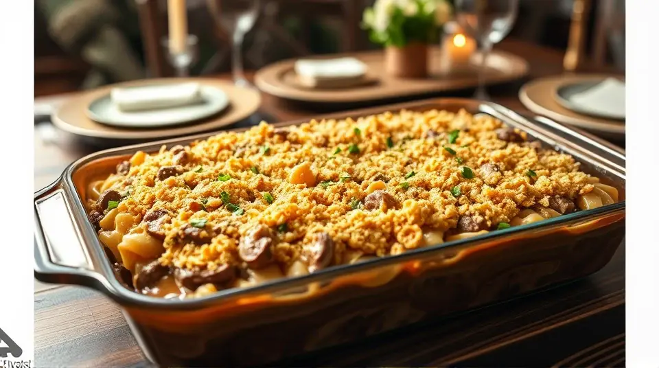 Prepare the Topping: In a bowl, combine the crushed crackers or breadcrumbs with melted butter and Parmesan cheese. Sprinkle this mixture evenly over the stroganoff.