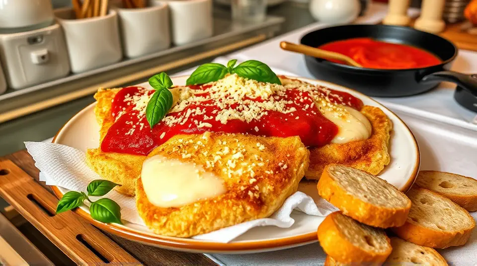 Layer the Chicken: In a baking dish, spread half of the marinara sauce on the bottom. Place the fried chicken cutlets on top of the sauce. Generously spoon more marinara sauce over each cutlet.