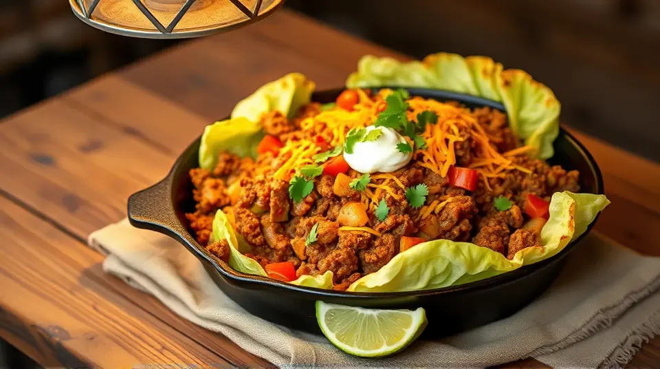 # Low Carb Taco Cabbage Skillet 🌮🥬 This scrumptious Low Carb Taco Cabbage Skillet is a flavorful and satisfying dish that brings the essence of tacos right to your stovetop—without the carbs! Packed with seasoned ground meat, colorful veggies, and crisp cabbage, this skillet meal is quick to prepare and perfect for busy weeknights. Serve it with your favorite toppings for a truly customizable experience! ## Ingredients ### For the skillet - 1 lb ground beef (or turkey/chicken for a leaner option) - 1 medium onion, diced - 2 cloves garlic, minced - 1 bell pepper, diced (any color) - 1 can (14 oz) diced tomatoes, with juice - 1 tbsp taco seasoning (store-bought or homemade) - 4 cups green cabbage, chopped - 1-2 tbsp olive oil (or avocado oil) ### For the toppings - Shredded cheese (cheddar or Mexican blend) - Sour cream or Greek yogurt - Sliced jalapeños - Fresh cilantro, chopped - Diced avocado - Lime wedges ## Instructions 1. **Sauté the Aromatics**: In a large skillet, heat the olive oil over medium heat. Add the diced onion and sauté until translucent, about 3-4 minutes. Add minced garlic and cook for an additional minute until fragrant. 2. **Brown the Meat**: Add the ground beef (or turkey/chicken) to the skillet. Cook until browned and fully cooked, breaking it up with a spatula as you go. Drain excess fat if necessary. 3. **Add Vegetables and Seasoning**: Stir in the bell pepper, diced tomatoes with juice, taco seasoning, and chopped cabbage. Mix well to combine all ingredients. 4. **Cook Until Tender**: Cover the skillet and cook for about 5-7 minutes, or until the cabbage is wilted and tender, stirring occasionally. 5. **Serve and Top**: Once the cabbage is cooked and everything is well mixed, remove from heat. Serve in bowls and top with your favorite toppings such as shredded cheese, sour cream, jalapeños, cilantro, avocado, and a squeeze of lime juice. > 🌟 Feel free to adjust the amount of taco seasoning based on your taste preference. You can also make your own with chili powder, cumin, paprika, garlic powder, onion powder, salt, and pepper for a less processed option. ## Variations - **Vegetarian**: Substitute the meat with black beans or lentils, and add extra veggies like zucchini or mushrooms for a hearty flavor profile. 🥒 - **Spicy Kick**: Toss in some chopped fresh chili peppers or red pepper flakes for an extra spicy version. 🔥 - **Cheesy Option**: Mix in cream cheese at the end for a creamy texture and delicious cheesy flavor. You can also bake it with additional cheese on top for a bubbly finish. 😍 - **Cabbage Alternative**: If you’re not a fan of cabbage, consider using cauliflower rice or zucchini noodles as a substitute. Just pre-cook them a bit before adding to the skillet! This Low Carb Taco Cabbage Skillet is not only a delight for your taste buds but also a healthy, quick meal that you can feel good about serving to the family. Enjoy your taco night minus the carbs! 🌮✨name