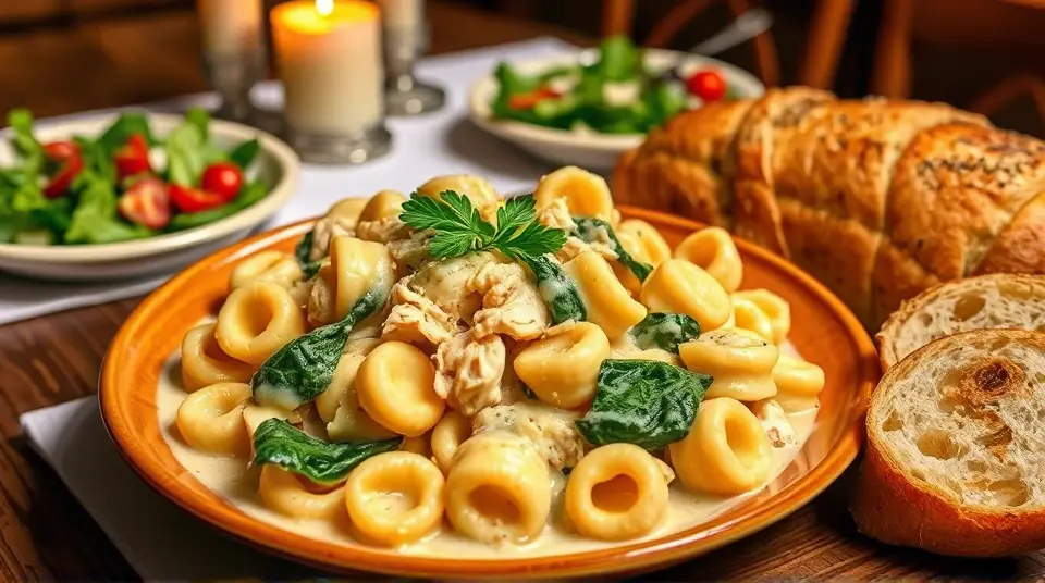 # Slow Cooker Chicken Alfredo Tortellini 🍝🐔 This comforting dish combines tender chicken, creamy Alfredo sauce, and delightful tortellini, all made effortlessly in your slow cooker! Perfect for busy evenings or cozy family dinners, this recipe is both indulgent and satisfying. You can even customize it with your choice of vegetables for added flavor and nutrition! ## Ingredients ### For the dish - 2 chicken breasts, boneless and skinless - 1 cup of vegetable or chicken broth - 2 cups of heavy cream - 1 cup of grated Parmesan cheese - 1 tablespoon of minced garlic - 1 teaspoon of Italian seasoning - Salt and pepper, to taste - 12 ounces of cheese tortellini (fresh or frozen) - 2 cups of spinach (optional) - Fresh parsley, chopped (for garnish) ## Instructions 1. Place the chicken breasts in the bottom of the slow cooker. 2. Pour the broth over the chicken, then add the heavy cream, Parmesan cheese, minced garlic, Italian seasoning, salt, and pepper. Stir gently to combine. 3. Cover the slow cooker and cook on low for 4 hours or high for 2 hours, until the chicken is cooked through and tender. 4. Once the chicken is cooked, remove it from the slow cooker and shred it using two forks. Return the shredded chicken to the slow cooker. 5. Stir in the cheese tortellini and spinach (if using) into the creamy mixture. Cover and cook on low for an additional 30 minutes (or until the tortellini is tender). > 🍽️ For an extra creamy sauce, feel free to add more Parmesan cheese or a splash of milk if it seems too thick. 6. Once ready, serve the Chicken Alfredo Tortellini hot, garnished with fresh parsley. > 🥗 Consider adding steamed broccoli or sautéed mushrooms for extra veggies and flavor. Simply add them in with the tortellini! ## Variations - **Protein-packed**: Substitute the chicken with turkey or substitute half of it with cooked sausage for a different flavor profile. 🍗⚡ - **Vegetarian**: Swap the chicken for sautéed mushrooms, zucchini, and bell peppers. Use vegetable broth in place of chicken broth for a delicious meat-free option! 🌱 - **Spicy kick**: Add crushed red pepper flakes or diced jalapeños for a nice spicy flavor. You can adjust the amount according to your heat preference! 🌶️ - **Low-carb**: Use cauliflower gnocchi or spiralized zucchini instead of tortellini for a lighter, low-carb version of this dish. 🥒 Serve this rich, creamy delight with a side salad and garlic bread for a complete meal that is sure to impress your family and friends! Enjoy! 🥖❤️name