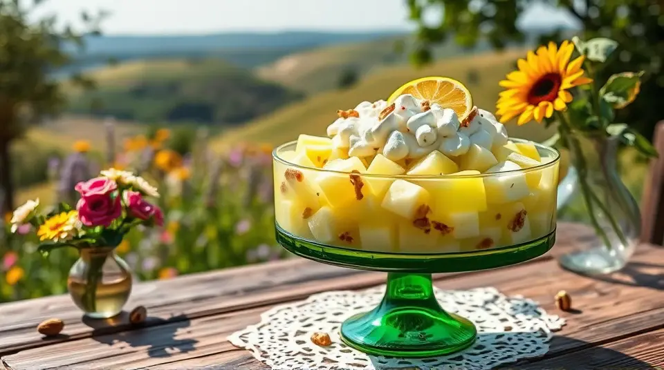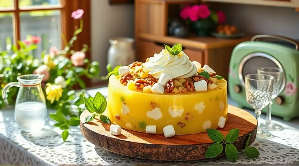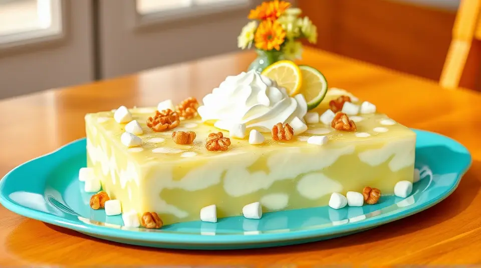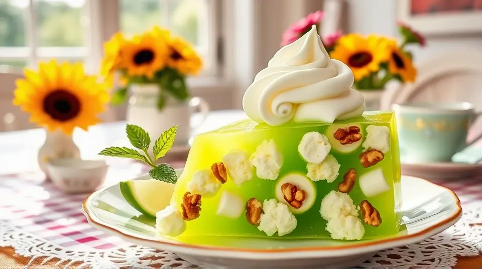 # Old Fashioned Lime Cottage Cheese Jello Salad 🍈🥗 This delightful and nostalgic recipe is a refreshing addition to any gathering, making it perfect for picnics, potlucks, or holiday feasts. The combination of zesty lime, creamy cottage cheese, and vibrant Jello creates a unique texture and flavor that will surprise and please your guests. Serve it chilled and enjoy the nostalgia! 🍽️✨ ## Ingredients ### For the salad - 1 package (3 oz) lime-flavored Jello - 1 cup boiling water - 1 cup cottage cheese (drained) - 1/2 cup crushed pineapple (drained) - 1/4 cup chopped walnuts (optional) - 1/2 cup mini marshmallows ### For the topping - Whipped cream (for garnish) - Lime slices (for decoration) ## Instructions - In a mixing bowl, dissolve the lime Jello in the boiling water, stirring until fully dissolved. > 🥄 Make sure the Jello is completely dissolved to avoid any graininess in your salad. - Allow the mixture to cool to room temperature, then gently mix in the cottage cheese, crushed pineapple, chopped walnuts, and mini marshmallows until combined. - Pour the mixture into a mold or a decorative serving dish and refrigerate for at least 4 hours, or until set. > 🧊 If you don't have a mold, any bowl or dish will work! Just remember that if it sticks, you may need to gently run warm water over the outside to help release it. - Once set, unmold (if using a mold) onto a serving platter or simply serve from your dish. Top with a generous dollop of whipped cream and garnish with lime slices. ## Variations - **Fruit-forward**: Add diced fresh fruits like strawberries or mandarin oranges for extra flavor and color! 🍓🍊 - **Nut-free**: Omit the walnuts if you prefer a nut-free version, or substitute sunflower seeds for a delightful crunch. - **Sugar-free**: Use sugar-free Jello and low-fat cottage cheese for a lighter version that still hits all the tasty notes. - **Layered**: For a more visual appeal, create distinct layers with alternating colors of Jello (like lime and raspberry); just allow each layer to set before adding the next! 🌈 Embrace the whimsy of this retro dish and watch it become a hit at your next gathering! 🎉name