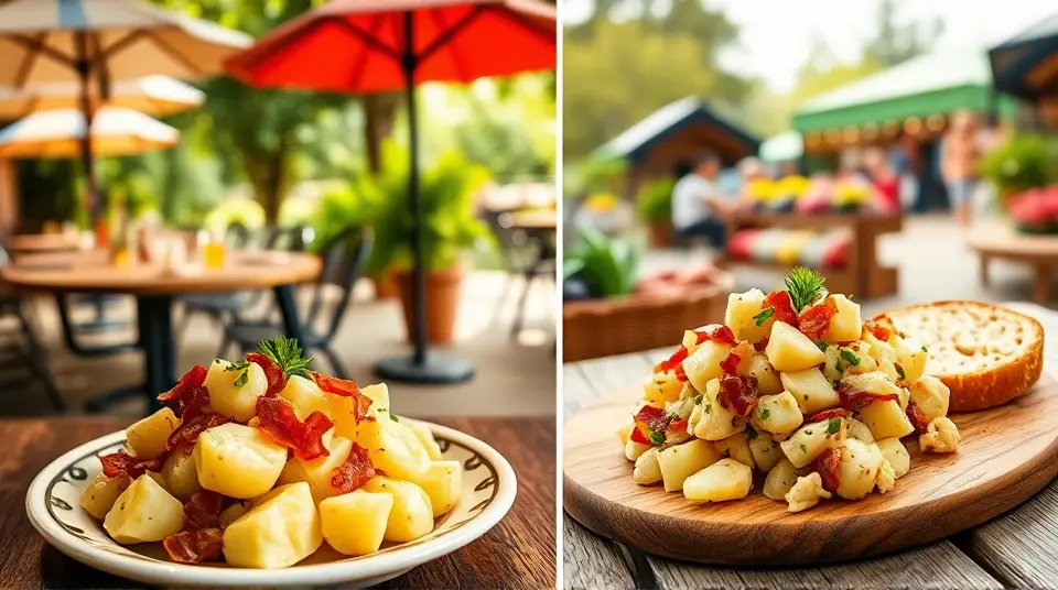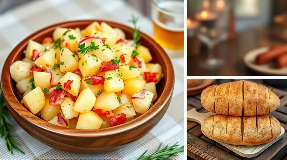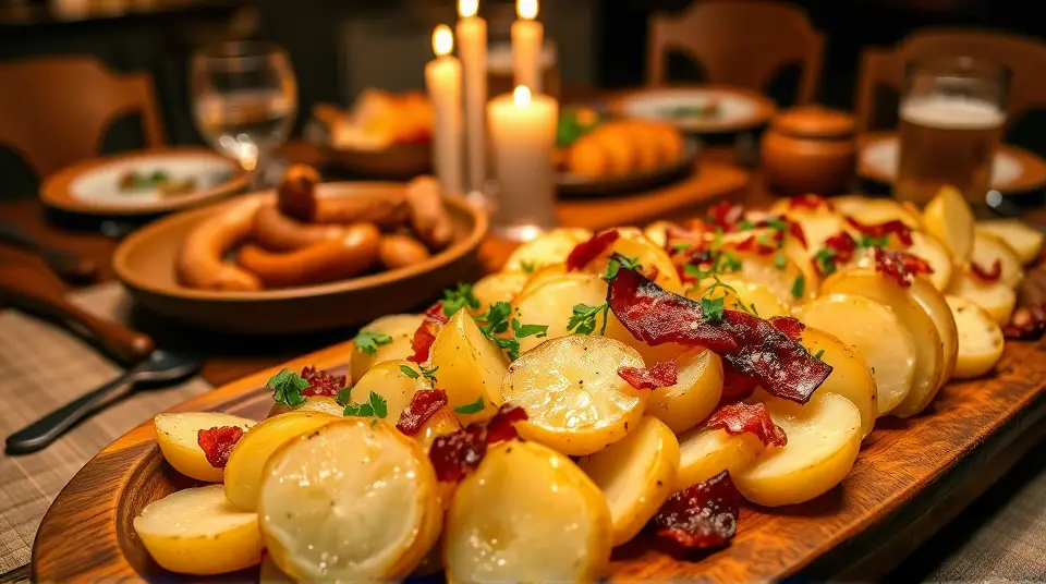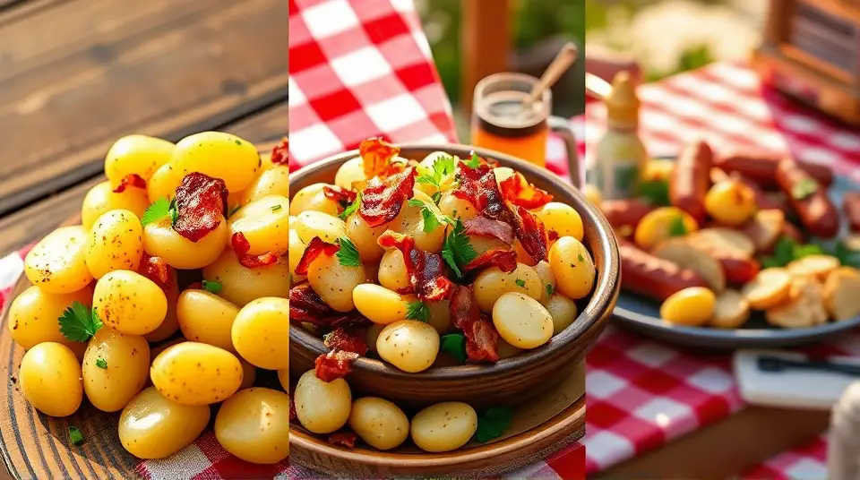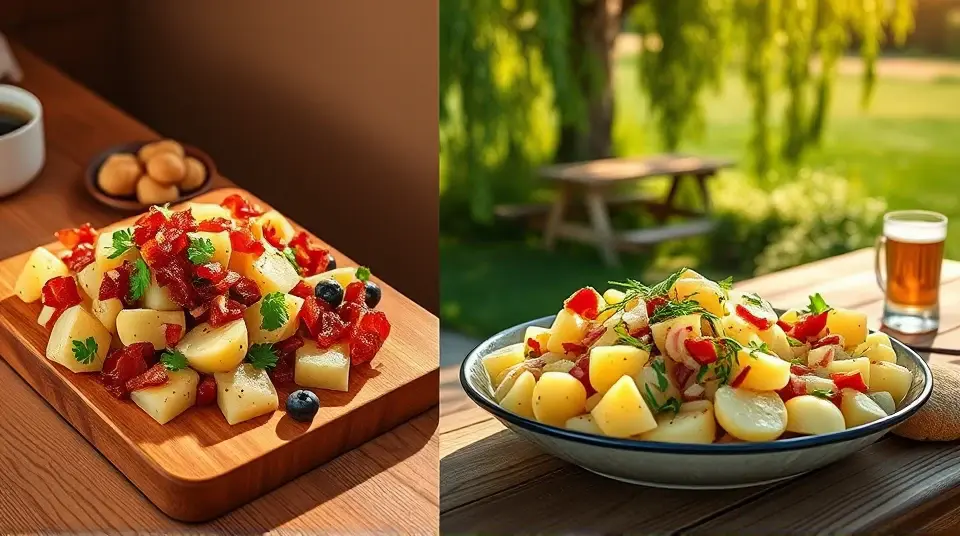 # Traditional German Potato Salad 🥔🇩🇪 This warm and tangy German Potato Salad is a delightful twist on the classic side dish! It's perfect for summer barbecues or as a comforting side during colder months. Unlike its American counterpart, this version is vinegar-based and features crispy bacon and fresh herbs, making it a savory and satisfying addition to any meal. Pair it with grilled sausages or roasted chicken for a true taste of Germany! 🍽️ ## Ingredients ### For the salad - 2 pounds of small waxy potatoes (like red or Yukon gold) - 4 slices of crispy bacon, chopped - 1/2 cup of red onion, finely diced - 1/4 cup of fresh parsley, chopped - 1/4 cup of chopped chives ### For the dressing - 1/3 cup of apple cider vinegar - 1/4 cup of vegetable oil - 1 tablespoon of Dijon mustard - 1 teaspoon of sugar - Salt and pepper to taste ## Instructions 1. Begin by washing the potatoes thoroughly. Place them in a large pot and cover with cold water. Bring to a boil and cook for 15-20 minutes or until fork-tender. Drain and let cool slightly. 2. While the potatoes are cooking, fry the bacon in a skillet over medium heat until crispy. Remove the bacon and set aside, keeping the drippings in the skillet. 3. In the same skillet, add the diced red onion to the bacon drippings and sauté until translucent, about 3-4 minutes. 4. In a small bowl, whisk together the apple cider vinegar, vegetable oil, Dijon mustard, sugar, salt, and pepper. 5. Once the potatoes are cool enough to handle, slice them into thick rounds and place them in a large bowl. > 🥔 Use small potatoes for the best results, as they hold their shape better in the salad and absorb the dressing beautifully. 6. Pour the warm onion and drippings over the potato slices, then drizzle the vinaigrette on top. Toss gently to coat the potatoes without breaking them apart. 7. Add the crispy bacon, parsley, and chives, then give everything a light toss again to combine. 8. Serve warm or at room temperature. Enjoy! > 🍽️ For added depth of flavor, let the salad sit for at least 30 minutes before serving to allow the dressing to soak into the potatoes. ## Variations - **Vegetarian**: Omit the bacon and substitute with olive oil for a lighter taste. Smoked paprika can be added for a depth of flavor. 🌱 - **Spicy Kick**: Add a chopped jalapeño or a sprinkle of red pepper flakes for a spicy twist that enhances the tanginess of the salad. 🔥 - **Herb-Heavy**: Experiment with different herbs like dill or tarragon to give it a unique twist. Each herb adds its own distinctive flavor! 🌿 - **High altitude**: Cooking times may be slightly shorter, so keep an eye on the potatoes to avoid overcooking them. This German Potato Salad is sure to please! It's a hearty option that brings the warmth and charm of traditional German cuisine to your table. Guten Appetit! 💚name