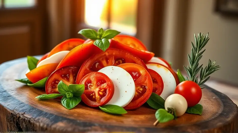 - On a serving platter, alternate layers of sliced tomatoes and mozzarella. Tuck fresh basil leaves between the layers for vibrant color and flavor.