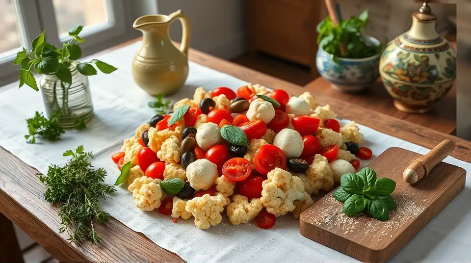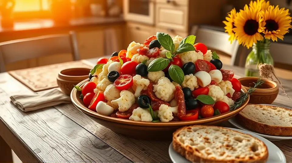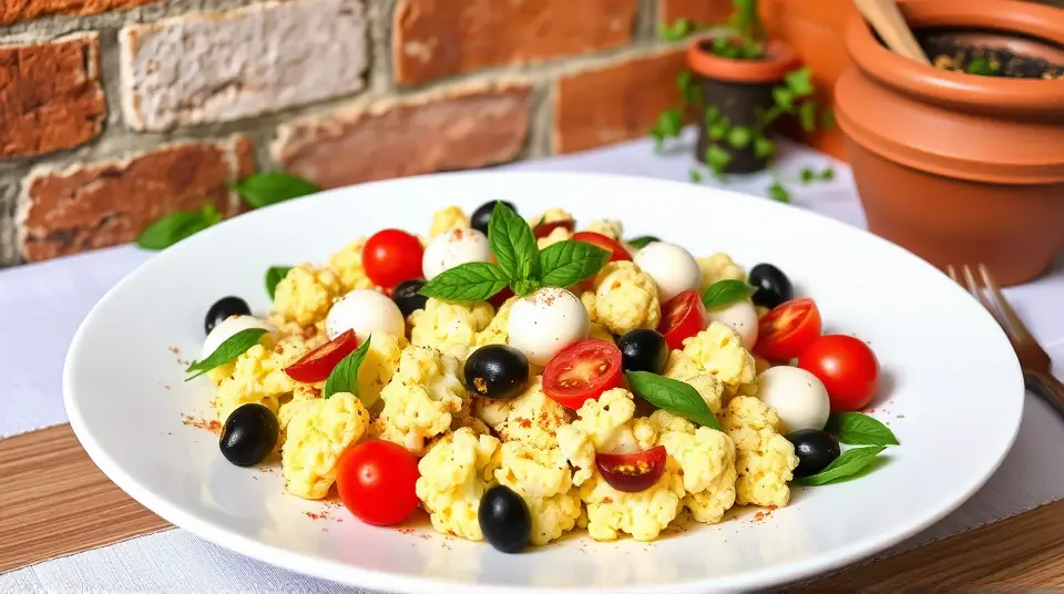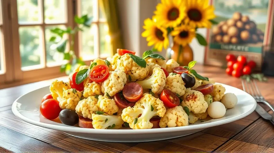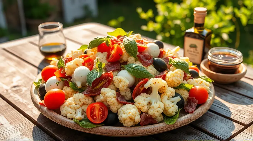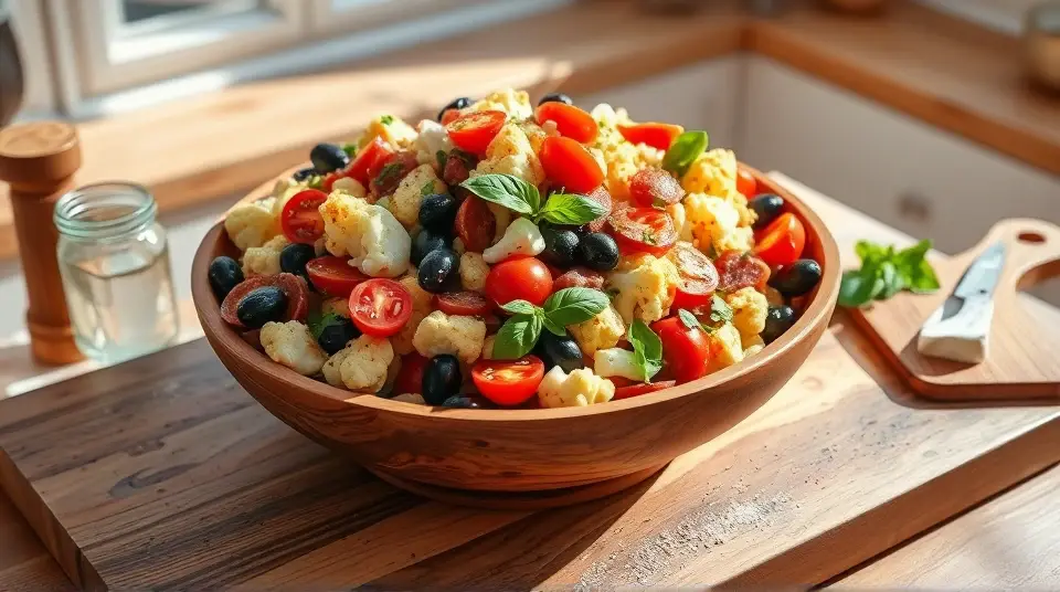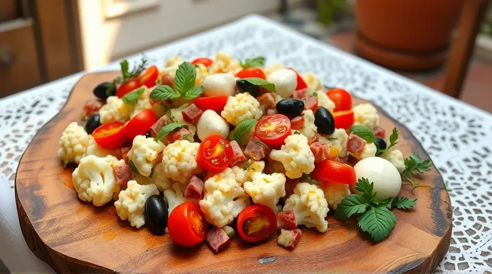 # Low Carb Marinated Cauliflower and Antipasto Salad π₯β¨ This vibrant and satisfying salad is a perfect low-carb option for any meal or gathering! Featuring crunchy marinated cauliflower, a medley of antipasto classics, and a zesty dressing, itβs packed with flavor and nutrition. You can enjoy it as a main dish or a hearty side salad. ## Ingredients ### For the salad - 1 medium head of cauliflower, cut into florets - 1 cup cherry tomatoes, halved - 1/2 cup Kalamata olives, pitted and sliced - 1/2 cup pepperoncini, sliced - 1/2 cup diced salami or pepperoni (optional) - 1/2 cup mozzarella balls, halved - Fresh basil leaves, for garnish ### For the marinade - 1/4 cup olive oil - 2 tablespoons red wine vinegar - 1 teaspoon dried oregano - 1 teaspoon garlic powder - 1 teaspoon crushed red pepper flakes (adjust for spice preference) - Salt and pepper to taste ## Instructions 1. **Blanch the cauliflower**: Bring a pot of salted water to a boil. Add the cauliflower florets and blanch for 2-3 minutes until tender-crisp. Drain and place in an ice bath to stop the cooking process. Let cool completely. 2. **Prepare the marinade**: In a small bowl, whisk together the olive oil, red wine vinegar, oregano, garlic powder, crushed red pepper flakes, salt, and pepper until well combined. 3. **Combine the salad ingredients**: In a large bowl, combine the cooled cauliflower florets, cherry tomatoes, olives, pepperoncini, salami (if using), and mozzarella balls. 4. **Dress the salad**: Pour the marinade over the salad mixture, tossing gently to ensure everything is coated evenly. 5. **Let it marinate**: Cover and refrigerate for at least 30 minutes (or up to 2 hours) to allow the flavors to meld. 6. **Serve**: Toss again before serving and garnish with fresh basil leaves. > π₯ This salad can be made ahead of time and actually tastes better after it marinates in the fridge! Just be sure to keep it covered to maintain freshness and flavor. ## Variations - **Extra Veggie**: Add diced bell peppers, artichoke hearts, or zucchini for extra crunch and color. - **Vegan**: Omit the salami and mozzarella, and add chickpeas for added protein. - **Herb Blend**: Fresh herbs like parsley or chives can be added for an extra burst of flavor. - **Creamy Twist**: Mix in a dollop of your favorite creamy dressing (like ranch or Caesar) for a richer taste. This Low Carb Marinated Cauliflower and Antipasto Salad is a delightful way to enjoy fresh flavors while staying on track with your low-carb goals. Enjoy your delicious creation! π π₯name