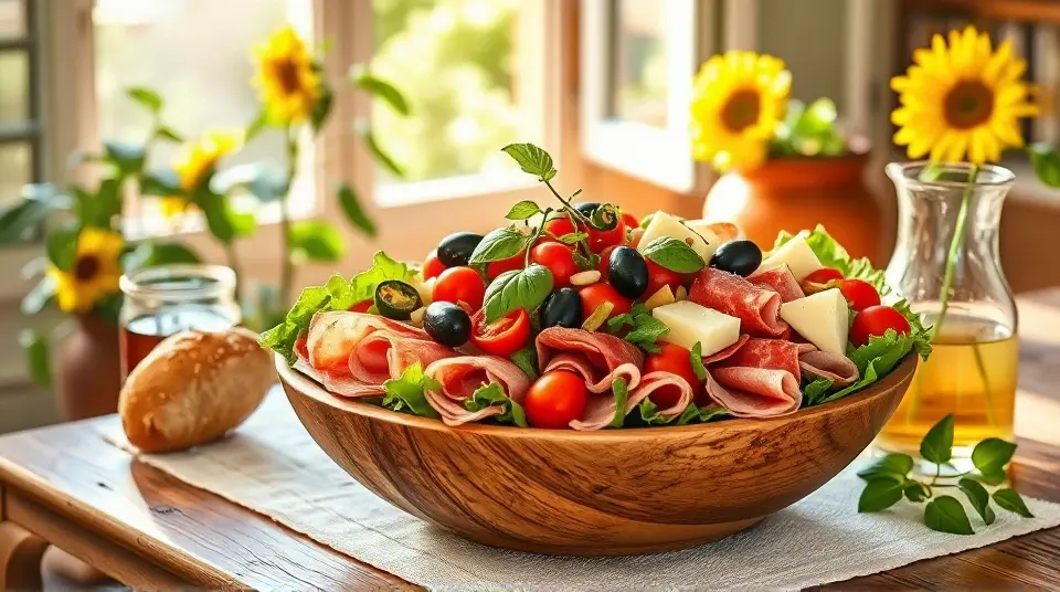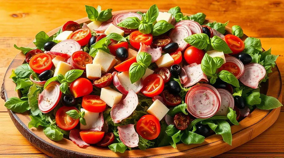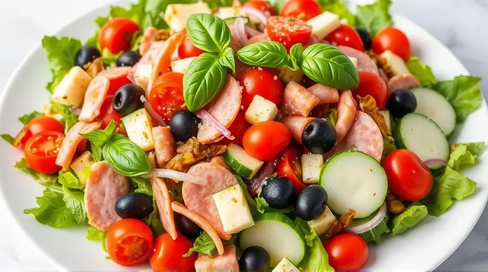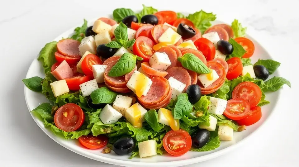 # Italian Sub Salad 🥗🇮🇹 This Italian Sub Salad is a vibrant and hearty dish that captures all the flavors of a classic Italian sub in an easy-to-make salad form. Perfect for lunch, dinner, or as a side for your next picnic! With a zesty dressing and colorful ingredients, this salad is both satisfying and refreshing. ## Ingredients ### For the salad - 4 cups of mixed salad greens (spring mix, arugula, or romaine) - 1/2 pound of genoa salami, sliced into strips - 1/2 pound of ham, sliced into strips - 1/2 pound of provolone cheese, cubed - 1 cup of cherry tomatoes, halved - 1/2 cup of pepperoncini peppers, sliced (or whole for garnish) - 1/2 cup of black olives, pitted and sliced (kalamata or green) - 1/4 red onion, thinly sliced - 1/2 cucumber, diced - Fresh basil leaves for garnish ### For the dressing - 1/4 cup of extra-virgin olive oil - 2 tablespoons of red wine vinegar - 1 teaspoon of dried oregano - 1 teaspoon of garlic powder - Salt and pepper to taste ## Instructions - In a large bowl, toss together the mixed salad greens, salami, ham, provolone cheese, cherry tomatoes, pepperoncini, black olives, red onion, and cucumber until evenly combined. > 🥗 For a more layered presentation, you can arrange the ingredients in neat rows over the greens. This will make the salad visually stunning! - In a separate bowl, whisk together the extra-virgin olive oil, red wine vinegar, oregano, garlic powder, salt, and pepper until well blended. - Drizzle the dressing over the salad just before serving and toss gently to coat. > 🍋 You can adjust the acidity of the dressing by adding more vinegar or a splash of lemon juice if you prefer a zingier flavor. - Garnish with fresh basil leaves for an added touch of flavor and color. ## Variations - **Low-carb**: Skip the cheese and add more veggies like bell peppers and zucchini for a veggie-packed salad. - **Vegan**: Substitute the salami and ham with marinated tofu or chickpeas and use a vegan cheese alternative or omit cheese entirely. - **Spicy kick**: Add sliced jalapeños or crushed red pepper flakes to the salad for that extra heat! - **Pasta addition**: Mix in cooked pasta, such as rotini or fusilli, for a heartier salad that’s perfect as a main dish. Enjoy your Italian Sub Salad as a delicious, colorful meal that brings all the flavors of an Italian deli right to your table! 🥳✨Images