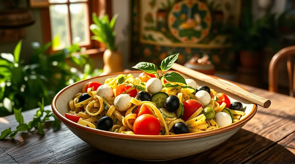 - Combine ingredients: In a large mixing bowl, combine the cooled pasta, cherry tomatoes, cucumber, bell peppers, olives, red onion, mozzarella, and basil. Pour the pesto dressing over the top and toss gently until everything is evenly coated.