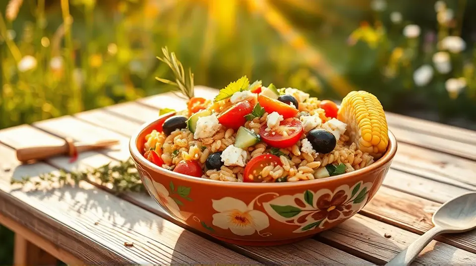Combine the salad: In a large bowl, mix the cooked orzo with cherry tomatoes, cucumber, bell pepper, red onion, corn, olives, feta cheese, and fresh basil.