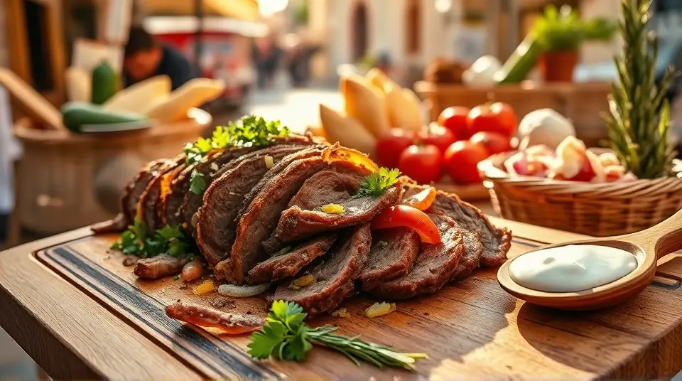 # Slow-Roasted Gyro Meat (the Slow Way) 🥙🍖 This recipe for gyro meat takes its time to develop deep, savory flavors that will transport you straight to a bustling street market in Greece! The key to this dish is the slow roasting which allows the spices to meld beautifully while keeping the meat juicy and tender. Once you dip it in tzatziki sauce and wrap it in warm pita, you'll feel like you're enjoying an authentic Mediterranean feast! 🍽️ ## Ingredients ### For the gyro meat - 2 lbs of lamb (leg or shoulder), trimmed and cubed - 1 lb of beef (chuck or brisket), trimmed and cubed - 1 tablespoon of olive oil - 1 medium onion, diced - 4 cloves of garlic, minced - 2 teaspoons of ground cumin - 2 teaspoons of dried oregano - 1 teaspoon of ground coriander - 1 teaspoon of smoked paprika - 1/2 teaspoon of ground cinnamon - Salt and black pepper to taste - Zest of 1 lemon - 1/4 cup of fresh parsley, chopped ### For serving - Pita bread - Tzatziki sauce - Sliced tomatoes - Diced cucumbers - Red onion, thinly sliced - Feta cheese (optional) ## Instructions 1. **Prepare the meat**: In a large bowl, combine the lamb and beef cubes. Drizzle the olive oil over the meat and sprinkle with salt and black pepper. Toss well to coat evenly. 2. **Sauté the aromatics**: In a large skillet over medium heat, sauté the onion until translucent, about 5-7 minutes. Add the minced garlic and cook for another minute until fragrant. > 🔪 If you want to save time, you can skip the sautéing step and add raw onions and garlic directly into the food processor later, but the sautéing adds a lovely depth of flavor! 3. **Mix the spices**: In a small bowl, mix together the cumin, oregano, coriander, smoked paprika, cinnamon, lemon zest, and parsley. Combine the sautéed onions and garlic with the spice mixture and mix thoroughly. 4. **Blend the mixture**: In a food processor, add your meat mixture along with the onion spice blend. Pulse until the mixture is well combined but still slightly chunky. This will help the meat hold its shape during cooking. > 🚨 Don’t overprocess! This will lead to a mushy texture instead of the desired meaty bite. 5. **Shape the gyro loaf**: Transfer the meat mixture to a loaf pan or shape it into a loaf on a lined baking sheet. Cover tightly with aluminum foil. 6. **Slow roast**: Preheat your oven to 325°F (160°C). Place the loaf in the oven and cook for about 2 to 2.5 hours, or until the internal temperature reaches 165°F (74°C). > ⏳ Slow cooking is key! The gradual cooking allows the flavors to develop fully and ensures the meat stays juicy. 7. **Create gyros**: Once cooked, let the gyro meat rest for 15-20 minutes. Slice thinly and serve in warm pita bread, topped with tzatziki sauce, fresh tomatoes, cucumbers, red onion, and a sprinkle of feta cheese if desired. > 🌿 For an extra punch of flavor, drizzle a little olive oil and squeeze some fresh lemon juice over the toppings before wrapping it all up! ## Variations - **Spicy**: Add a pinch of cayenne pepper or crushed red pepper flakes to the spice blend for a spicy kick! 🌶️ - **Vegetarian option**: Use a blend of grilled mushrooms and eggplant with the same spice mixture and cook similarly until it holds together. - **Wrap it up**: Instead of pitas, try wrapping the gyro meat in lavash or tortillas for a different twist! - **Freezer friendly**: Slice and freeze leftover gyro meat in portions for an easy meal later on. Just reheat in the oven for a perfect gyro in a pinch! Now gather your favorite ingredients and give this slow-roasted gyro meat a try. All it takes is a little patience for meaty perfection! 🎉Images