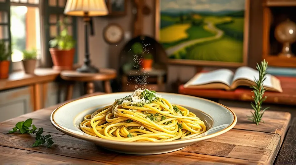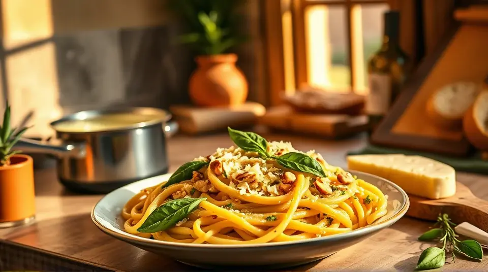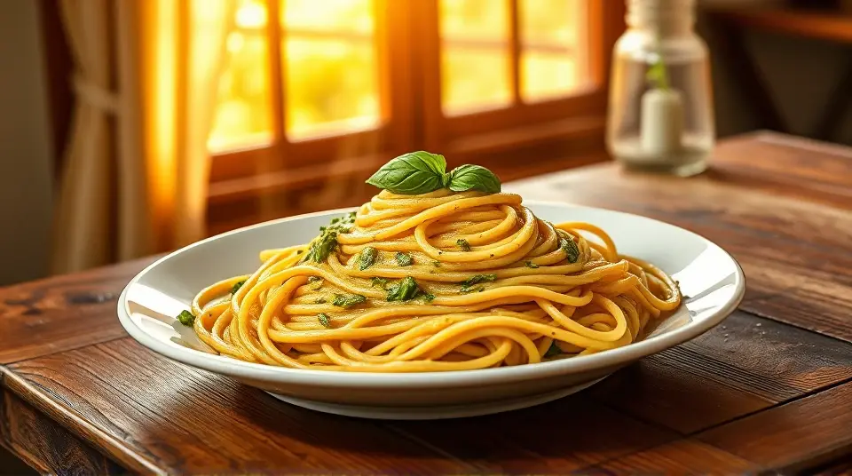 # Creamy Pesto Pasta 🍝🌿 This Creamy Pesto Pasta is a delightful dish that combines the fresh, vibrant flavors of homemade pesto with a rich, creamy sauce. It's perfect for a weeknight dinner or a special occasion. The combination of basil, garlic, and Parmesan creates a flavorful foundation, while the cream adds a delightful smoothness that clings perfectly to your pasta. This dish is sure to impress your family and friends! ## Ingredients ### For the pesto - 2 cups fresh basil leaves - 1/2 cup grated Parmesan cheese - 1/3 cup pine nuts (or walnuts) - 3 cloves garlic - 1/2 cup extra-virgin olive oil - Salt and pepper to taste ### For the pasta - 12 oz spaghetti or your favorite pasta - 1 cup heavy cream - 1/2 cup sun-dried tomatoes, chopped (optional) - 1/2 teaspoon red pepper flakes (optional, for a kick) - Fresh basil leaves for garnish ## Instructions 1. **Make the pesto**: In a food processor, combine basil leaves, Parmesan cheese, pine nuts, and garlic. Pulse until finely chopped. > 🌰 For an added depth of flavor, consider toasting the pine nuts lightly before adding them to the pesto. Just a few minutes in a dry pan on medium heat will do the trick! 2. Slowly drizzle in the olive oil while the food processor is running until the mixture is smooth. Season with salt and pepper to taste. 3. **Cook the pasta**: Bring a large pot of salted water to a boil. Add your pasta and cook according to package instructions until al dente. Reserve about 1 cup of the pasta water, then drain the pasta. 4. **Combine the sauce**: In the same pot, reduce the heat to medium and stir in the heavy cream. Allow it to simmer for a few minutes until slightly thickened. 5. **Mix it all together**: Add the prepared pesto to the cream and stir until well combined. If desired, add in the chopped sun-dried tomatoes and red pepper flakes at this point. > 🥄 If the sauce is too thick, gradually add some reserved pasta water until you achieve your desired consistency. 6. **Toss**: Add the drained pasta to the pot and toss until coated evenly in the creamy pesto sauce. 7. **Serve**: Plate the pasta and garnish with fresh basil leaves and extra Parmesan cheese. > 🌟 For an extra touch, drizzle a little olive oil on top before serving—it's a simple but elegant enhancement! ## Variations - **Protein-packed**: Add grilled chicken, shrimp, or sautéed mushrooms for added protein. This will make the dish heartier and even more satisfying. 🍗🍤 - **Vegetable boost**: Toss in some steamed broccoli, spinach, or asparagus to add color and nutrients to the dish. 🥦 - **Spicy twist**: Add chopped jalapeños or a few dashes of your favorite hot sauce for a spicy kick! 🌶️ - **Dairy-free**: Substitute heavy cream with coconut cream and use a dairy-free cheese alternative for a creamy vegan version. Enjoy your Creamy Pesto Pasta that's not only delicious but also boasts the freshness of garden ingredients! 🍽️💚Images