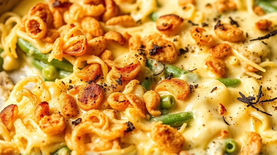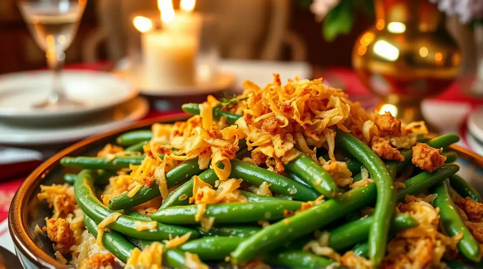 # Classic Green Bean Casserole 🥫🌱 This beloved dish is a holiday staple that combines tender green beans, savory cream of mushroom soup, and crunchy fried onions. It's warmly comforting and sure to impress your family and friends every time it's served! Plus, it's versatile enough to adapt to seasonal variations. Pair it with roasted turkey or your favorite meat dish for a festive meal that everyone will love! 🎉🥧 ## Ingredients ### For the Casserole - 1 lb fresh green beans (or 2 cans of green beans if you're short on time) - 1 can (10.5 oz) cream of mushroom soup - 3/4 cup milk - 1/2 tsp soy sauce - Salt and pepper to taste - 1 cup shredded cheddar cheese (optional for a cheesy twist) ### For the Topping - 1 1/2 cups crispy fried onions - 1/4 tsp garlic powder (optional) - 1/4 tsp black pepper ## Instructions 1. Preheat your oven to 350°F (175°C). 2. If using fresh green beans, wash and trim the ends. Blanch them in boiling water for about 5 minutes until they turn bright green; then, drain and place them in ice water to stop cooking. 3. In a large mixing bowl, combine the cream of mushroom soup, milk, soy sauce, salt, pepper, and garlic powder. Stir until well blended. > 🥄 For extra flavor, you can use homemade cream of mushroom soup instead of canned. Just sauté some fresh mushrooms with garlic and blend it with cream for a richer sauce! 4. Add the green beans to the soup mixture and fold gently to coat them evenly. If you like a cheesy casserole, mix in half of the shredded cheddar cheese at this stage. 5. Transfer the green bean mixture to a greased 1.5 quart baking dish and spread it out evenly. 6. Bake it in the preheated oven for 25 minutes. 7. After 25 minutes, remove the casserole and sprinkle the crispy fried onions (and remaining cheese, if using) evenly over the top. Return it to the oven and bake for an additional 10-15 minutes until the onions are golden brown and crispy. > 🧊 For an added touch of freshness, consider mixing in some sautéed mushrooms or diced red bell peppers into the casserole just before baking. ## Variations - **Vegan**: Substitute the cream of mushroom soup with a homemade vegan cream sauce (made from blended cashews) and use dairy-free fried onions. - **Gluten-free**: Ensure the cream of mushroom soup is gluten-free or make your own. Check your fried onions packaging as well! - **Herb Lover**: Add a teaspoon of fresh thyme or rosemary to the soup mixture for an aromatic twist. - **Cheesy Delight**: Top with your favorite melty cheese like Gruyère or Monterey Jack instead of cheddar for a different flavor profile. This Classic Green Bean Casserole is not just a side dish; it's a tradition that brings a sense of comfort to any meal. Enjoy! 🍽️🌟Images