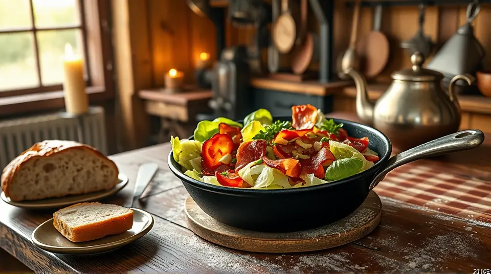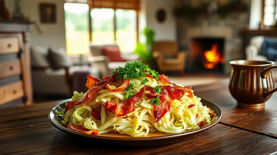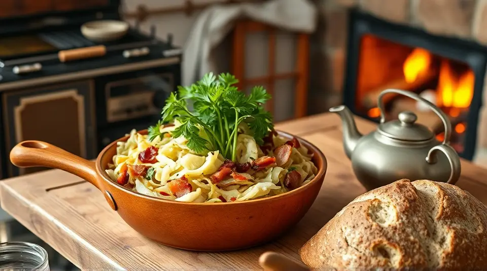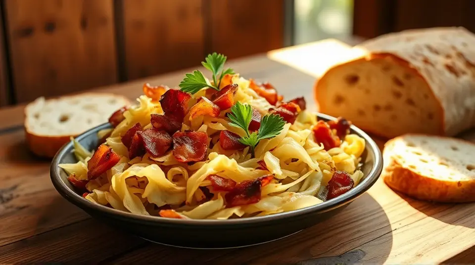 # Irish Cabbage and Bacon 🥬🥓 This hearty and comforting dish brings a taste of traditional Irish cuisine right to your table. The sweet, earthy flavors of cabbage are beautifully complemented by the rich, savory notes of bacon. It's an easy-to-make recipe that captures the essence of home-cooked goodness, perfect for a cozy dinner or as a side dish for any festive gathering. Pair it with a slice of crusty bread for a complete meal! 🍞 ## Ingredients ### For the dish - 1 small head of green cabbage, shredded - 6 oz (170g) of thick-cut bacon, diced - 1 medium onion, thinly sliced - 2 cloves of garlic, minced - 1 cup of chicken or vegetable broth - Salt and pepper to taste - A pinch of red pepper flakes (optional) ### For garnish - Fresh parsley, chopped - A drizzle of good-quality olive oil (optional) ## Instructions 1. In a large skillet or pot, cook the diced bacon over medium heat until it becomes crispy. Remove the bacon and set it aside, leaving the rendered fat in the pan. > 🔥 This fat is packed with flavor, so don’t get rid of it! It will help to infuse the cabbage and other ingredients. 2. In the same skillet, add the sliced onion and sauté until it turns translucent, about 5 minutes. Then, add the minced garlic and cook for another minute until fragrant. 3. Stir in the shredded cabbage, cooking for about 5-7 minutes, until it begins to wilt. 4. Pour in the chicken or vegetable broth, and season with salt, pepper, and red pepper flakes if using. Mix well, ensuring the cabbage is well coated. 5. Bring the mixture to a simmer, cover the skillet, and reduce the heat to low. Allow it to cook for about 15 minutes, stirring occasionally, until the cabbage is tender and the flavors meld together. 6. Return the cooked bacon to the skillet, mix thoroughly, and let it heat through for another 2-3 minutes. 7. Garnish with fresh parsley and a drizzle of olive oil if desired. Serve warm! > 🥄 This dish can be made ahead of time and reheated, as the flavors deepen over time! ## Variations - **Add some spice**: Mix in some chopped jalapeños or a splash of hot sauce for a zesty kick! 🌶️ - **Meat-free**: Substitute the bacon with smoky tempeh or mushrooms for a vegan-friendly version. - **Extra veggies**: Feel free to throw in some diced potatoes, carrots, or bell peppers for added nutrition and flavor. - **Herby twist**: Consider adding a tablespoon of fresh thyme or dill while cooking for an aromatic touch. Enjoy this classic dish that combines simplicity with hearty flavors! 🌍🥳Images
