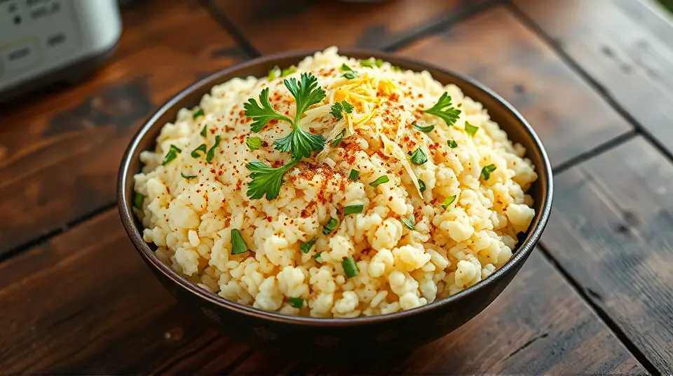 - Transfer the Garlic Parmesan Cauliflower Rice to a serving dish and garnish with fresh parsley.