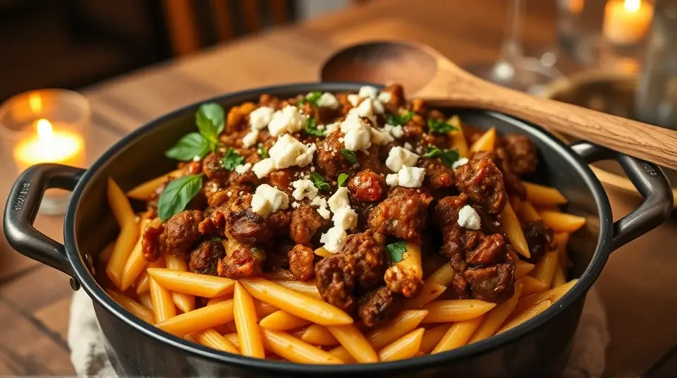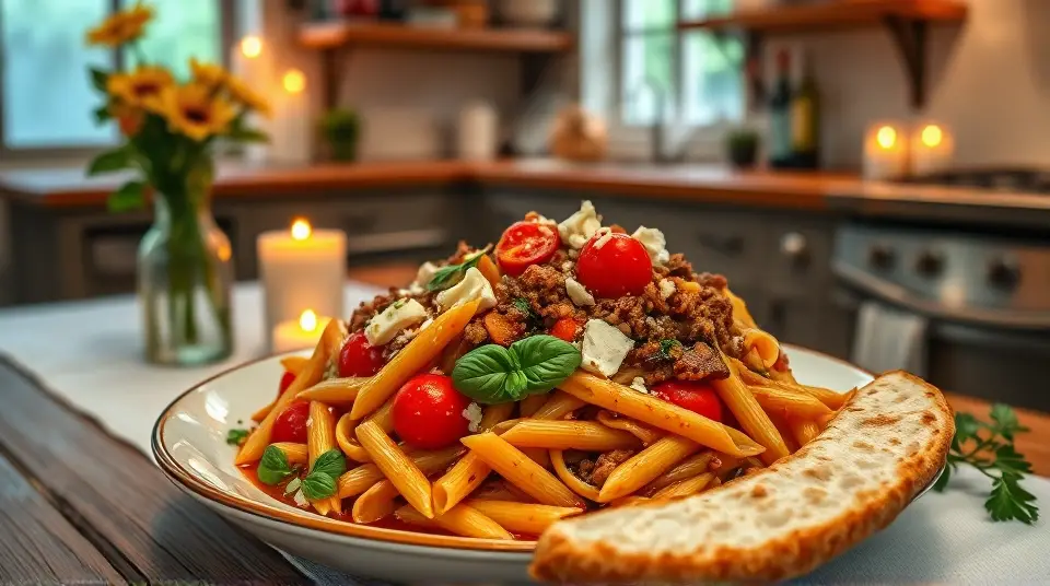 # Mediterranean Ground Lamb Pasta One-Pot Dinner 🍝🇬🇷 This Mediterranean-inspired one-pot dinner is a delightful way to combine the rich flavors of ground lamb with al dente pasta and fresh vegetables. It’s hearty, comforting, and packed with Mediterranean goodness! Perfect for a weeknight meal that feels gourmet without the fuss. Pair it with a Greek salad or some garlic bread for an unforgettable dinner experience. 🥗🍞 ## Ingredients ### For the pasta - 1 pound ground lamb - 12 oz. penne pasta (whole wheat or regular) - 1 medium onion, diced - 3 cloves garlic, minced - 1 red bell pepper, diced - 1 zucchini, sliced - 1 cup cherry tomatoes, halved - 2 cups low-sodium chicken or vegetable broth - 1 tablespoon olive oil - 1 teaspoon dried oregano - 1 teaspoon ground cumin - 1 teaspoon smoked paprika - Salt and pepper to taste - 1/4 cup feta cheese, crumbled (optional) - Fresh basil or parsley for garnish ## Instructions 1. **Sauté the Lamb**: In a large pot, heat olive oil over medium heat. Add the ground lamb and cook until browned. Break it apart with a wooden spoon as it cooks. Season with salt, pepper, oregano, cumin, and smoked paprika. > 🍳 Don't rush the browning process; it enhances the flavor of the lamb. 2. **Add Aromatics**: Once the lamb is browned, add diced onion and minced garlic. Sauté for about 3-4 minutes until the onion is translucent and fragrant. 3. **Incorporate Vegetables**: Add the bell pepper, zucchini, and cherry tomatoes to the pot. Stir well and cook for another 2-3 minutes until the vegetables start to soften. 4. **Cook the Pasta**: Pour in the broth and add the penne pasta. Stir to combine, then bring to a boil. Reduce heat to a simmer, cover, and cook for about 12-15 minutes, or until the pasta is al dente and has absorbed most of the broth, stirring occasionally. > 🕒 If the pasta absorbs too much broth before it’s fully cooked, just add a splash of water or broth to keep it from drying out. 5. **Finish and Serve**: Once pasta is cooked to your liking, remove from heat and stir in the crumbled feta cheese if using. Taste and adjust seasoning if necessary. Garnish with chopped basil or parsley before serving. > 🧀 The feta adds a delightful creaminess and tang that complements the flavors beautifully. ## Variations - **Vegetarian**: Substitute ground lamb with lentils or chickpeas for a hearty, meat-free option. - **Spicy**: Add red pepper flakes or a pinch of cayenne pepper to the lamb while cooking for a spicy kick! 🌶️ - **Pasta Choices**: Feel free to use other pasta shapes like orzo, fusilli, or even gluten-free pasta. - **Extra Veggies**: Sneak in more veggies like spinach, mushrooms, or artichoke hearts to boost nutrition and flavor. This Mediterranean Ground Lamb Pasta One-Pot Dinner is sure to impress everyone at the table! Enjoy the journey of flavors with each delicious bite! 😋🍽️Images