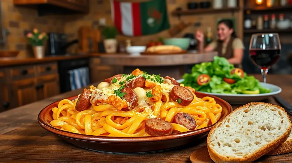 # Cheese Smoked Sausage Pasta 🧀🌭🍝 This delightful Cheese Smoked Sausage Pasta is a hearty and flavorful dish that's perfect for any weeknight dinner or casual gathering. It's creamy, cheesy, and packed with smoky sausage goodness. You can easily customize it with your favorite veggies or switch up the cheese for a personal touch! ## Ingredients ### For the pasta - 12 oz of your favorite pasta (e.g., penne, fusilli, or bow tie) - 1 tbsp olive oil - 1 medium onion, diced - 3 cloves garlic, minced - 12 oz smoked sausage, sliced (kielbasa or andouille work well) ### For the cheese sauce - 2 cups heavy cream - 1 cup shredded cheddar cheese - 1 cup shredded mozzarella cheese - 1/2 cup grated Parmesan cheese - 1 tsp paprika - 1/2 tsp garlic powder - Salt and pepper to taste ### For the garnish - Fresh parsley, chopped - Additional cheese for topping (optional) ## Instructions 1. **Cook the Pasta:** Start by boiling a large pot of salted water. Add the pasta and cook according to package instructions until al dente. Drain and set aside. > 🍳 Make sure to reserve about 1/2 cup of pasta water. It can help loosen the sauce if it gets too thick. 2. **Sauté the Vegetables and Sausage:** In a large skillet, heat the olive oil over medium heat. Add the diced onion and sauté until translucent (about 3-4 minutes). Stir in the minced garlic and cook for an additional minute. 3. **Add the Sausage:** Toss the sliced smoked sausage into the skillet, mixing it with the onion and garlic. Cook until the sausage is browned and heated through, about 5-7 minutes. 4. **Prepare the Cheese Sauce:** In a separate saucepan, pour in the heavy cream and bring to a simmer over medium heat. Gradually stir in the cheddar, mozzarella, and Parmesan cheese until melted and smooth. Add the paprika, garlic powder, salt, and pepper, adjusting the seasoning to taste. 5. **Combine Everything:** Add the cooked pasta to the skillet with the sausage and vegetables. Pour the cheese sauce over the pasta mixture and stir until everything is well coated. If the sauce is too thick, add a splash of the reserved pasta water until desired consistency is achieved. 6. **Serve and Garnish:** Divide the Cheese Smoked Sausage Pasta into bowls, garnishing with chopped parsley and additional cheese, if desired. > 🍽️ This dish is best served hot and can be accompanied by garlic bread or a simple salad to round out the meal. ## Variations - **Vegetable Boost:** Toss in some spinach, bell peppers, or cherry tomatoes for extra nutrition. Sauté them along with the onions for added flavor! - **Spice it Up:** Add a pinch of cayenne pepper or hot sauce to the cheese sauce for a spicy kick. 🔥 - **Cheese Lovers:** Experiment with different cheeses like gouda or pepper jack for a distinct flavor twist. - **Low-Carb:** Substitute the pasta with zucchini noodles or spaghetti squash for a healthier option. Enjoy your creamy and savory Cheese Smoked Sausage Pasta! 🍝🧀🌶️Images