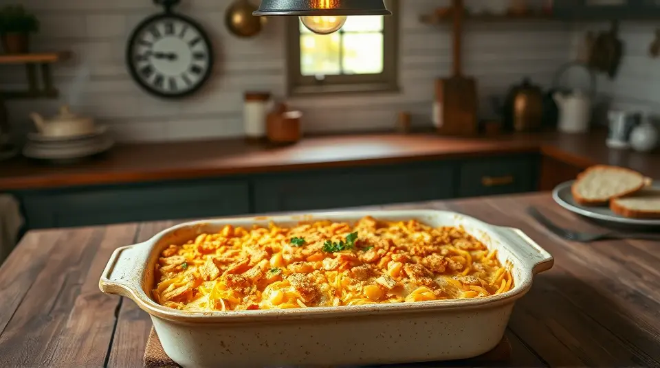 # Comforting Chicken Noodle Soup Casserole 🍲🥘 This delightful dish turns the classic chicken noodle soup into a hearty casserole that’s packed with flavor and perfect for chilly nights. With tender chicken, comforting noodles, and a creamy sauce, it’s a dish that will warm both your heart and your belly. Serve it with some crusty bread for a complete meal! 🍞🥰 ## Ingredients ### For the casserole - 2 cups cooked chicken, shredded - 3 cups egg noodles - 4 cups chicken broth - 1 cup heavy cream - 1 cup frozen mixed vegetables (carrots, peas, corn) - 1 small onion, diced - 3 cloves garlic, minced - 1 teaspoon dried thyme - 1 teaspoon dried parsley - Salt and pepper to taste - 1 tablespoon olive oil ### For the topping - 1 ½ cups shredded cheddar cheese - 1 cup crushed buttery crackers (like Ritz) - 2 tablespoons melted butter - Fresh parsley for garnish (optional) ## Instructions 1. **Preheat your oven**: Begin by preheating your oven to 350°F (175°C). 2. **Cook the noodles**: In a large pot, bring water to a boil. Add the egg noodles and cook according to package directions until al dente. Drain and set aside. 3. **Sauté the aromatics**: In a large skillet, heat olive oil over medium heat. Add the onion and garlic, and sauté until the onion is translucent, about 3-4 minutes. 4. **Combine the filling**: In a large mixing bowl, combine the shredded chicken, cooked noodles, sautéed onions and garlic, frozen vegetables, chicken broth, heavy cream, thyme, parsley, salt, and pepper. Stir until everything is evenly coated. > 🥄 Make sure to taste and adjust the seasoning as desired. You can add more thyme or even a splash of lemon juice for a bright flavor! 5. **Transfer to baking dish**: Pour the mixture into a greased 9x13 inch baking dish, spreading it out evenly. 6. **Prepare the topping**: In a small bowl, combine crushed crackers and melted butter. Mix until the crackers are evenly coated. 7. **Assemble the casserole**: Sprinkle the cracker mixture evenly over the top of the casserole, then add the shredded cheddar cheese on top. 8. **Bake**: Place the casserole in the preheated oven and bake for 30-35 minutes, or until the cheese is bubbly and the top is golden brown. 9. **Serve**: Once out of the oven, let the casserole cool for a few minutes. Garnish with fresh parsley if desired, and scoop onto plates. > 🧊 Be mindful not to rush the cooling time; let it sit for about 5-10 minutes. This will help the casserole set, making it easier to serve! ## Variations - **Vegetarian**: Replace chicken with sautéed mushrooms and tofu. Use vegetable broth instead of chicken broth for a plant-based option! 🍄 - **Spicy**: Add a dash of cayenne pepper or some diced jalapeños for a zesty kick! - **Cheesy**: Mix in a variety of cheeses, such as mozzarella or Monterey Jack, for a melty, gooey experience. - **High altitude**: When baking at higher altitudes, your casserole may need a few more minutes to cook through—keep an eye on the cheese to prevent burning. Enjoy your comforting Chicken Noodle Soup Casserole with loved ones for a cozy meal that feels just like home! 🏠❤️Images