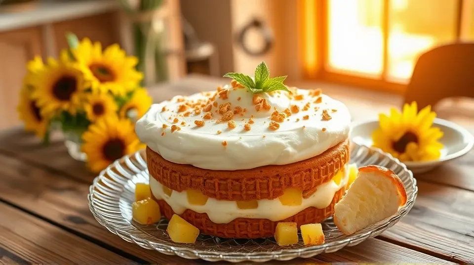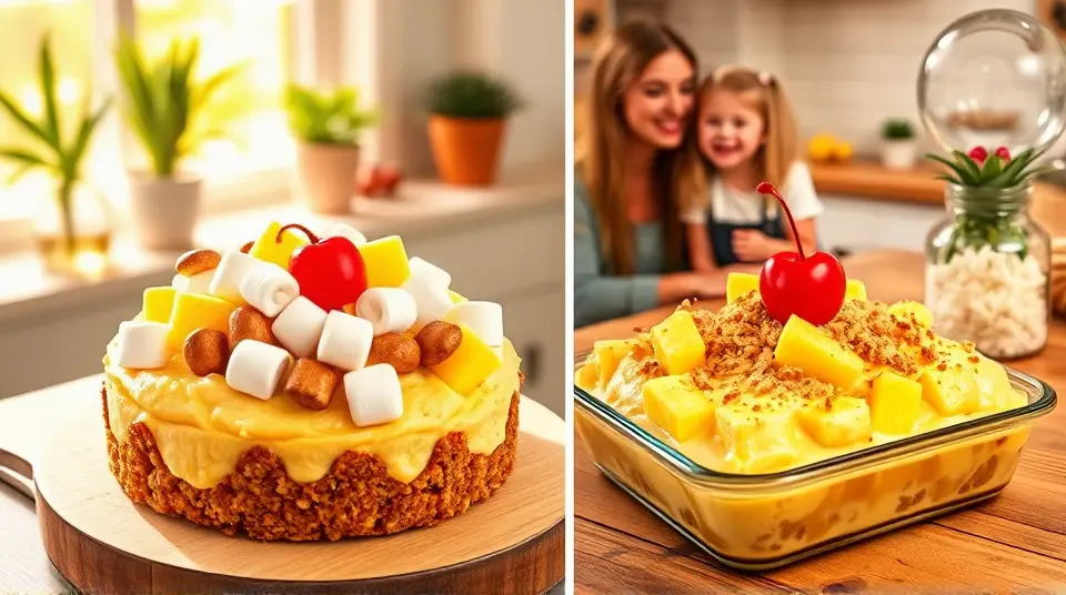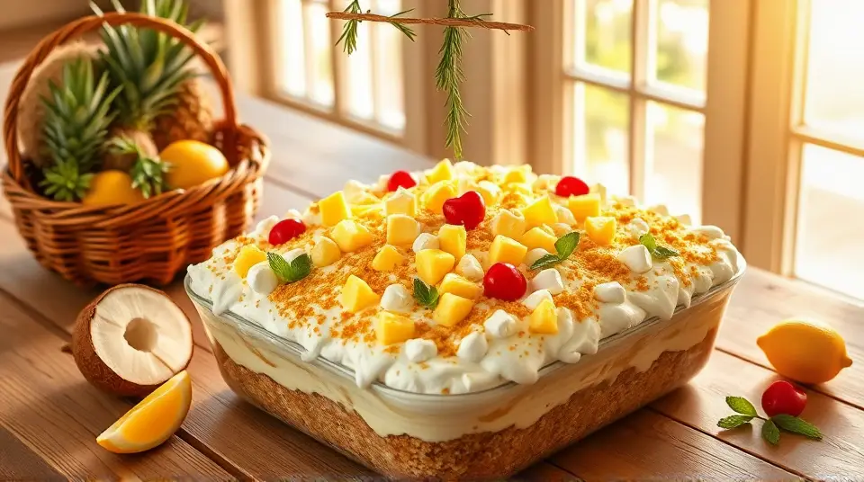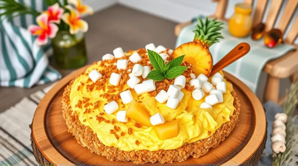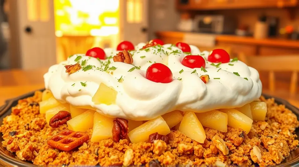 # Pineapple Pretzel Fluff 🍍🥨 This delightful Pineapple Pretzel Fluff is a playful and refreshing dessert that's sure to impress your guests! The combination of sweet, tangy pineapple and the salty crunch of pretzels creates a wonderfully unique flavor and texture. Perfect as a side dish for summer picnics or as a light dessert for any occasion, this fluff is both easy to make and incredibly satisfying! ## Ingredients ### For the base - 2 cups of crushed pretzels - 1/2 cup of unsalted butter, melted - 1/4 cup of granulated sugar ### For the fluff - 1 (20 oz) can of crushed pineapple, drained - 1 (8 oz) package of cream cheese, softened - 1 cup of powdered sugar - 1 (8 oz) tub of whipped topping (like Cool Whip) - 1/2 cup of mini marshmallows ### For garnish - Extra crushed pretzels - Fresh pineapple chunks - Optional: Maraschino cherries 🍒 ## Instructions 1. **Prepare the crust**: In a mixing bowl, combine the crushed pretzels, melted butter, and granulated sugar. Mix until the pretzels are well-coated. Press the mixture into the bottom of a greased 9x13 inch baking dish to create a crust. 2. **Bake the crust**: Preheat your oven to 350°F (175°C). Bake the pretzel crust for about 10 minutes or until golden brown. Remove from the oven and let it cool completely. 3. **Make the fluff**: In a large mixing bowl, beat together the softened cream cheese and powdered sugar until smooth and creamy. > 🥄 Make sure the cream cheese is at room temperature to avoid lumps, which will give your fluff a silky texture. 4. **Combine ingredients**: Gently fold in the drained crushed pineapple, whipped topping, and mini marshmallows until everything is well incorporated. 5. **Assemble the dessert**: Once the pretzel crust is cooled, spread the pineapple fluff mixture evenly over the top. 6. **Chill**: Cover the dish with plastic wrap or a lid and refrigerate for at least 2 hours before serving. This allows the flavors to meld together beautifully! 7. **Serve**: Before serving, sprinkle additional crushed pretzels on top for extra crunch and garnish with fresh pineapple chunks and maraschino cherries, if desired. > 🍍 For an extra tropical twist, add toasted coconut flakes to the fluff or as a garnish! ## Variations - **Coconut Lover**: Add in 1/2 cup of shredded coconut to the fluff mixture for a delightful coconut flavor. - **Berry Twist**: Substitute half of the crushed pineapple with diced strawberries or blueberries for a fruity flair. - **Nutty Touch**: Mix in 1/4 cup of chopped pecans or walnuts for added texture and flavor. - **Vegetarian/Vegan**: Use coconut cream or a dairy-free cream cheese alternative along with a plant-based whipped topping to make it vegan-friendly. This Pineapple Pretzel Fluff is not just a dessert; it's a fun and vibrant treat that brings a taste of the tropics right to your table! Enjoy! 🌴✨Images