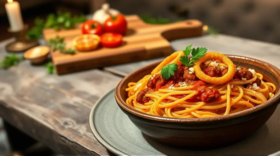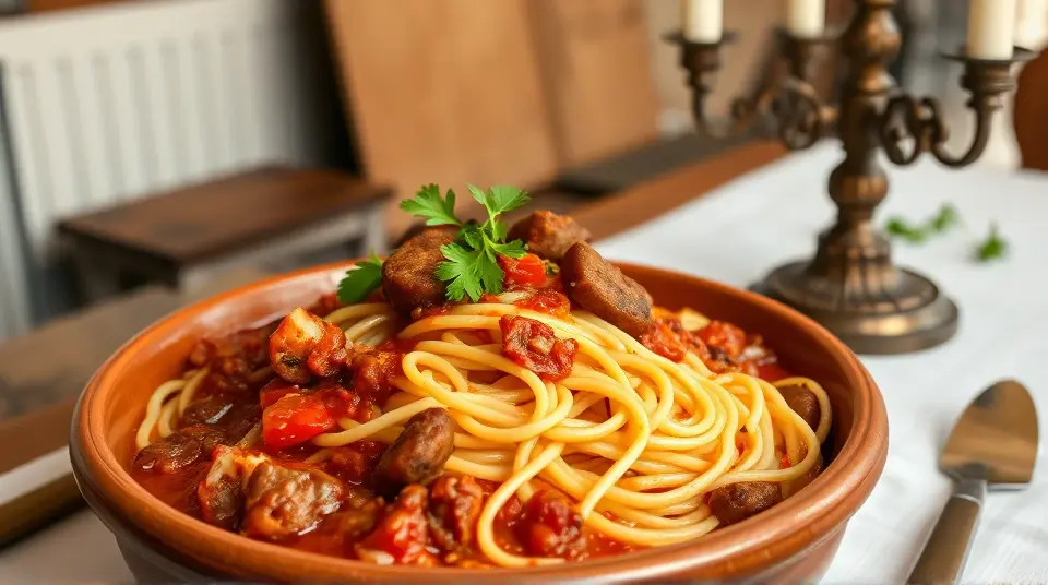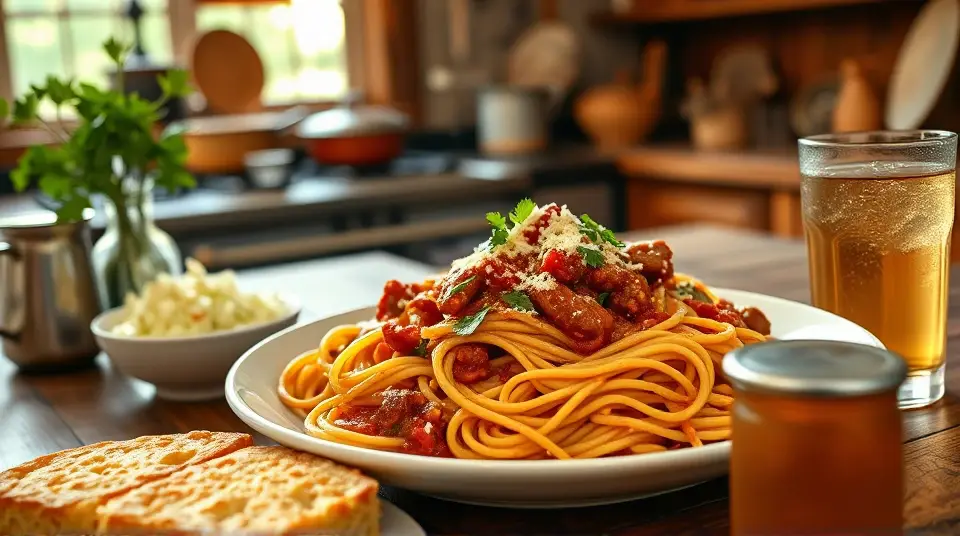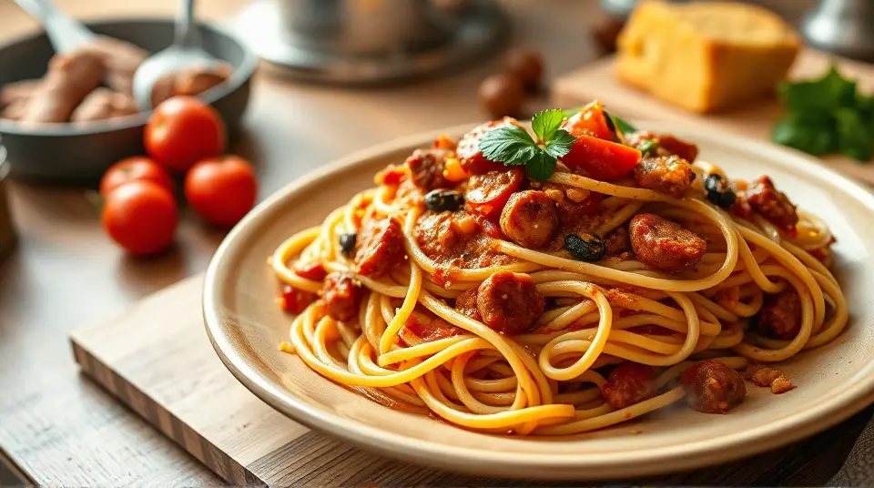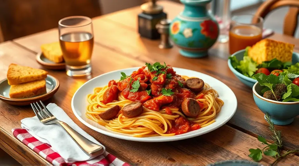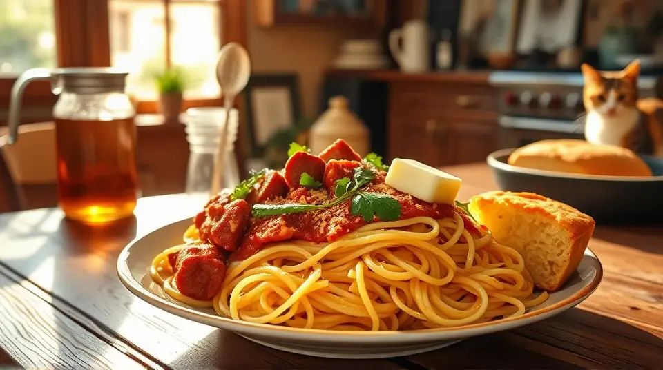 # Southern Style Tallerine 🥘✨ This Southern Style Tallerine is a delightful twist on the classic Italian dish. It's a hearty fusion featuring spaghetti simmered in a rich, spicy tomato sauce with a Southern flair. The addition of smoky sausage, bell peppers, and a hint of sweetness makes this dish a real crowd-pleaser! Perfect for family dinners or potlucks, serve it with a side of cornbread and a refreshing salad for a complete meal. 🌽🥗 ## Ingredients ### For the pasta - 8 oz spaghetti (or your favorite pasta) - 1 tablespoon olive oil - 1 medium onion, diced - 1 bell pepper (any color), diced - 3 cloves garlic, minced - 12 oz smoked sausage (like kielbasa or andouille), sliced - 1 can (14 oz) diced tomatoes (with juices) - 1 cup chicken broth - 1 tablespoon sugar (to balance acidity) - 1 teaspoon paprika - 1 teaspoon cayenne pepper (adjust to taste) - Salt and pepper, to taste - Fresh parsley, chopped (for garnish) ## Instructions 1. **Cook the pasta**: In a large pot of boiling salted water, cook the spaghetti as per package instructions until al dente. Drain and set aside. 2. **Sauté the vegetables**: In the same pot, heat the olive oil over medium heat. Add the onion and bell pepper, and sauté until softened, about 5 minutes. > 👩🍳 Adding a pinch of salt while sautéing helps draw out moisture from the veggies, enhancing their flavor. 3. **Add the sausage and garlic**: Stir in the sliced sausage and minced garlic, cooking for another 3-4 minutes until the sausage is browned and the garlic is fragrant. 4. **Make the sauce**: Pour in the diced tomatoes (with juices), chicken broth, sugar, paprika, and cayenne pepper. Season with salt and pepper. Bring the mixture to a gentle simmer for about 10-15 minutes, allowing the flavors to meld. 5. **Combine pasta and sauce**: Add the cooked spaghetti to the sauce, tossing to combine. Continue cooking for another 2-3 minutes, allowing the pasta to soak up some of the sauce. 6. **Serve**: Garnish with freshly chopped parsley and enjoy hot! > 🧂 For added depth of flavor, you can consider a splash of Worcestershire sauce or hot sauce for an extra kick! ## Variations - **Vegetarian**: Substitute the sausage with hearty vegetables like mushrooms and zucchini, or use plant-based sausage for a similar texture. 🌱 - **Cheesy**: Sprinkle some shredded cheddar or mozzarella on top and broil for a few minutes until melted and bubbly for a comfort-food twist. 🧀 - **One-pot meal**: Skip cooking the pasta separately. Add uncooked spaghetti directly to the sauce and double the chicken broth, then cover and cook until the pasta is tender. Enjoy this Southern Style Tallerine with a side of your favorite cornbread or garlic bread for the perfect meal! 🍞🧄Images