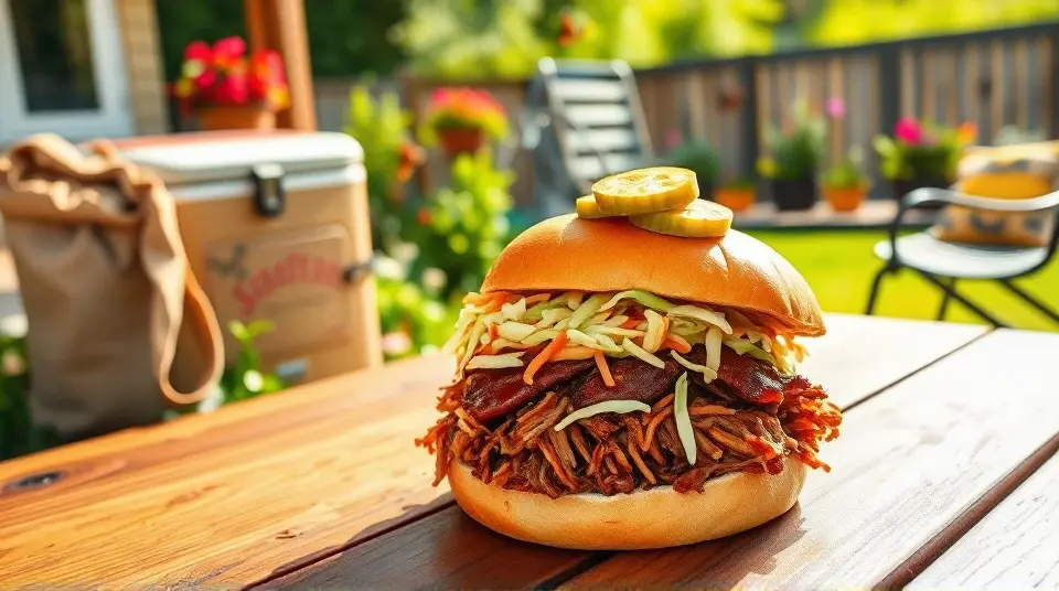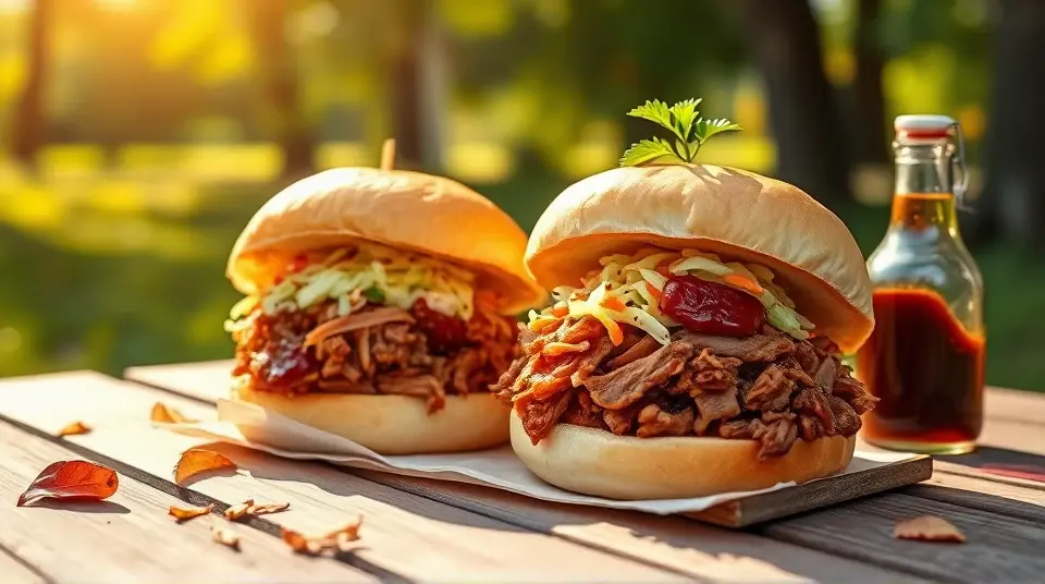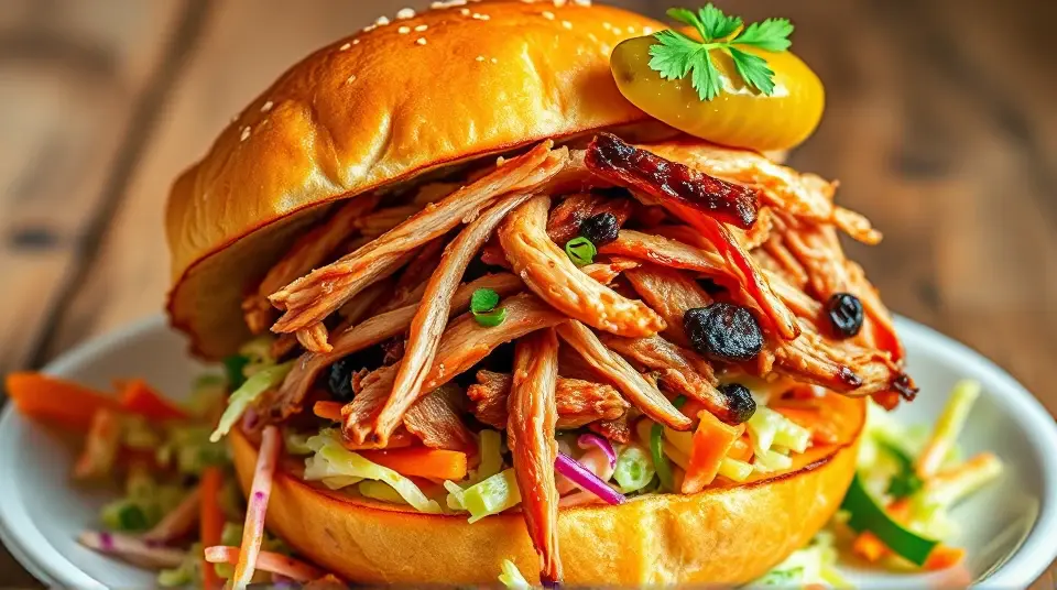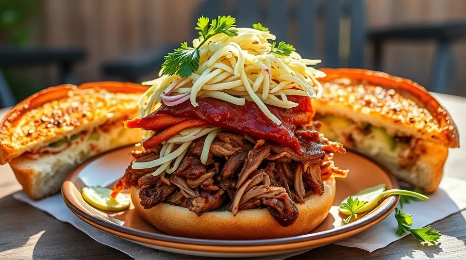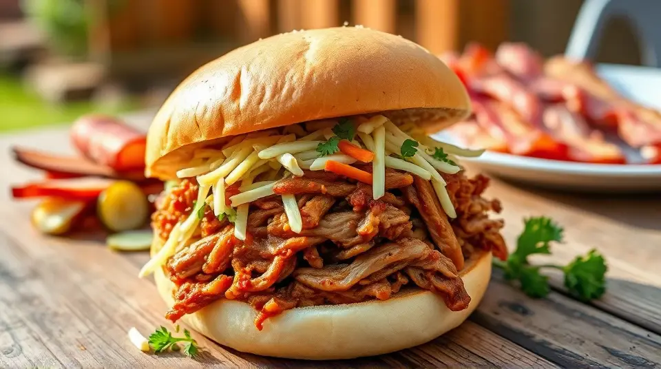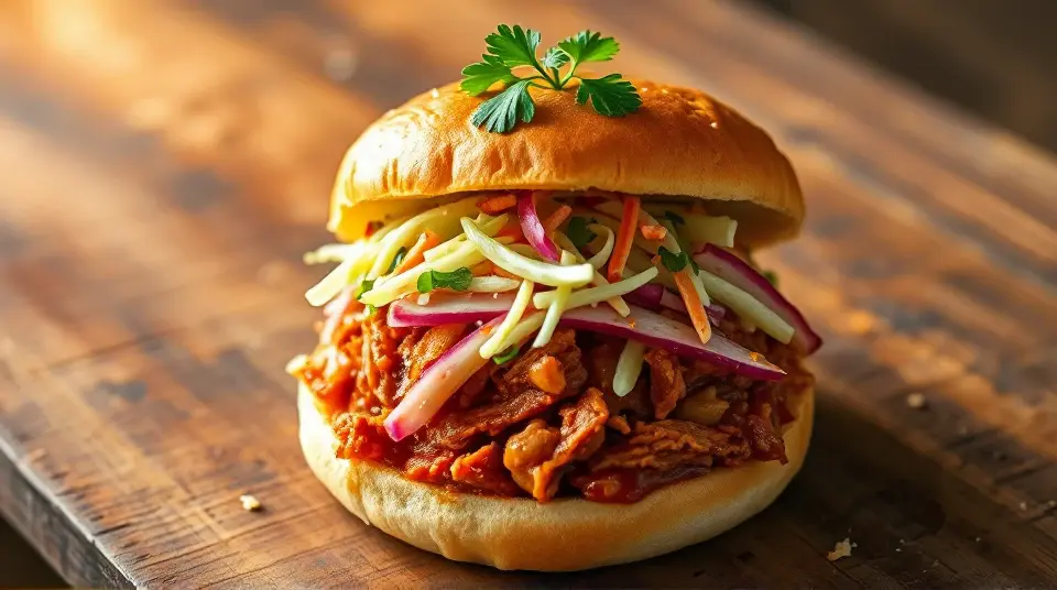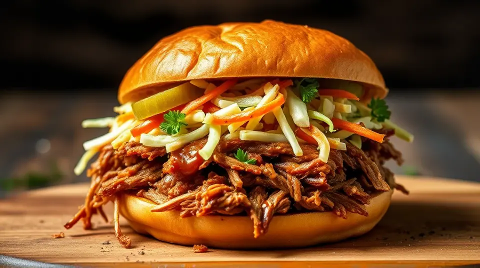 # Smoky Pulled Pork and Crunchy Coleslaw Sandwiches ๐๐ This mouthwatering recipe combines tender, smoky pulled pork with crisp and tangy coleslaw, all nestled between two fluffy buns. Perfect for a casual gathering or a cozy family dinner, these sandwiches are bursting with flavor and texture. Top them off with your favorite barbecue sauce for an extra kick! ## Ingredients ### For the pulled pork - 3-4 lbs pork shoulder (also known as pork butt) - 1 tablespoon smoked paprika - 2 teaspoons garlic powder - 2 teaspoons onion powder - 1 teaspoon cayenne pepper (adjust for spice level) - 1 tablespoon brown sugar - 1 tablespoon salt - 1 teaspoon black pepper - 1 cup apple cider vinegar - 1 cup barbecue sauce (plus more for serving) ### For the coleslaw - 4 cups green cabbage, shredded - 1 cup carrots, grated - 1/2 cup mayonnaise - 2 tablespoons apple cider vinegar - 1 tablespoon honey - Salt and pepper to taste - Optional: 1/4 cup chopped fresh parsley for garnish ### For assembly - Burger buns (soft, preferably brioche or whole wheat) - Pickles (optional) ## Instructions ### For the pulled pork 1. **Prepare the spice rub**: In a small bowl, combine smoked paprika, garlic powder, onion powder, cayenne pepper, brown sugar, salt, and black pepper. 2. **Season the pork**: Rub the spice mixture all over the pork shoulder, ensuring it's well coated. 3. **Cook the pork**: Place the pork in a slow cooker. Pour in the apple cider vinegar and half of the barbecue sauce over the top. Cover and cook on low for 8-10 hours, or until the meat is fork-tender. > ๐ฅ If you're short on time, you can cook the pork in an Instant Pot on high pressure for about 60 minutes, followed by a natural release. 4. **Shred the pork**: Once cooked, remove the pork from the cooker and let it rest for a few minutes. Shred the meat using two forks, discarding excessive fat. Mix in the remaining barbecue sauce. ### For the coleslaw 5. **Combine the veggies**: In a large bowl, mix together the shredded cabbage and grated carrots. 6. **Make the dressing**: In a separate bowl, whisk together mayonnaise, apple cider vinegar, honey, salt, and pepper until smooth. 7. **Dress the slaw**: Pour the dressing over the cabbage mixture and toss until everything is well coated. Adjust seasoning if necessary. > ๐ฅ For an extra crunch, consider adding some chopped apples or nuts to the coleslaw! ### For assembly 8. **Build the sandwich**: Toast the burger buns lightly. Start with a generous scoop of pulled pork on the bottom half, followed by a heaping tablespoon of coleslaw. 9. **Top it off**: Add pickles if desired, and cap it with the top bun. 10. **Serve & enjoy**: Serve immediately while warm, alongside your favorite sides! ## Variations - **Spicy version**: Add diced jalapeรฑos to the coleslaw for a fiery kick! ๐ถ๏ธ - **Southern twist**: Use a vinegar-based coleslaw instead of a creamy one for a classic Southern flair. - **Tropicana Style**: Add tropical fruits like pineapple or mango to the coleslaw for a refreshing, tropical twist! - **Low-carb**: Swap the burger buns for lettuce wraps to enjoy a lighter variation without the carbs. These Smoky Pulled Pork and Crunchy Coleslaw Sandwiches are sure to be a crowd-pleaser and perfect for any occasion. Enjoy the delicious combination of textures and flavors! ๐ด๐Images