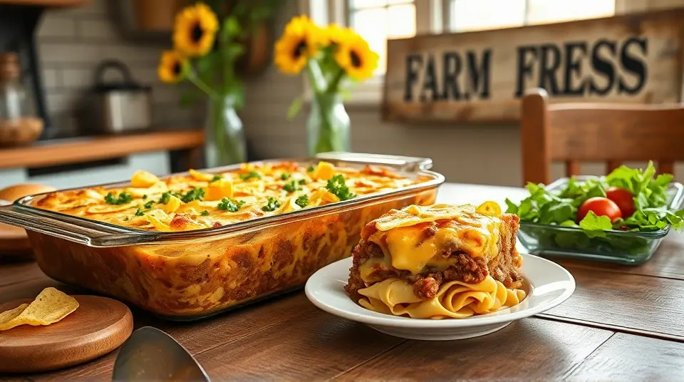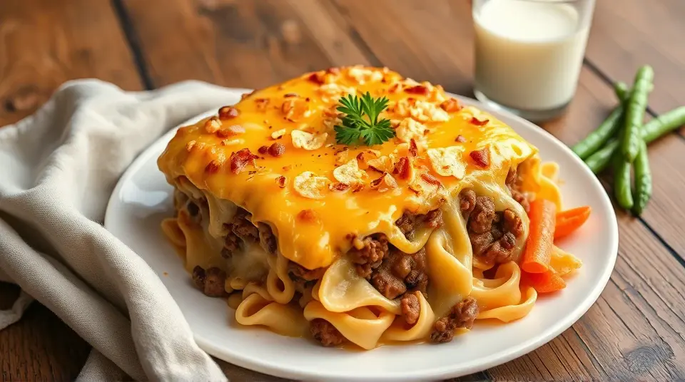 # Ground Beef Casserole with Cheddar and Onion 🍽️🧀 This hearty and comforting casserole is perfect for a cozy dinner at home! It combines ground beef, melted cheddar cheese, and caramelized onions to create a satisfying dish that's sure to please everyone. Plus, it’s easy to make, making it an ideal choice for busy weeknights or feeding a crowd! ## Ingredients ### For the Casserole - 1 ½ pounds ground beef - 2 large onions, finely sliced - 3 cloves garlic, minced - 1 can (15 oz) diced tomatoes, drained - 1 can (10 oz) cream of mushroom soup - 1 teaspoon Worcestershire sauce - 1 teaspoon dried oregano - Salt and pepper to taste - 2 cups cooked egg noodles (or pasta of your choice) - 2 cups shredded sharp cheddar cheese ### For the Topping - 1 cup crushed potato chips (optional, for crunch!) - Fresh parsley, chopped (optional, for garnish) ## Instructions 1. **Preheat the Oven**: Preheat your oven to 350°F (175°C). 2. **Cook the Beef**: In a large skillet, brown the ground beef over medium heat until fully cooked. Drain any excess fat. > 🍔 Ensuring the beef is well-browned adds depth of flavor to your casserole! 3. **Sauté Onions and Garlic**: In the same skillet, add the sliced onions and cook until they’re caramelized (about 10-12 minutes). Add minced garlic and cook for an additional 1-2 minutes. 4. **Combine Ingredients**: In a large mixing bowl, combine the cooked beef, caramelized onions, diced tomatoes, cream of mushroom soup, Worcestershire sauce, oregano, and cooked noodles. Season with salt and pepper to taste. 5. **Assemble the Casserole**: Transfer the mixture to a greased 9x13 inch baking dish and spread it evenly. Top with 1 ½ cups of shredded cheddar cheese. 6. **Bake**: Cover with aluminum foil and bake in the preheated oven for 25 minutes. Remove the foil and sprinkle the remaining cheese on top. Bake uncovered for another 10-15 minutes, or until the cheese is bubbly and golden. > 🔔 If you like a bit of crunch, sprinkle crushed potato chips over the top during the last 5 minutes of baking! 7. **Garnish and Serve**: Once out of the oven, let it rest for a few minutes. Garnish with fresh parsley before serving. ## Variations - **Spicy Kick**: Add a diced jalapeño or sprinkle some red pepper flakes into the beef mixture for extra heat! 🌶️ - **Vegetarian Option**: Replace ground beef with lentils or a mix of your favorite vegetables. You might also want to incorporate some beans for protein! - **Cheese Lovers**: Mix in some mozzarella or pepper jack cheese for variety, or use flavored cream soups like cheddar cheese soup for more cheesiness. - **Low-Carb**: Swap out the noodles for sautéed zucchini or cauliflower rice for a lighter version. This Ground Beef Casserole with Cheddar and Onion is not only delicious but also versatile enough to fit your tastes and dietary needs. Enjoy a slice of comfort today! 🥘❤️Images