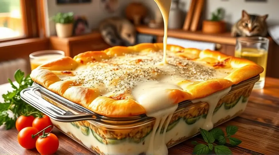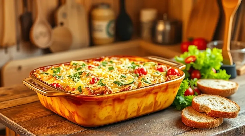 # Cheesy Chicken Zucchini Casserole 🍽️🥒 This comforting Cheesy Chicken Zucchini Casserole is a delightful blend of flavors and textures that's perfect for a cozy family dinner or a potluck gathering. Packed with tender chicken, fresh zucchini, and a gooey cheese topping, this dish is both nutritious and satisfying. It's a one-pan wonder that'll leave your guests wanting more! ## Ingredients ### For the casserole - 2 cups cooked chicken, shredded or diced - 3 medium zucchinis, sliced into half-moons - 1 cup cooked quinoa or rice (optional for added heartiness) - 1 cup cherry tomatoes, halved - 1 onion, finely chopped - 2 cloves garlic, minced - 1 cup shredded mozzarella cheese - 1/2 cup grated Parmesan cheese - 1 teaspoon Italian seasoning - Salt and pepper to taste - 2 tablespoons olive oil ### For the creamy sauce - 1 cup Greek yogurt or sour cream - 1/2 cup chicken broth - 1 tablespoon lemon juice - 1/2 teaspoon paprika - 1/4 teaspoon cayenne pepper (optional for a little heat) ## Instructions 1. Preheat your oven to 375°F (190°C). 2. In a large skillet, heat the olive oil over medium heat. Add the chopped onion and garlic, sauté until softened and fragrant, about 2-3 minutes. 3. Add the sliced zucchini and cherry tomatoes to the skillet. Season with Italian seasoning, salt, and pepper. Cook for an additional 5-7 minutes, until the zucchini is tender but still has a slight crunch. > 🥗 For extra texture, consider adding other colorful veggies like bell peppers or spinach. 4. In a mixing bowl, combine the cooked chicken, quinoa (if using), and the sautéed veggie mixture. Stir in the mozzarella cheese, leaving a bit of cheese for the topping later. 5. In another bowl, whisk together the Greek yogurt, chicken broth, lemon juice, paprika, and cayenne pepper. Pour this creamy sauce over the chicken and vegetable mixture and stir well until everything is well combined. 6. Transfer the mixture into a greased 9x13 inch baking dish. Sprinkle the remaining mozzarella and Parmesan cheese evenly over the top. 7. Bake in the preheated oven for 25-30 minutes or until the cheese is bubbly and golden brown. > 🧀 If you like a crunchier topping, pop it under the broiler for the last few minutes of cooking. Just watch it closely to avoid burning! 8. Once done, let the casserole cool for a few minutes before serving. This dish pairs perfectly with a fresh side salad. ## Variations - **Low-carb**: Omit the quinoa or rice and add more low-carb vegetables like cauliflower or bell peppers. - **Spicy**: Mix in some diced jalapeños or a dash of hot sauce for an extra kick. - **Herbed Delight**: Add fresh herbs like basil or parsley for a bright finish. - **Make-Ahead**: Assemble the casserole a day in advance and keep it covered in the fridge until ready to bake. Just add a few extra minutes to the baking time. Enjoy your cheesy goodness and let this Chicken Zucchini Casserole become a new family favorite! 🥳🥙Images